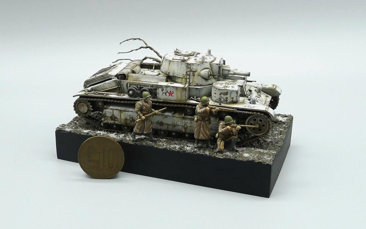 안녕하세요 이제 여름인거 같습니다~! 전에 제작기에 올렸었던 트럼페터 T-28 전차를 완성하였습니다. 동계위장이라 치핑 용액을 이용하여 이중 치핑을 해 주었고 흰색 위장과 대비되게 베이스를 어둡게하여 배치해 보았습니다. 죽은 나무는 철사를 꼬아 에폭시퍼티로 살을 붙여 표연하였고 약간의 눈 표현재로 겨울임을 연출했습니다. 인형은 즈베즈다 동계코트를 입은걸 가져다 사용했구요. 여담으로 흰색계열이 유난히 사진찍으니 중간톤이 많이 날아가 버리네요. 실 작품보다 사진이 드라이하게 나와서 무척 아쉽습니다~! 봐주셔서 감사합니다.