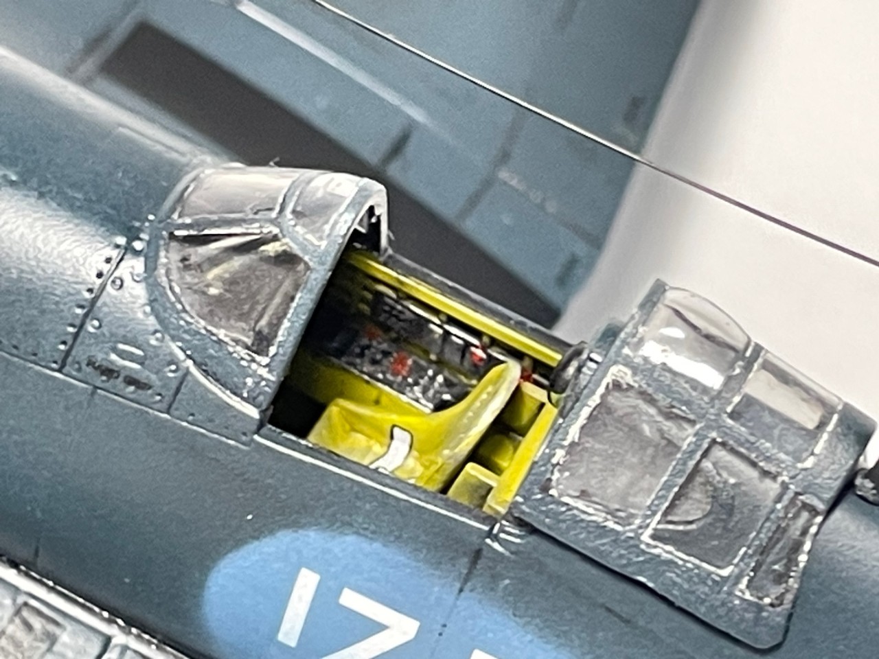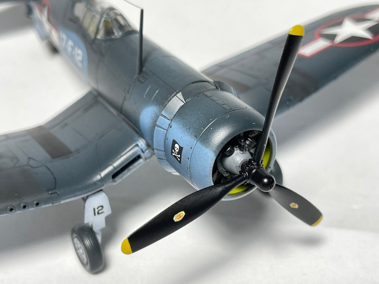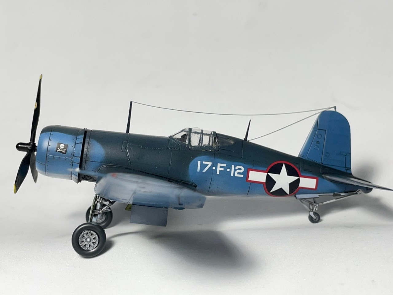 졸리로저스는 거의 프로토타잎부터 운용을 했던 모양입니다. 사실 이 기체 이전에 캐노피 천정부가 볼록하지 않은 형태의 캐노피가 장착된 기체를 창단시 운영을 했었는데, 이는 실제 항모는 타지 않고 창단 후 훈련하는 용도로 사용되었던거 같습니다. 본 기체부터 USS 벙커힐에 탑재되어 실전에 투입되고 착함문제로 인해 곧 물방울 모양의 캐노피로 개량된 F4U-1A 형으로 교체가 됩니다.