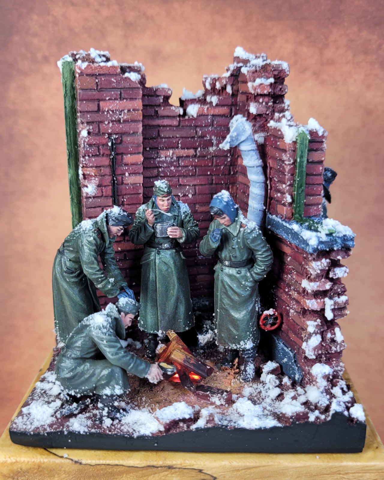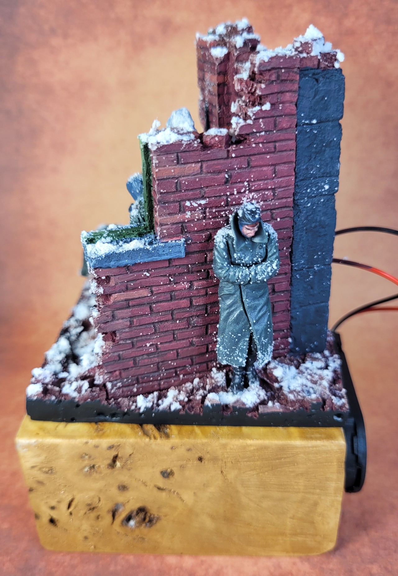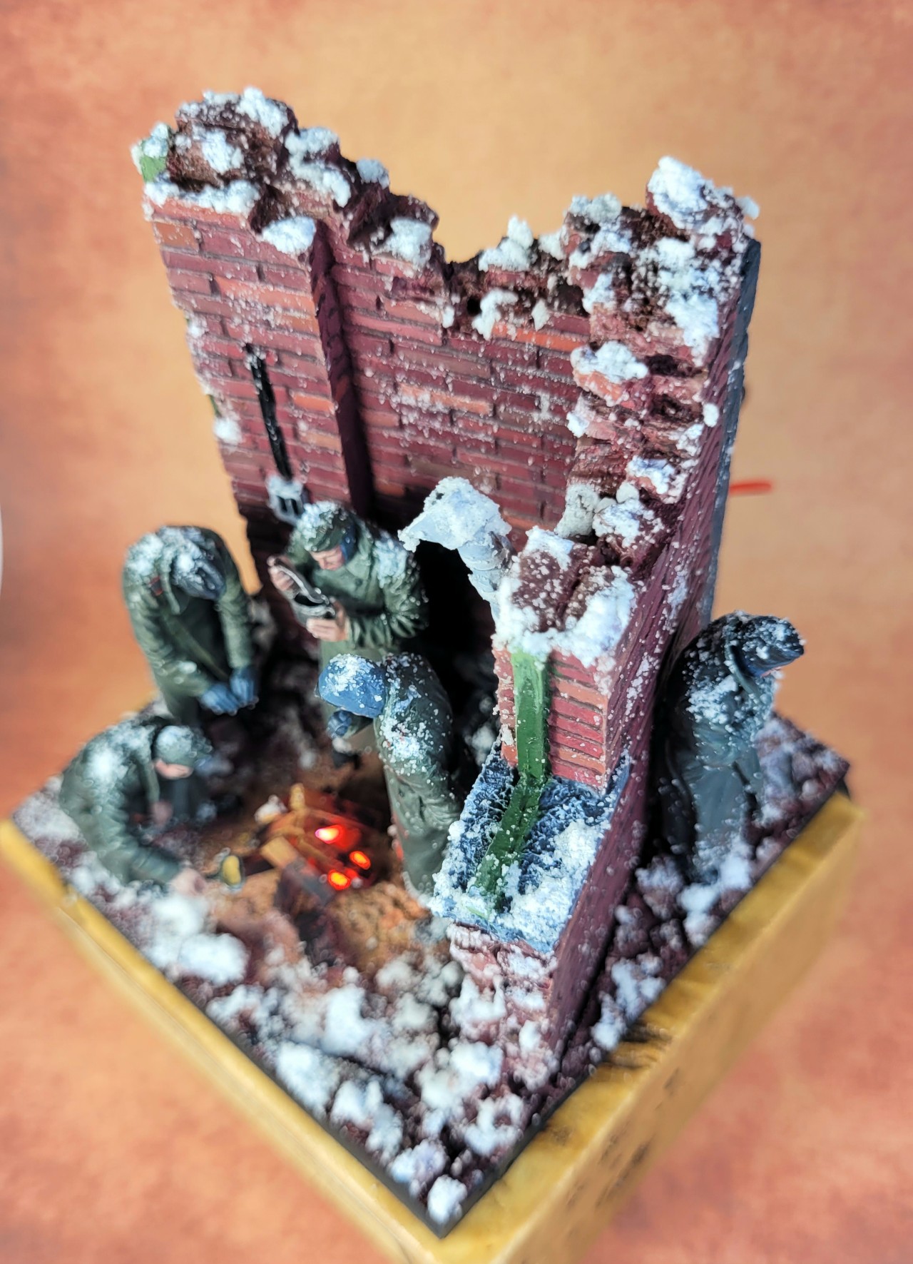 오랫만에 포스팅 합니다. 1/35 독일군으로 간단한 비넷을 만들어 보았습니다. 독일군들이 눈오는 날 건물 폐허에서 모닥불로 추위를 피하면서 식사를 하는 장면을 연출해 보았습니다.(그 와중에 왕따 당한 군인도 1명 있음 ㅋㅋ) LED로 모닥불을 표현했는데 나름 효과가 있는 것 같습니다. 핸드폰 사진이라 화질이 썩 좋지는 못합니다. 감사합니다.