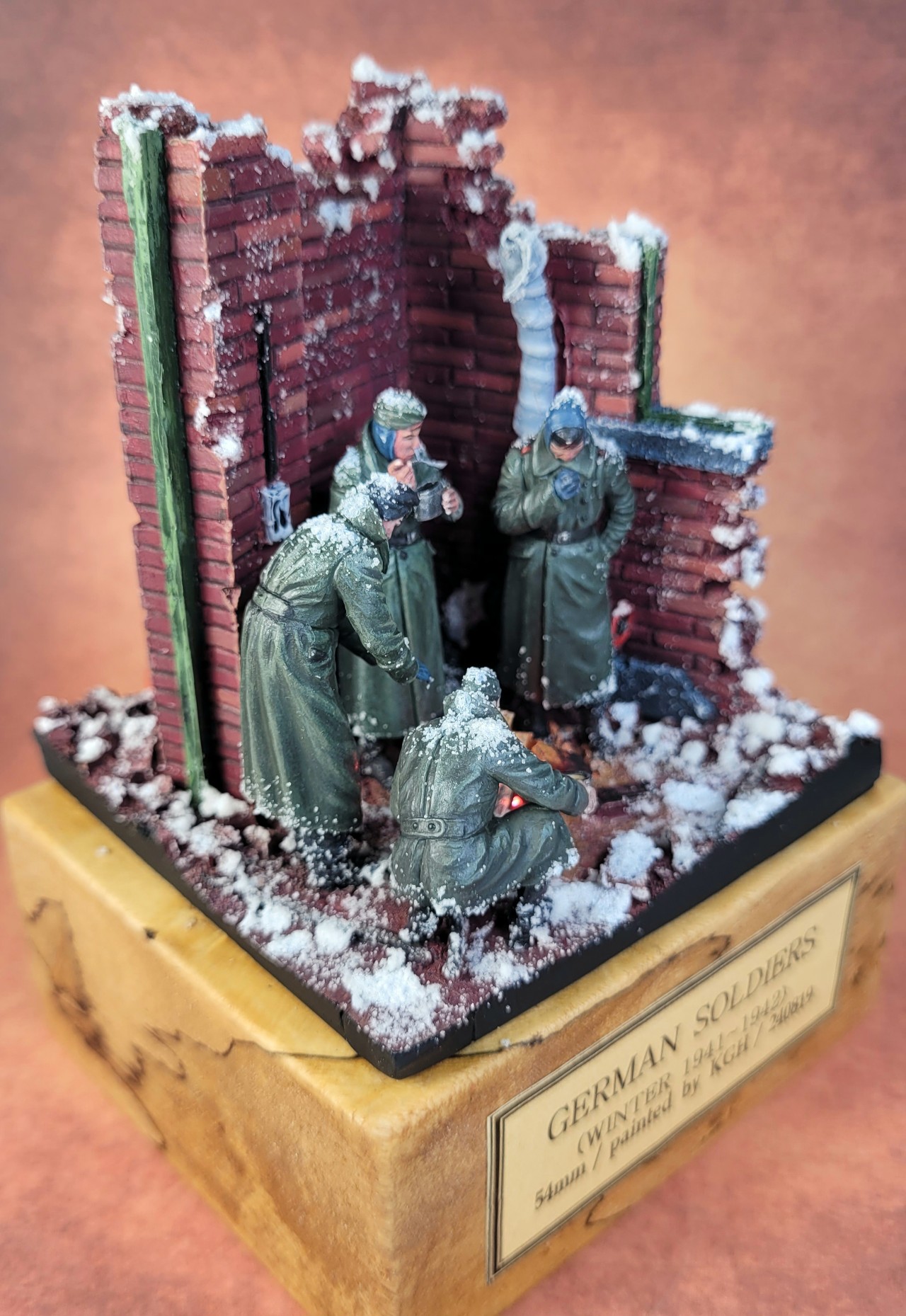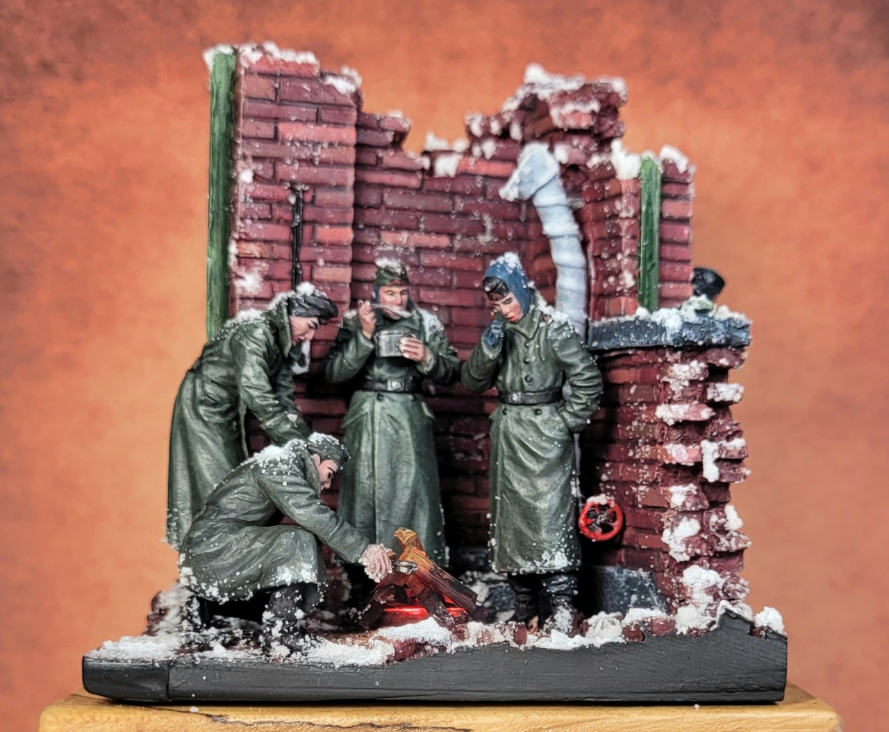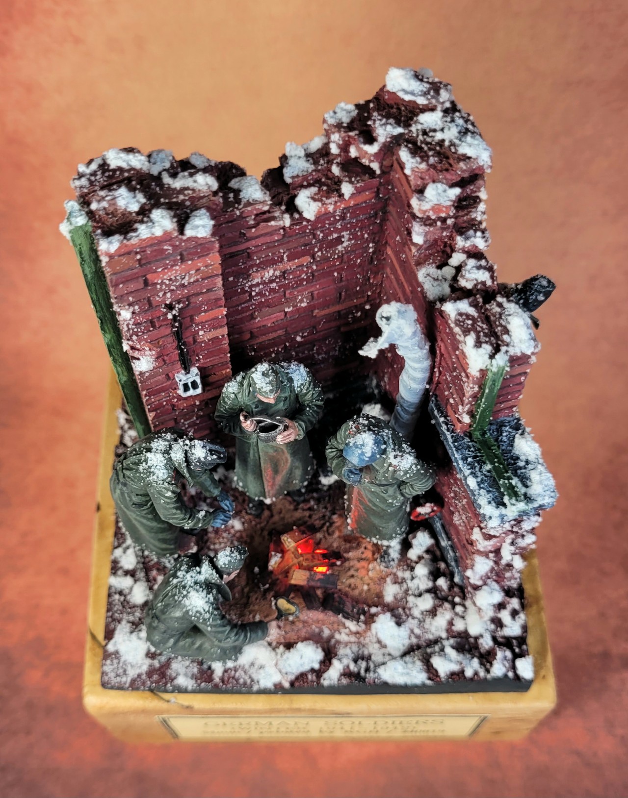 오랫만에 포스팅 합니다. 1/35 독일군으로 간단한 비넷을 만들어 보았습니다. 독일군들이 눈오는 날 건물 폐허에서 모닥불로 추위를 피하면서 식사를 하는 장면을 연출해 보았습니다.(그 와중에 왕따 당한 군인도 1명 있음 ㅋㅋ) LED로 모닥불을 표현했는데 나름 효과가 있는 것 같습니다. 핸드폰 사진이라 화질이 썩 좋지는 못합니다. 감사합니다.