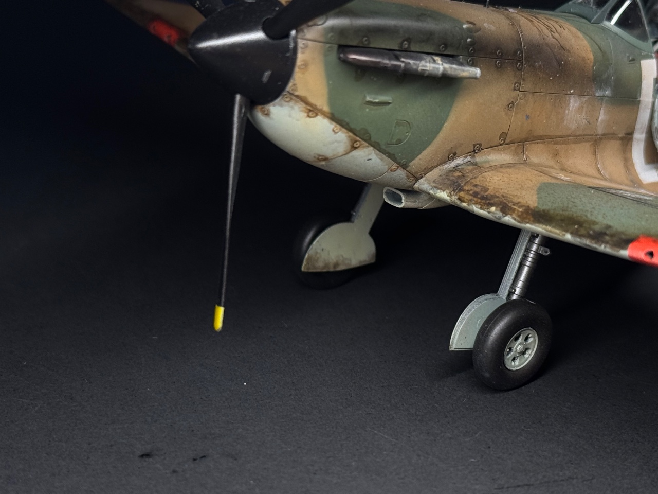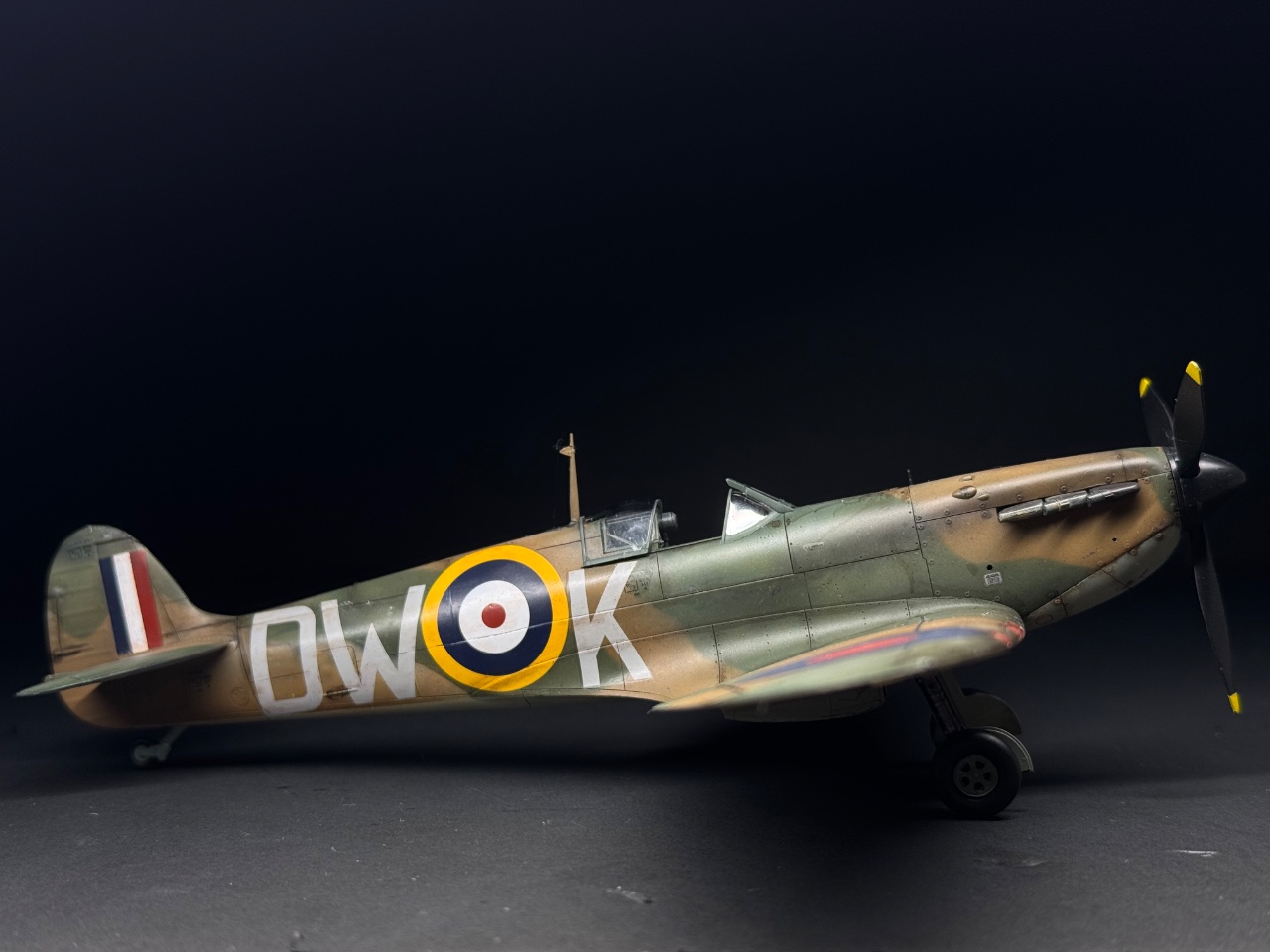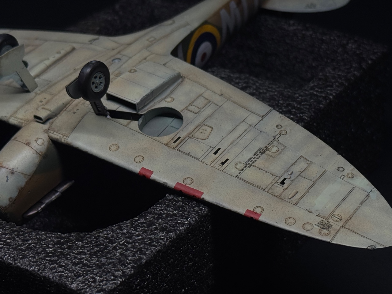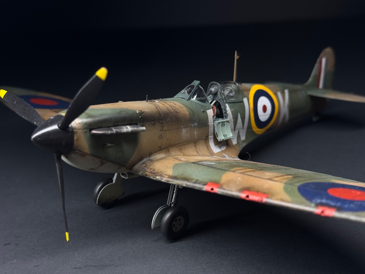 슈퍼마린스핏파이어는 참 좋아하는 기체인데요. 에듀어드가 훌륭하다 생각했는데 타미야도 작업성이 참 좋아서 감탄하며 만들었습니다. 페인트까짐은 최대한 자제하고 구글링하다 찾은 이미지로 기름떡이된 기체를 표현하고자 했습니다. 기체 하부는 적당한 웨더링만 했어요.