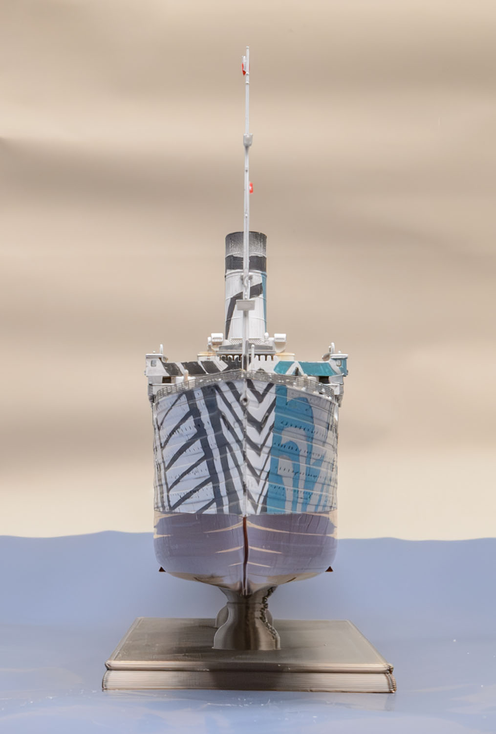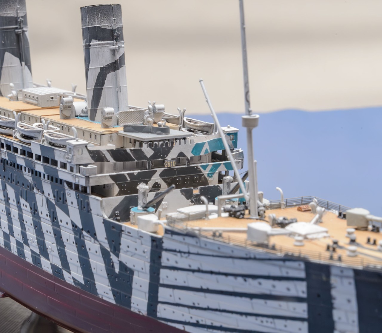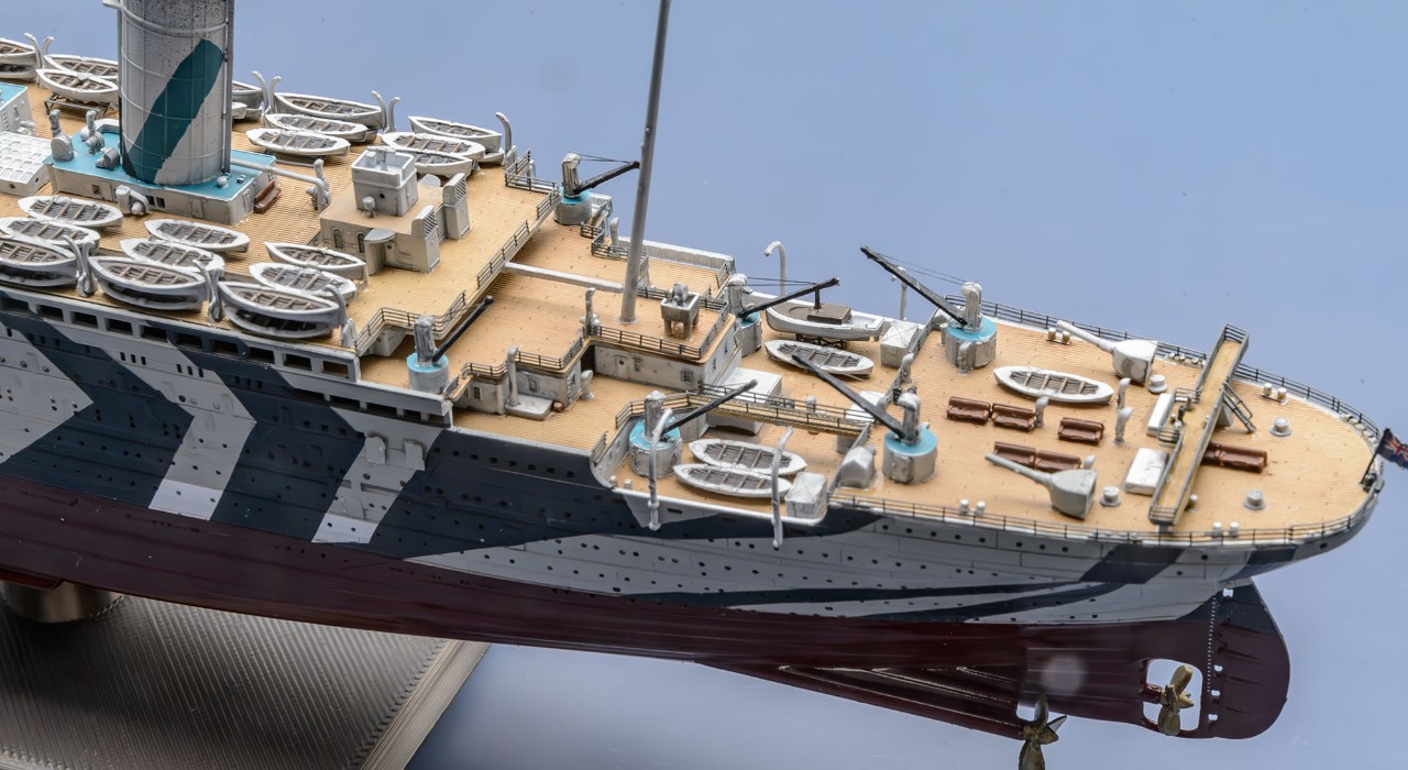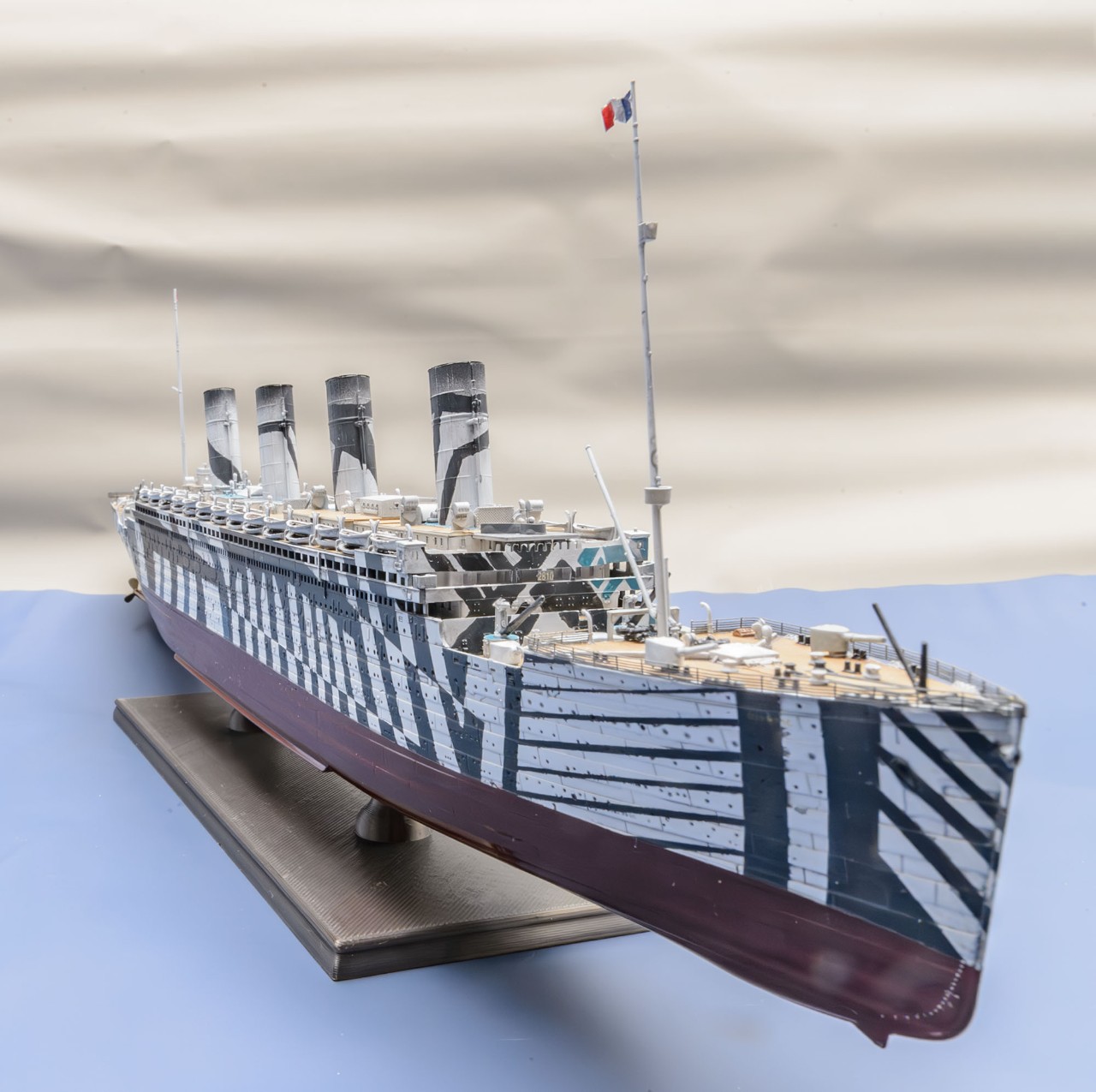 1차 세계대전이 격화되면서 RMS Olympic 도 영국 해군에 징발되어 무장수송함 HMT Olympic 으로서 병력 수송 임무를 맡았는데, 위장무늬인 다즐링 패턴은 두 종류가 있었습니다. 제가 만든 다즐링 패턴은 유보트에 충각 공격을 했던 시기의 모습입니다.