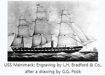 메리맥(Merrimac)은 전쟁 직전 북군이 버지니아 항을 급하게 포기(버지니아가 남부연합으로 순식간에 넘어가면서)하면서 소개작전의 일환으로 불태워 Hull과 엔진만 남은 증기목선에 거북선처럼 철갑을 두르고 반잠수정 형태로 만든 전투함(다시 봐도 거북선인 듯). 남북전쟁 초기 맹활약.