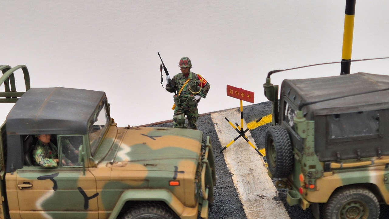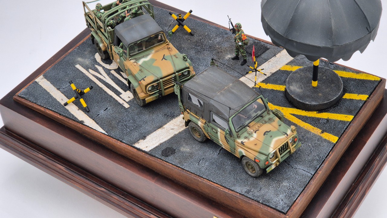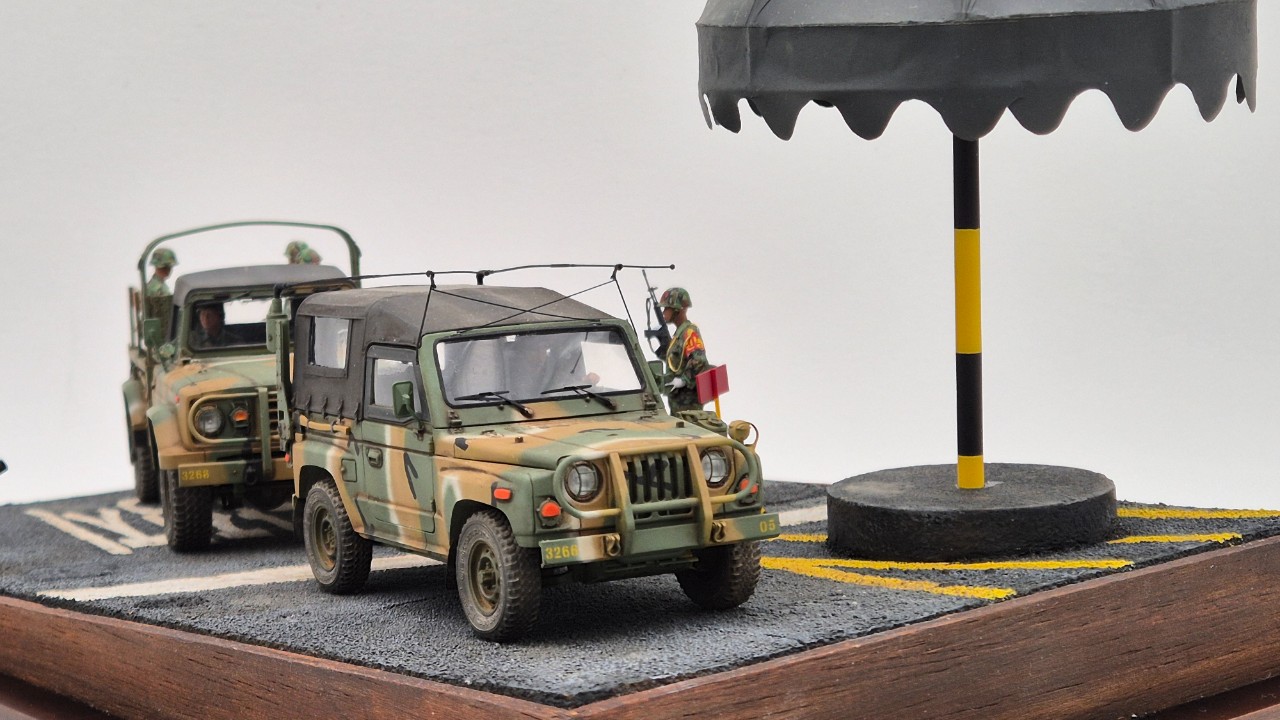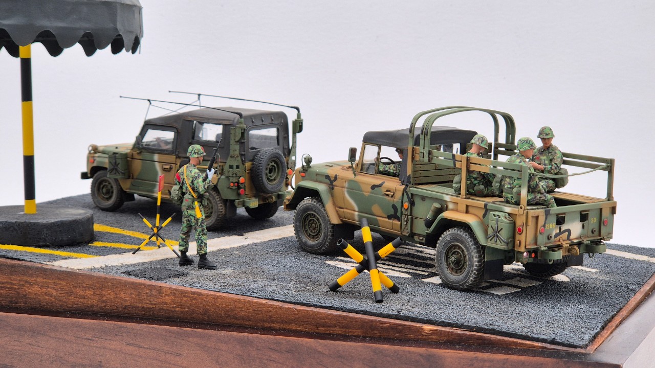 위병소도 만들고 싶었고 대형 바리케이트 등도 만들어 넣고 싶었으나 디오라마 사이즈가 너무 커지는게 부담스러워 파라솔과 도로부분만 제작했습니다.