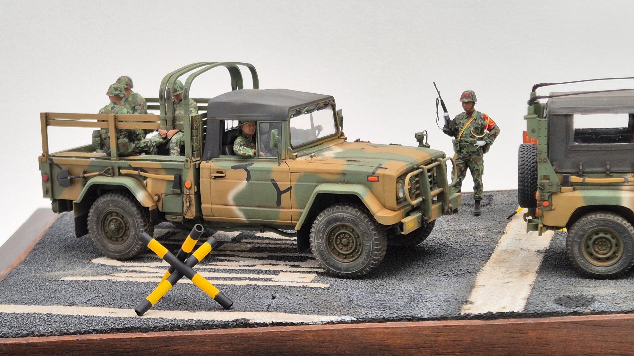 K311에 탑승하고 있는 인형 5마리와 헌병은 H3 제품을 사용했습니다. 위장무늬는 크로스델타의 데칼을 사용했는데 작업이 쉽지는 않았습니다. ^^; 차량에 탑승하고 있는 인형은 그대로 사용했으며 헌병 인형은 견장 및 견장줄등을 만들어줬습니다. 헌병으로 근무설때 턱끈, 방독면은 착용하지 않고 K2또한 뒤로 메고 근무를 섰었는데 인형을 개조할수가 없어 그냥 사용했습니다 ^^;