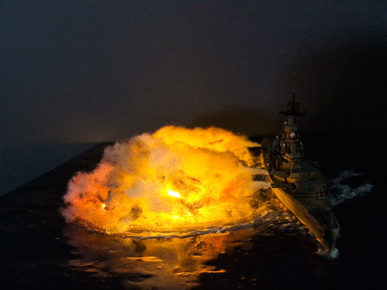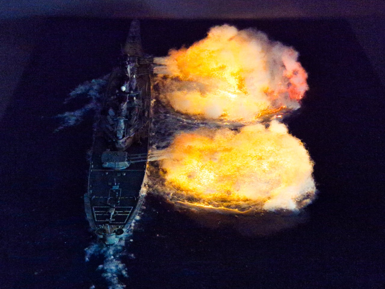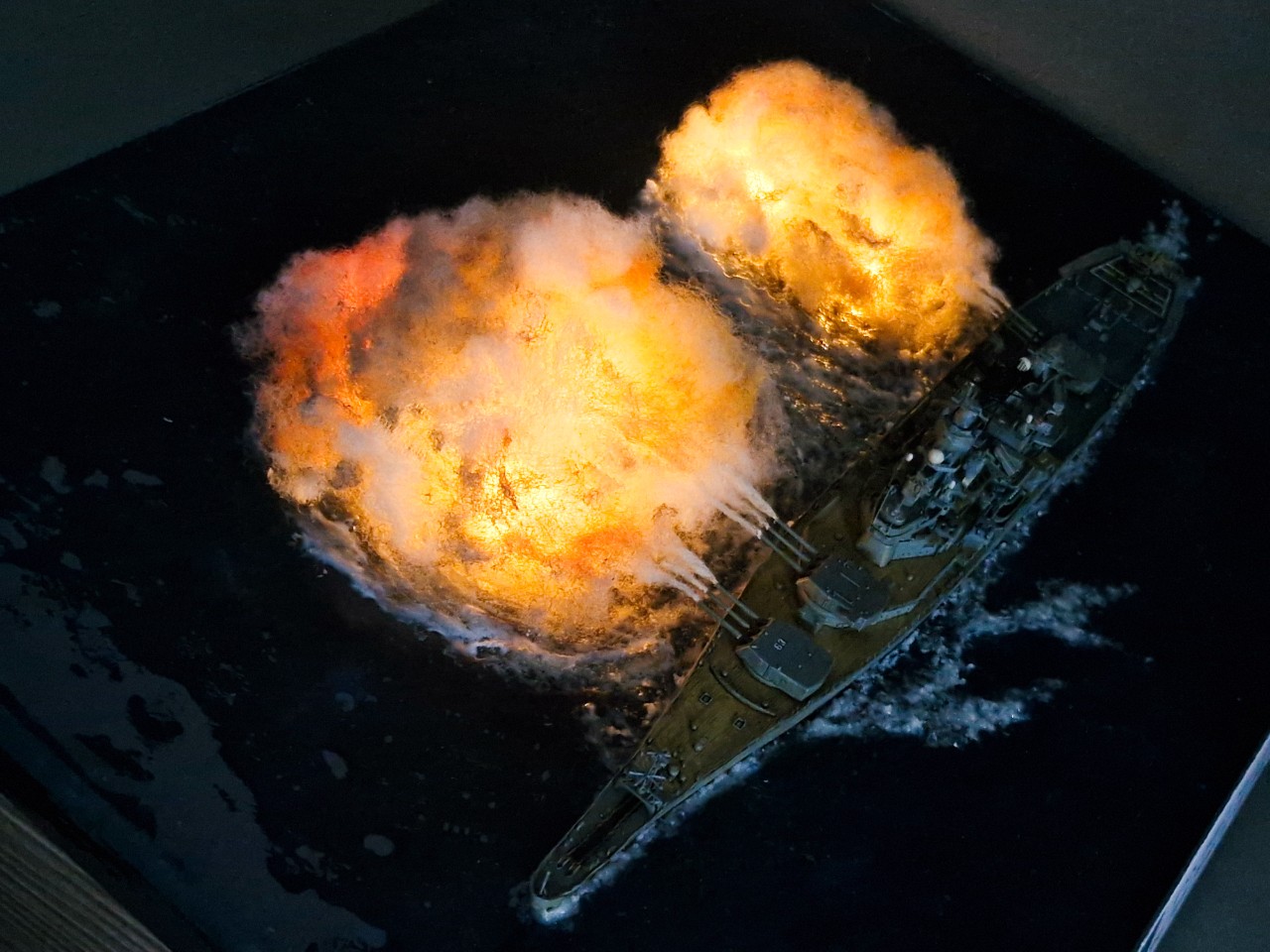 실사를 확대해 보면 사진이 찍힌 타이밍 상 1번주포와 2번주포는 좌우 포신만 연기가 있고, 3번주포는 우측 포신만 연기가 찍혔어요.