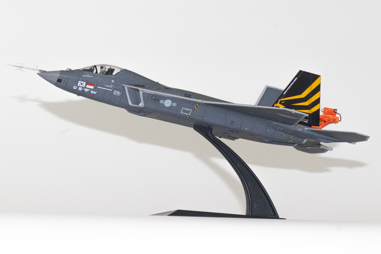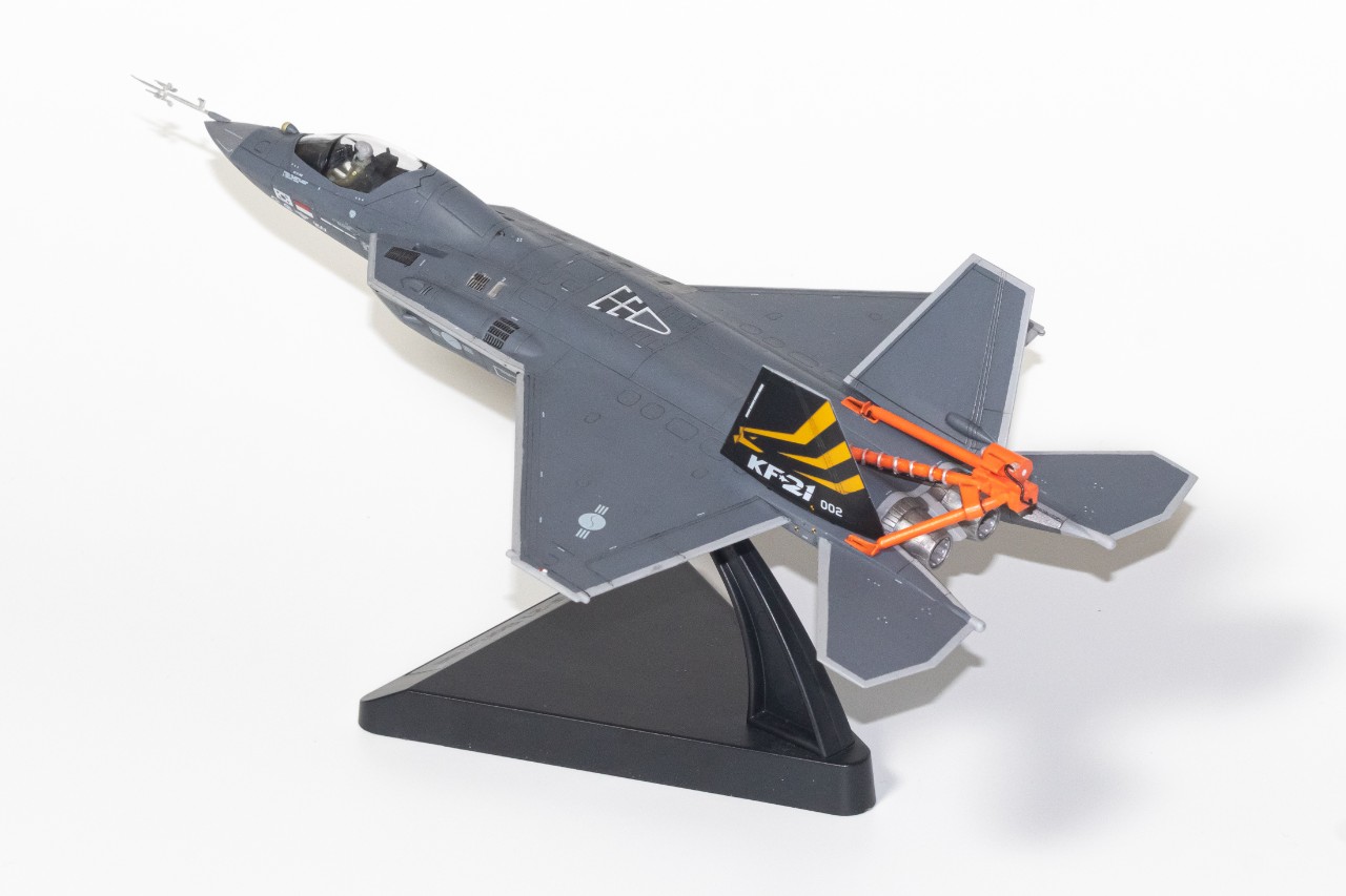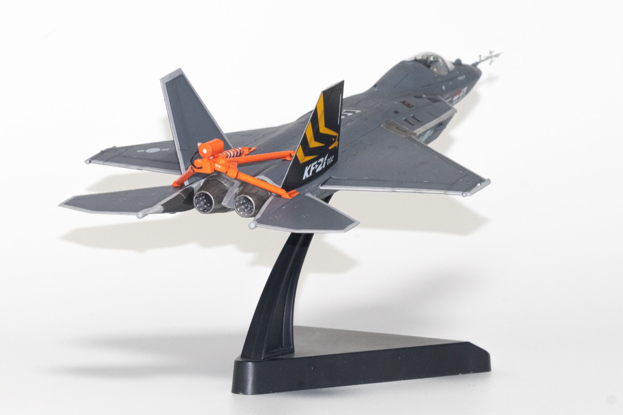 한창 비행시험중인 KF-21입니다. 고받음각 시험비행 때최초로 공개된 스핀회복장치를 달고 있는 KF-21로 제작해봤습니다. 따로 시중에 나와있는건 없어서, 프라봉과 프라판으로 간단히 자작한 후 도색해주었는데 생각보다 모양이 꽤나 나와주었습니다. 받침대는 원래 있는걸 사용해주었고, 하비페어 한정판 키트에 들어있는 데칼과 파일럿을 사용해주었습니다. 붓도색입니다.