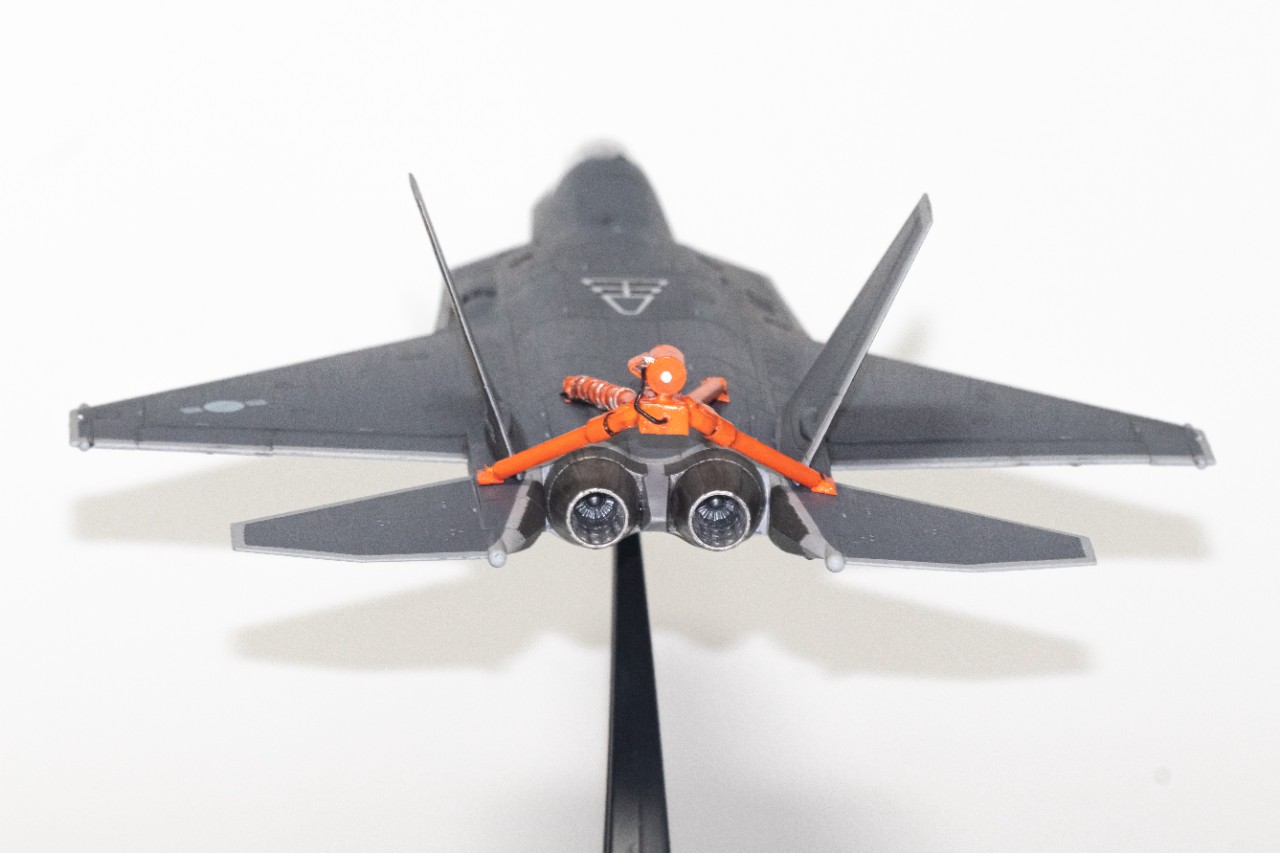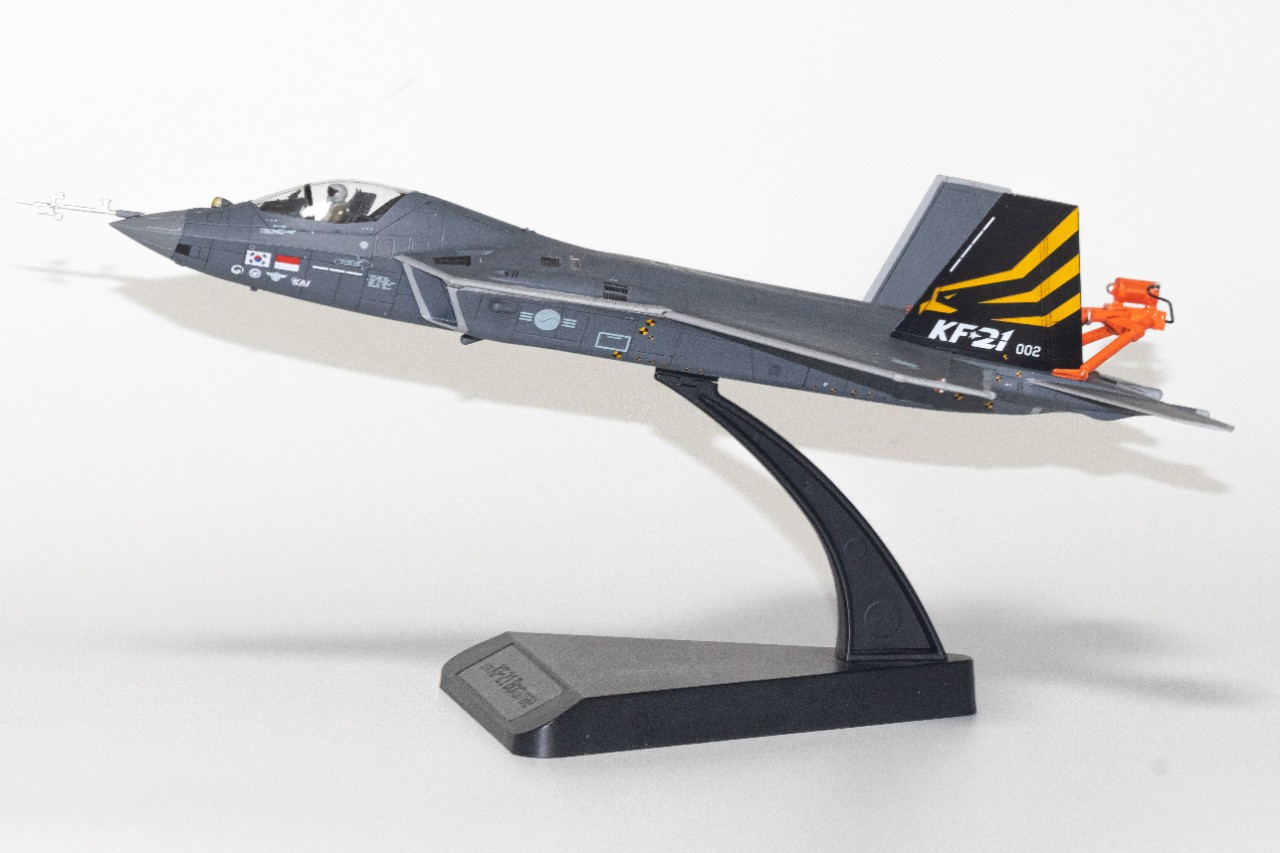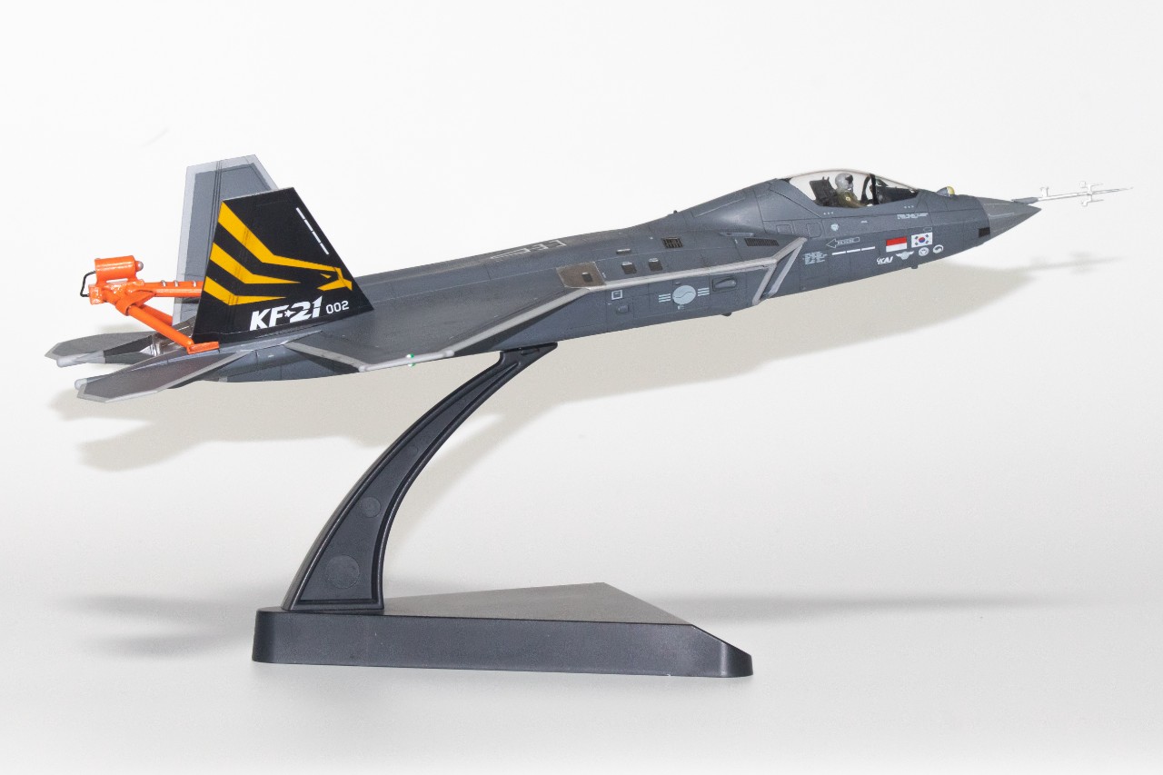 한창 비행시험중인 KF-21입니다. 고받음각 시험비행 때최초로 공개된 스핀회복장치를 달고 있는 KF-21로 제작해봤습니다. 따로 시중에 나와있는건 없어서, 프라봉과 프라판으로 간단히 자작한 후 도색해주었는데 생각보다 모양이 꽤나 나와주었습니다. 받침대는 원래 있는걸 사용해주었고, 하비페어 한정판 키트에 들어있는 데칼과 파일럿을 사용해주었습니다. 붓도색입니다.