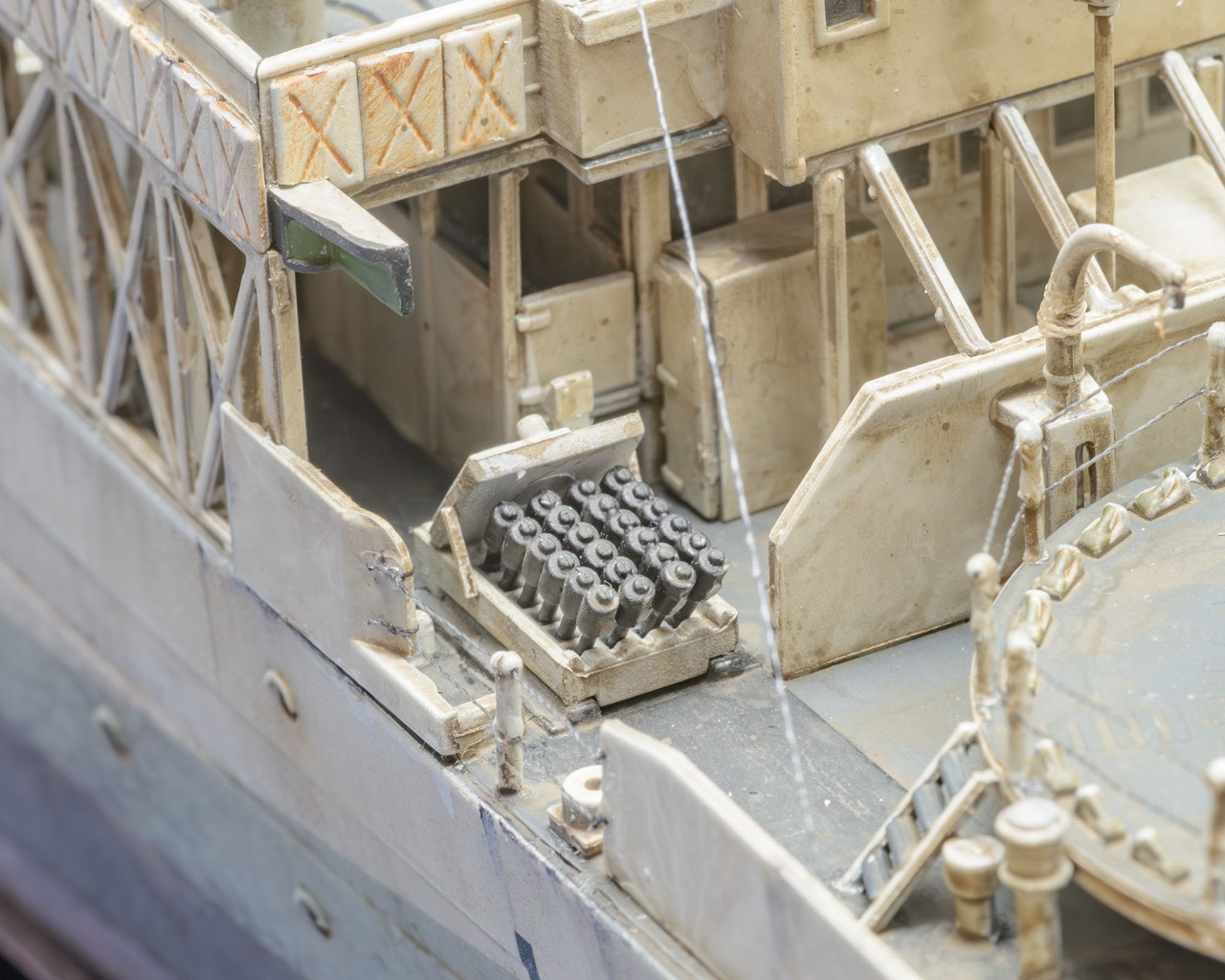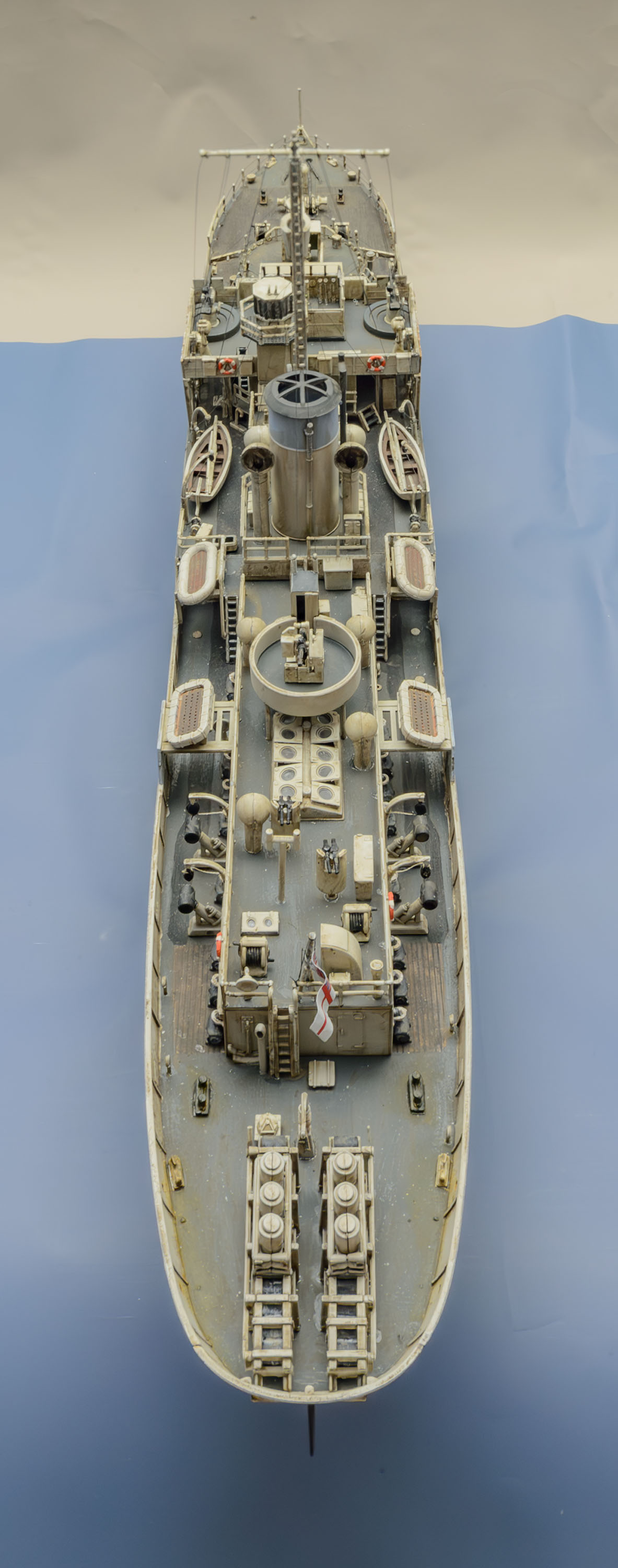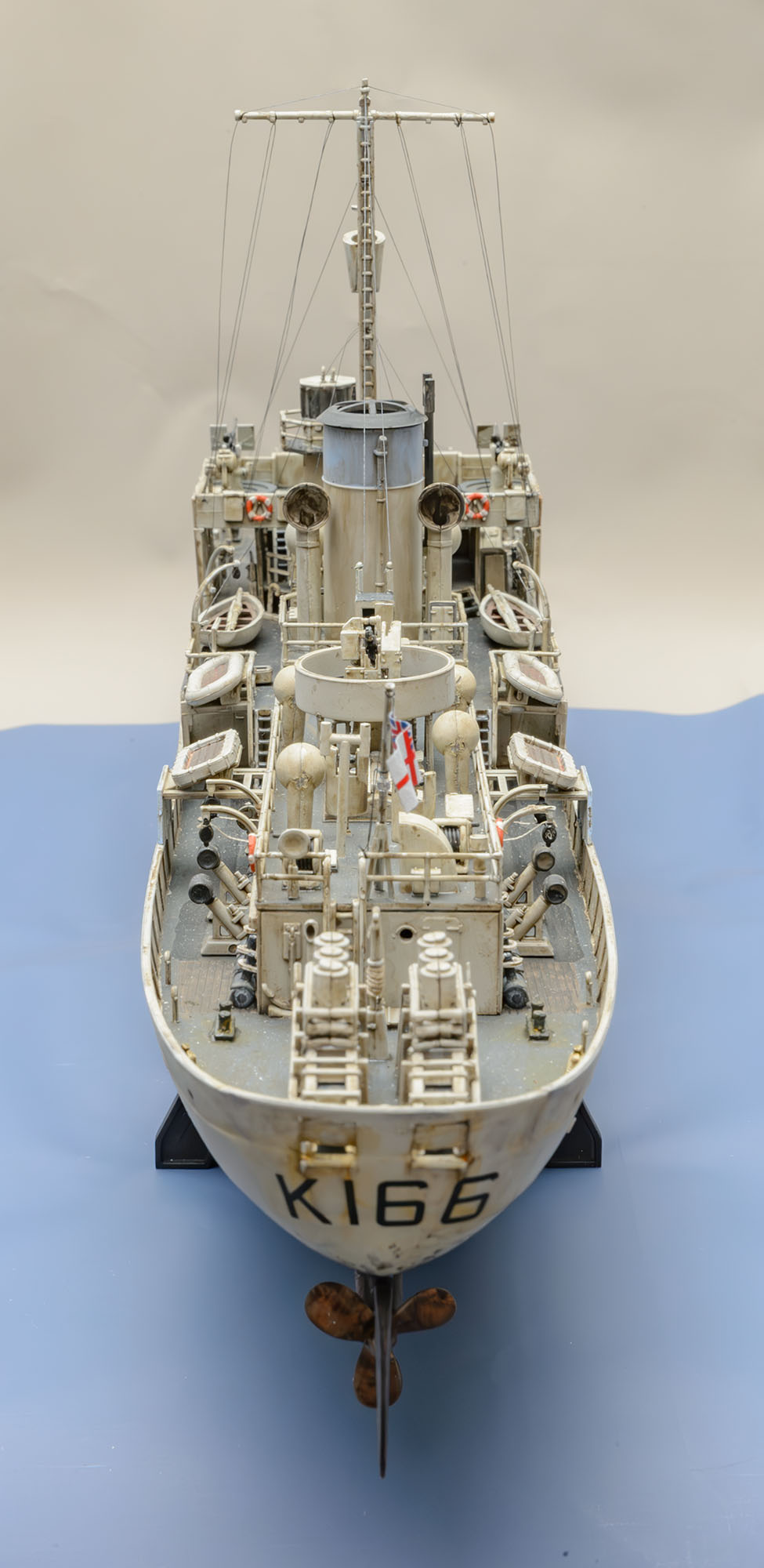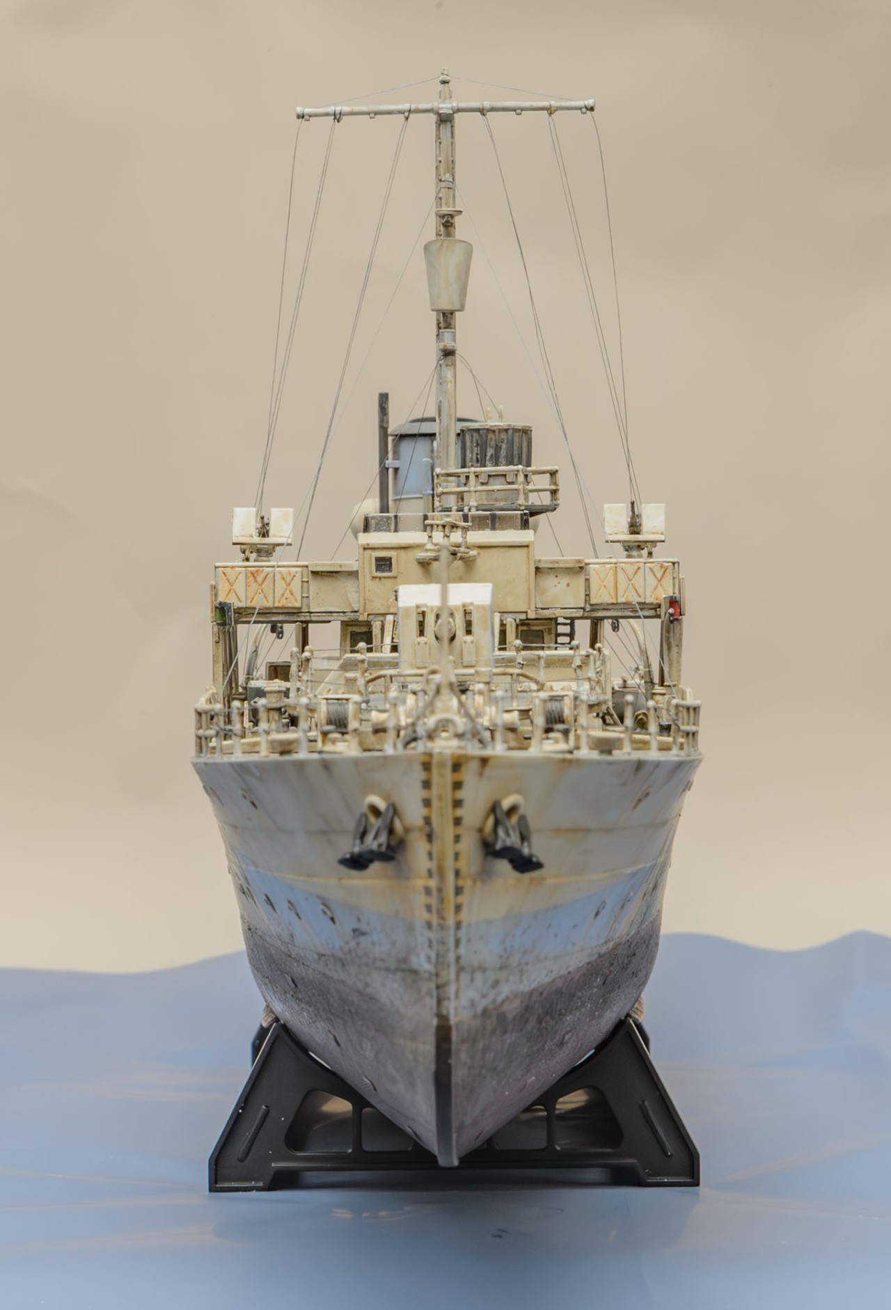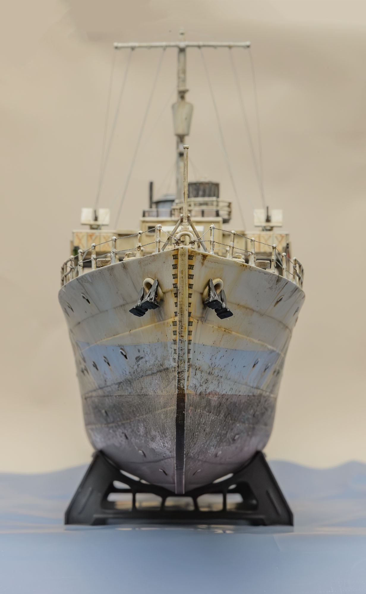 빅스케일인 1/144 이라서 1/350 키트+포토에칭보다 디테일이 생생하게 살아있습니다. 부품 하나하나 도색하면서 이건 어디에 쓰는 용도인지 확연히 이해할 수 있어서 배의 구조 이해에서 오는 즐거움이 상당합니다. 또한, 모든 부품이 포토에칭이 아닌 큼직하게 입체감있는 플라스틱 부품이라서 편하게 작업했습니다. 배의 길이도 팔꿈치까지 오는 크기라 전시가 부담스럽지 않은 적당한 크기입니다. 현대 군함 모형 입문을 원하시는 분은 저렴하지만 만들기 어려운 1/700 보다 AFV에 가까운 이 제품을 추천하고 싶습니다. 앙숙 관계였던 U보트의 1/144 모형과의 디오라마에도 잘 어울립니다.