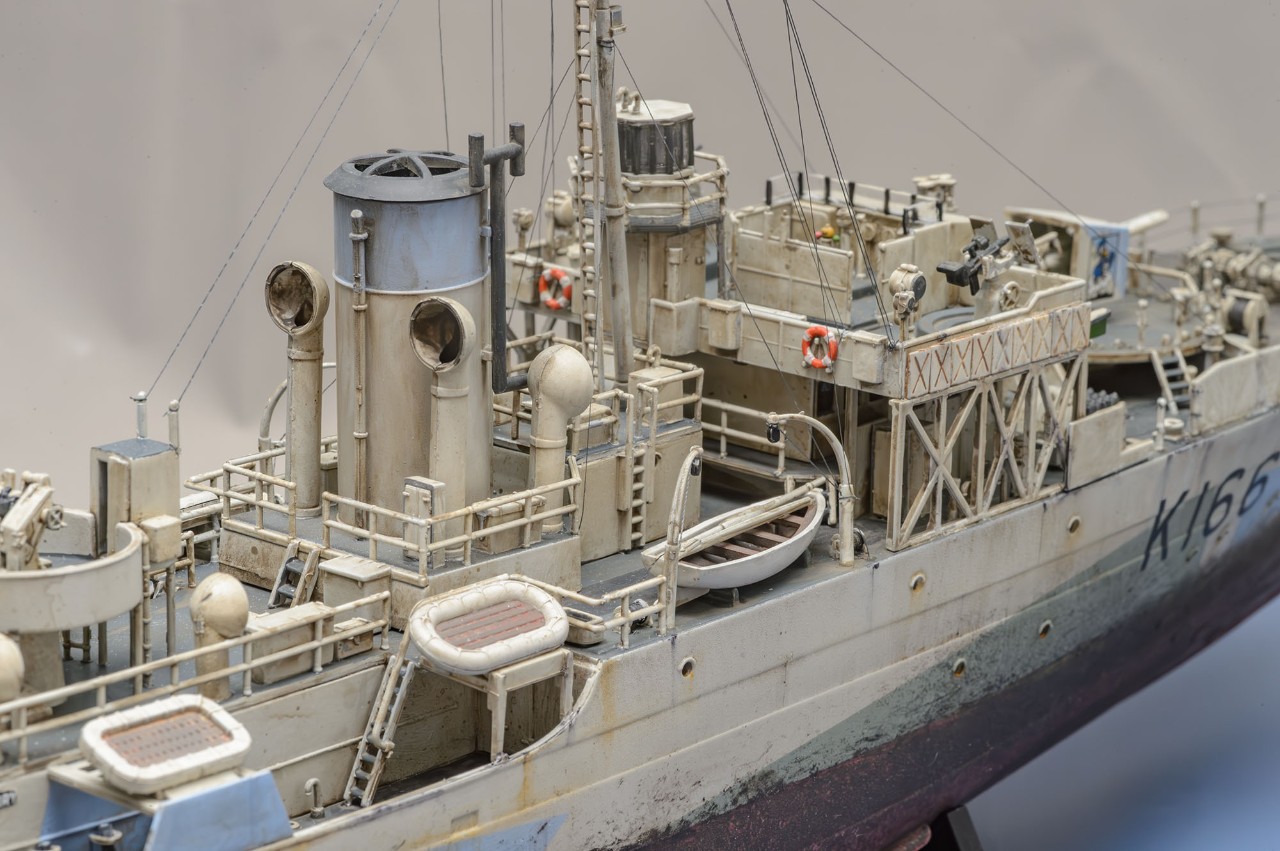 우리나라로 치면 1,000톤 신성급 초계함 규모라 원양에서의 항해 특성은 좋지 않았습니다. 하지만 전쟁으로 급박한 상황과 긴 항속거리로 먼 바다까지 나가야 했고, 과도한 대잠 무장과 적정 인원 두 배의 북적이는 함내, 언제나 뱃전을 적시는 거친 북대서양의 물결과 상시 긴장해야 하는 호위 임무로 함내는 축사를 방불케 했습니다.