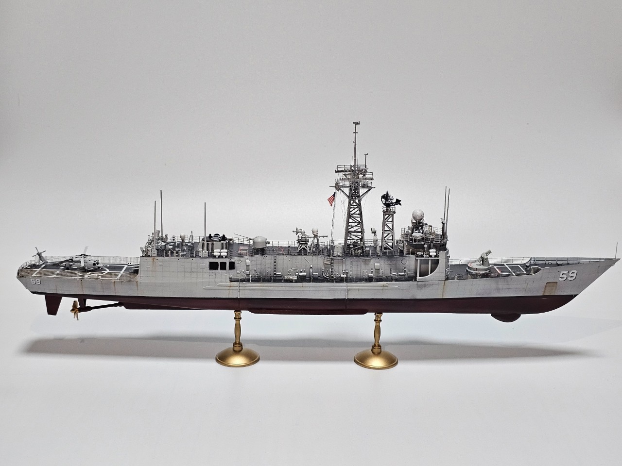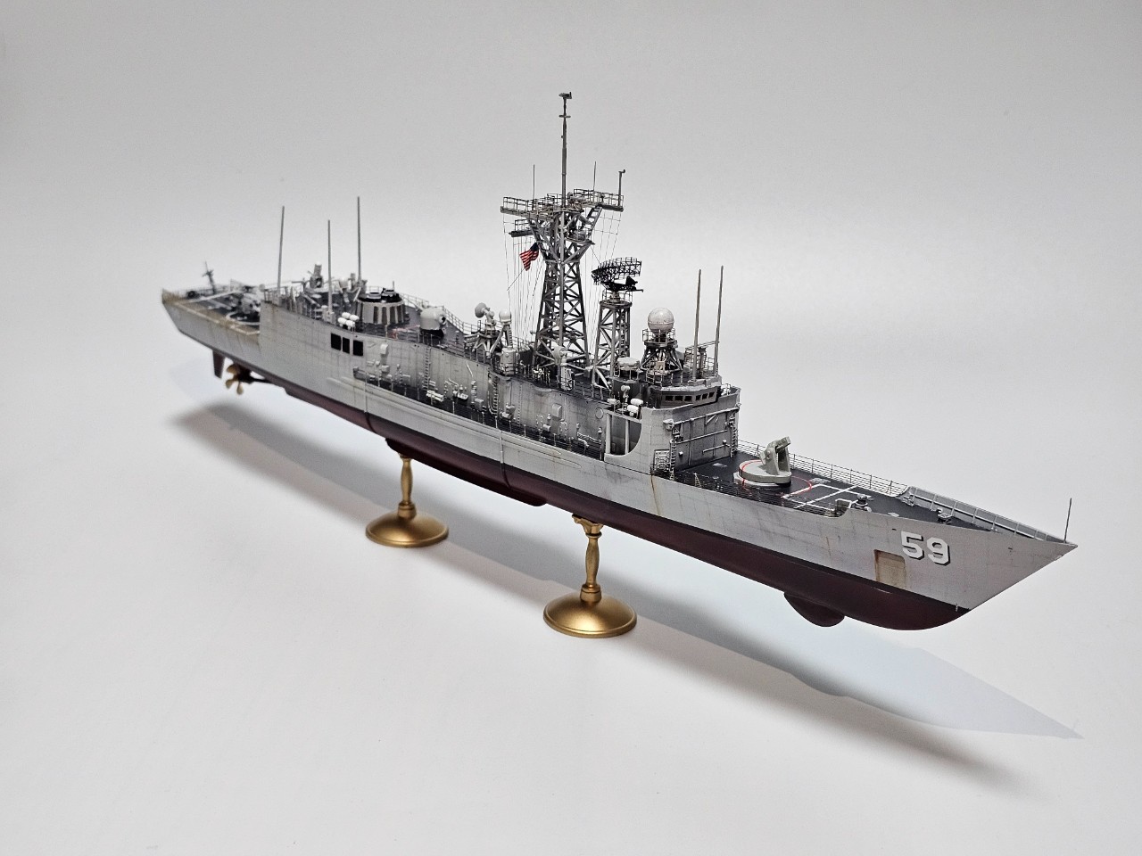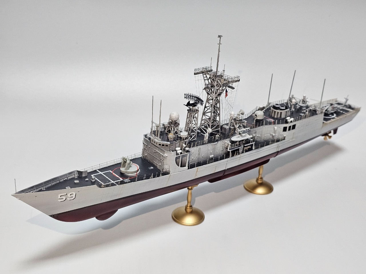 아카데미의 올리버 해저드 페리급 장선체형 킷을 바탕으로 함포, CIWS, 헬기, 어뢰발사관은 별매를 사용했고, 일부 사다리만 여분 에칭들에서 하나하나 가져다가 붙여주고 나머지는 전부 킷에 들어있는 인젝션과 동봉에칭을 이용해 만들어주었습니다.
