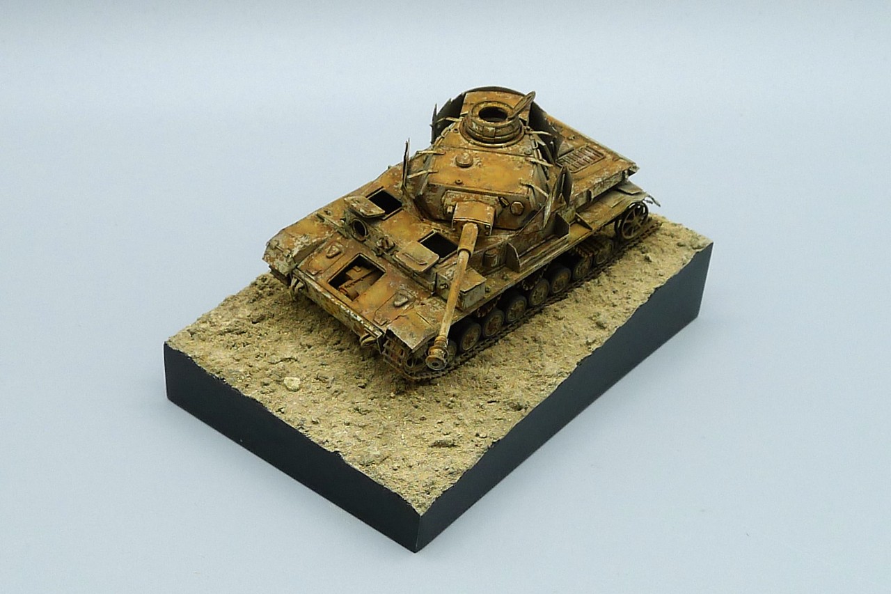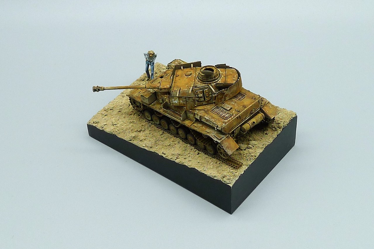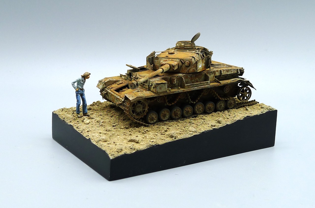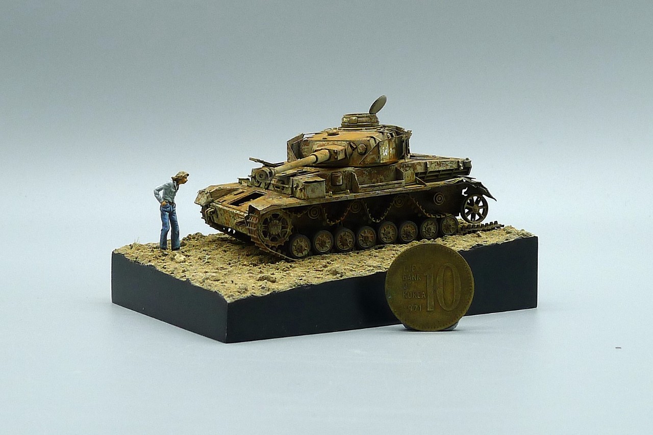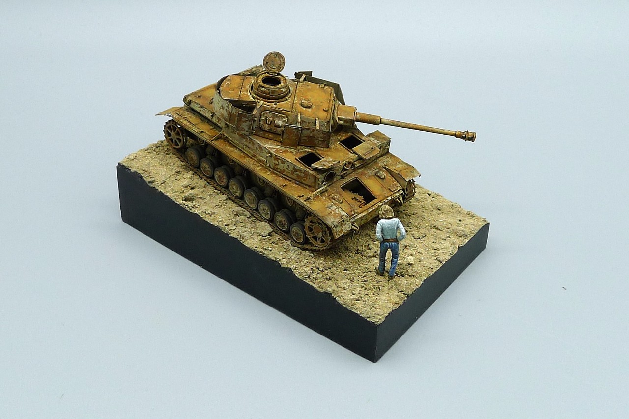 구글링하던 중 골란고원에 잠들어있는 시리아군 4호 전차 사진을 보고 영감을 받아 만들어봤습니다. 레벨의 4호 전차 H형을 베이스로 전방 상판의 트랜스미션 커버를 뚫어주고 실물 사진 참고하여 프라판,봉으로 만들어주었습니다. 쉬르첸과 펜더는 파트사의 에칭인데 아무래도 내구성이 염려되어 납땜 처리하였습니다. 시리아 4호전차 특징인 오묘한 각도의 공구상자 같은 걸 만들어 주었고 전방 소총수 조종수 관측창에 예비궤도 걸이가 있어 에칭런너로 만들어줬습니다. 궤도는 즈베즈다 4호에서 가져왔고 좌측은 파손된 형태로 심하게 휘어주었고 인형은 프레이져 민간인 인형인데 호기심에 들여다보는 모습이잘 어울린다 생각되어 배치해봤습니다.