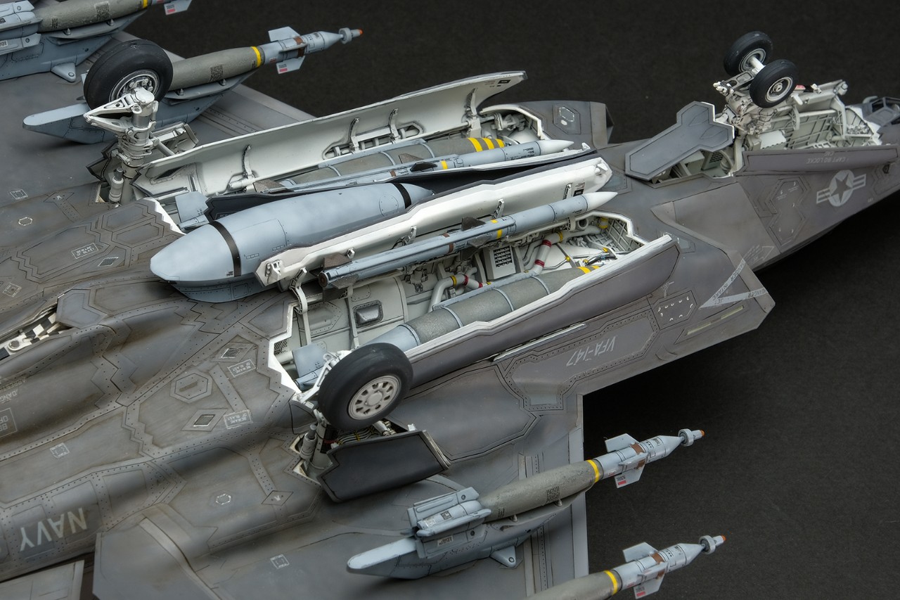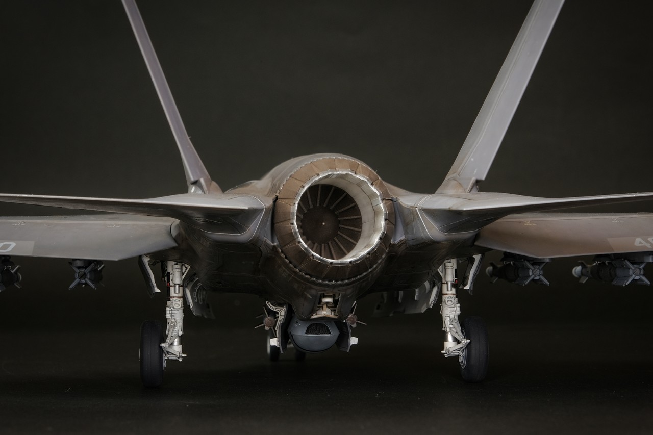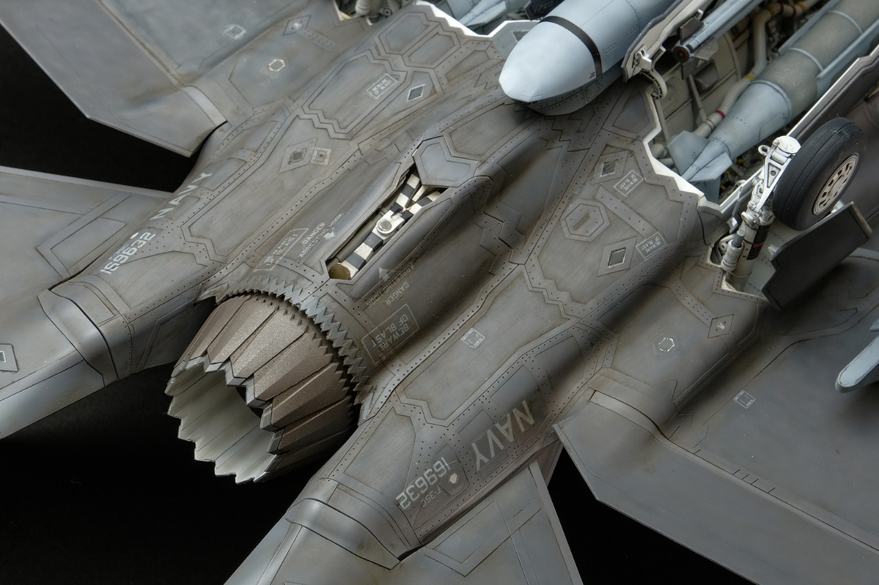 F-35의 어레스팅 후크는 밖에 노출되지 않고 기체 안쪽에 완전히 격납됩니다. 패널을 연상태로 제작했습니다.