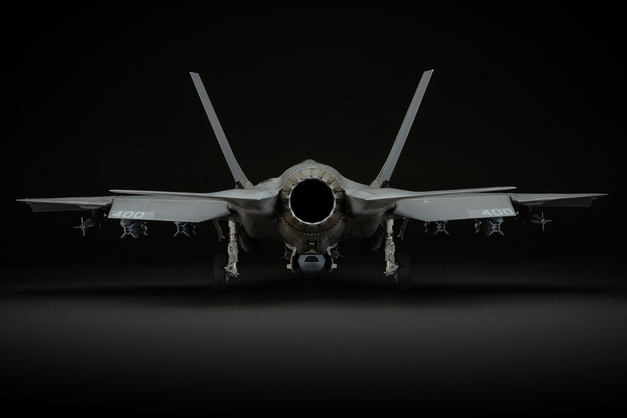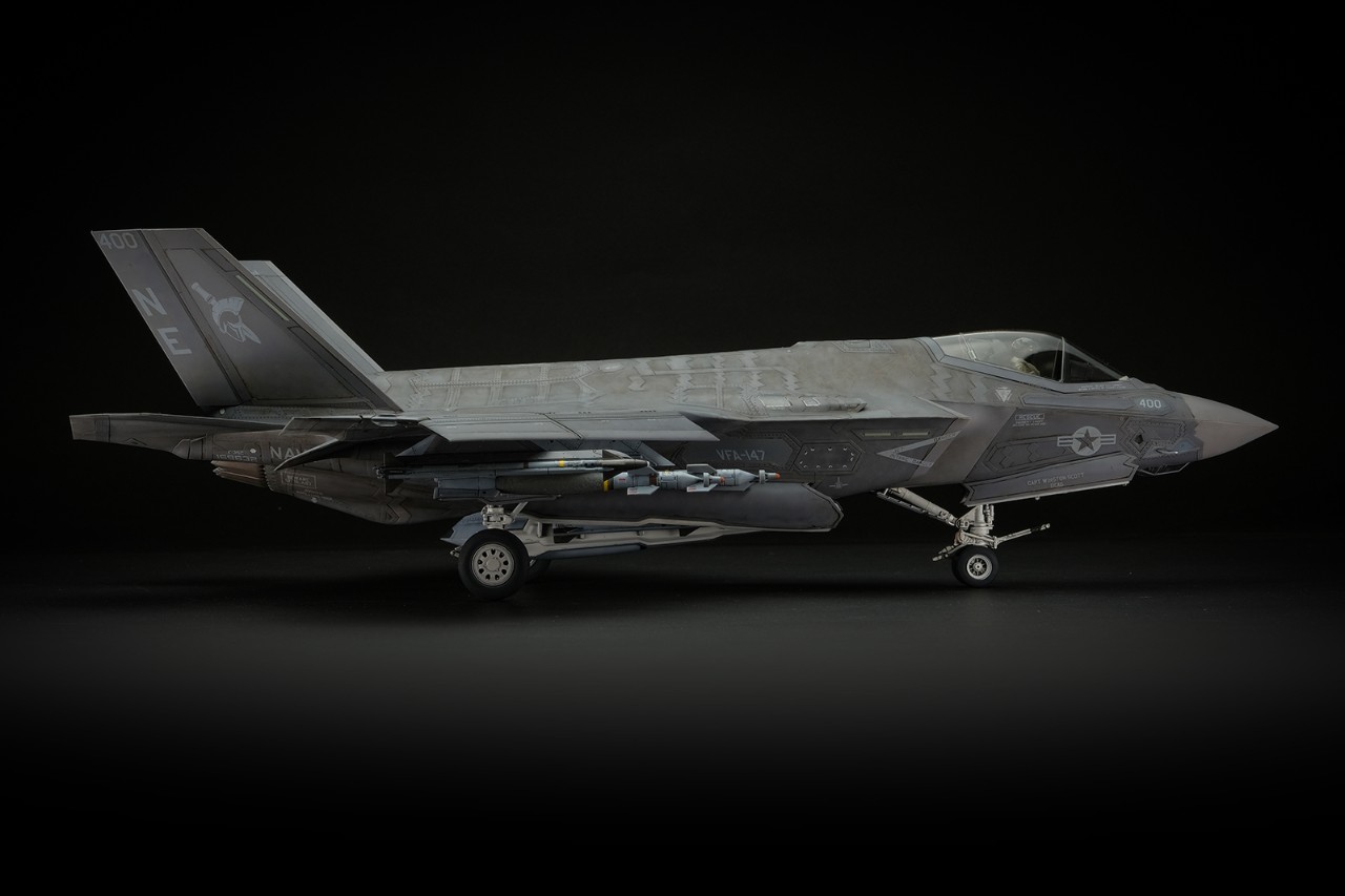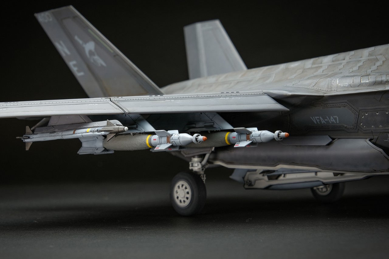 F-35의 어레스팅 후크는 밖에 노출되지 않고 기체 안쪽에 완전히 격납됩니다. 패널을 연상태로 제작했습니다.