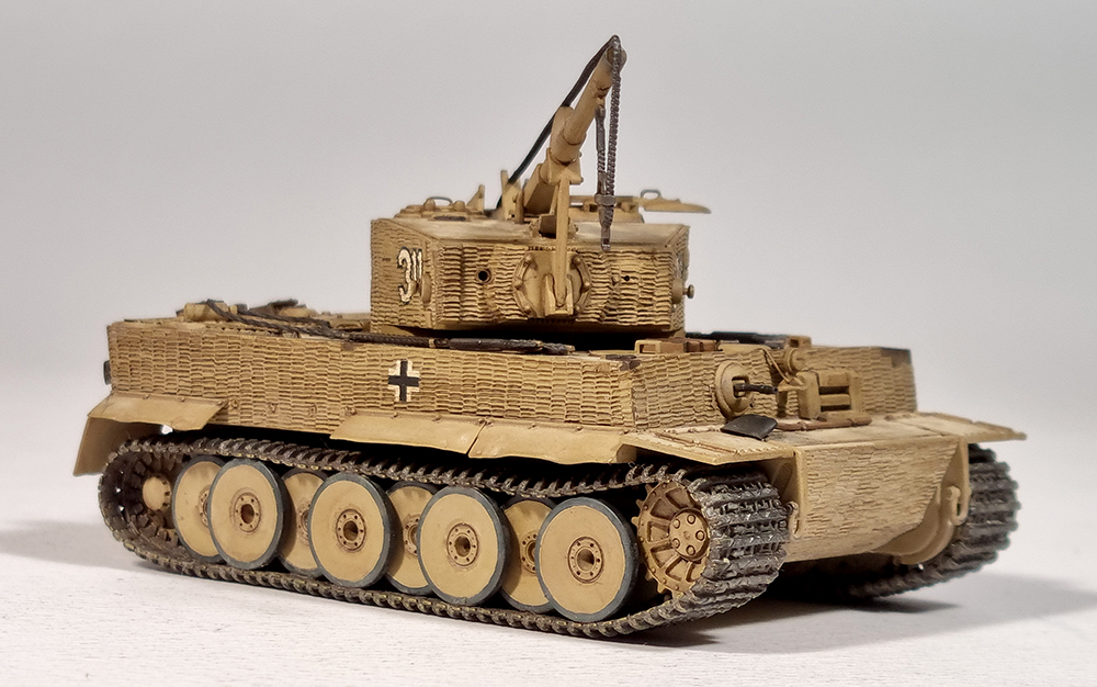 이 드라곤의 타이거 킷트들은 1/72 및 1/76 스케일의 인젝션 AFV 킷트로는 최초로 찌메릿트 코팅을 재현하였습니다. 그 이전에 이탈레리 등에서 1/35 AFV 킷트에서 찌메릿트 코팅을 재현한 경우는 몇번 있었지만 그 수준이 만족스럽지 못했기에 드라곤의 이 1/72 Tiger도 별 기대를 하지 않았지만, 찌메릿트 표현 만큼은 대단히 만족스러웠고 그외 다른 부분의 디테일도 레벨의 1/72 Tiger들을 뛰어넘는 곳이 있었습니다. 엔진덱크가 엣칭인 것도 장점이었지만 궤도는 고무제입니다. 1/72스케일이라면 고무제 궤도도 너무 투박하지만 않다면, 순간접착제로 고정할 수 있어서 궤도의 처짐을 어느 정도 재현할 수 있습니다.