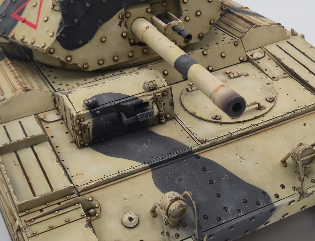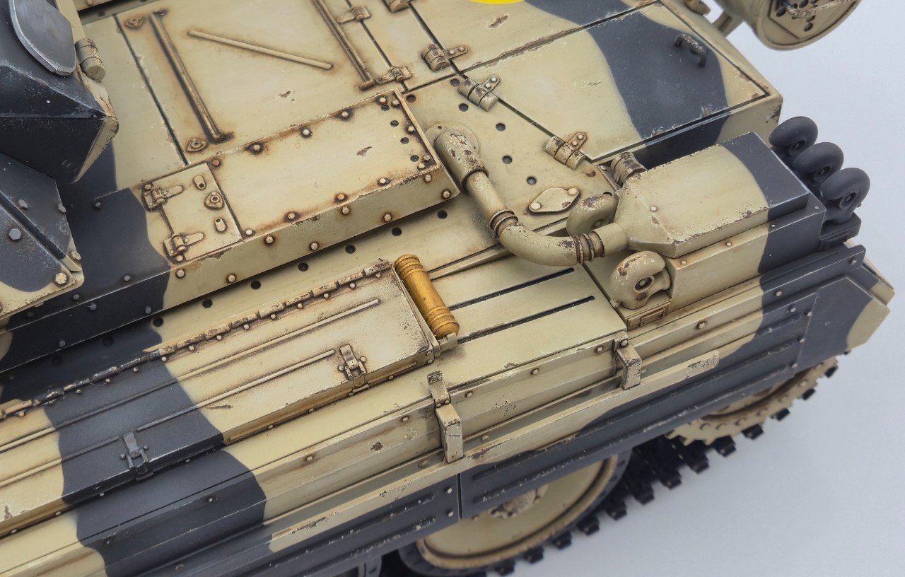 직구로 10만원 정도에 구입한 저렴한 전차지만. 포탑회전 포신 상하가동 주포반동, 포발사 섬광,라이트, 연무, 사운드 등등 왠만한건 다 되는 전차입니다. 굴리고 놀 요량으로 구매한 전차라 있는그대로에 간단히 위장무늬만 넣으려 했는데 하다보니 치핑과 웨더링까지 해줬습니다. 디테일도 상당히 좋은 편이라 생각됩니다. 서스펜션도 기가막히는데 언제한번 동영상을 찍어 올려보도록 하겠습니다. ㅎㅎ