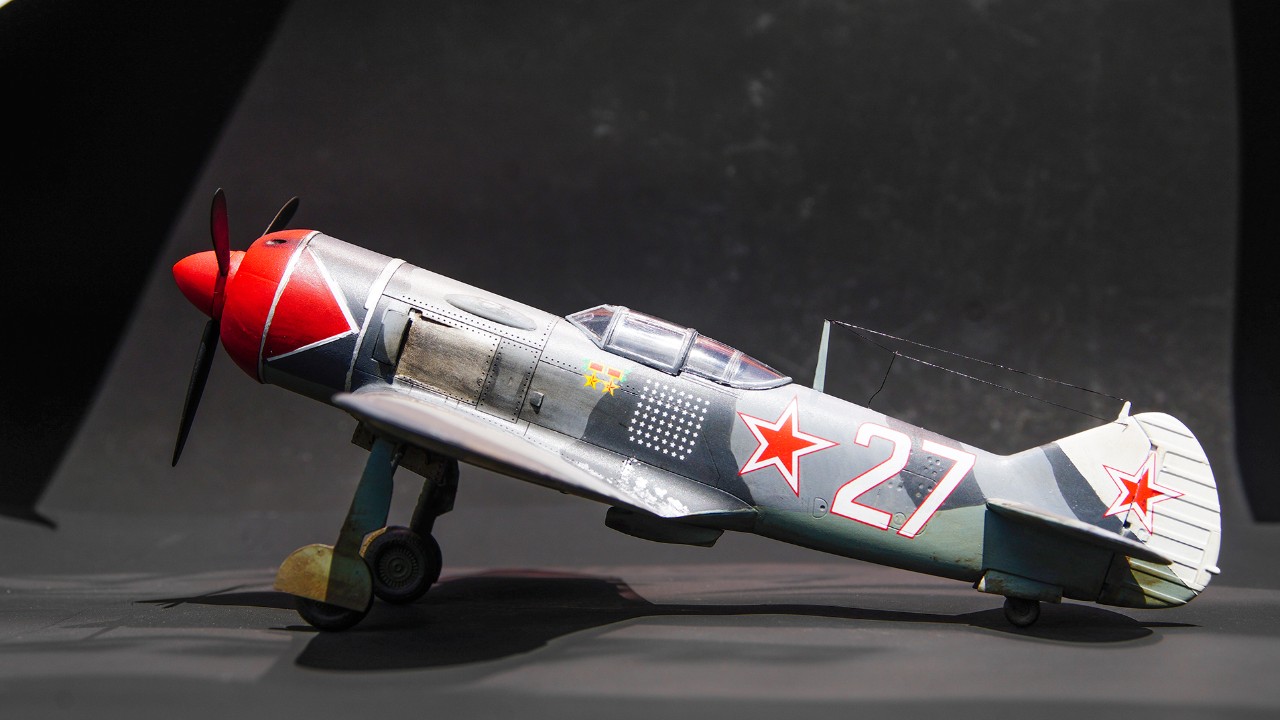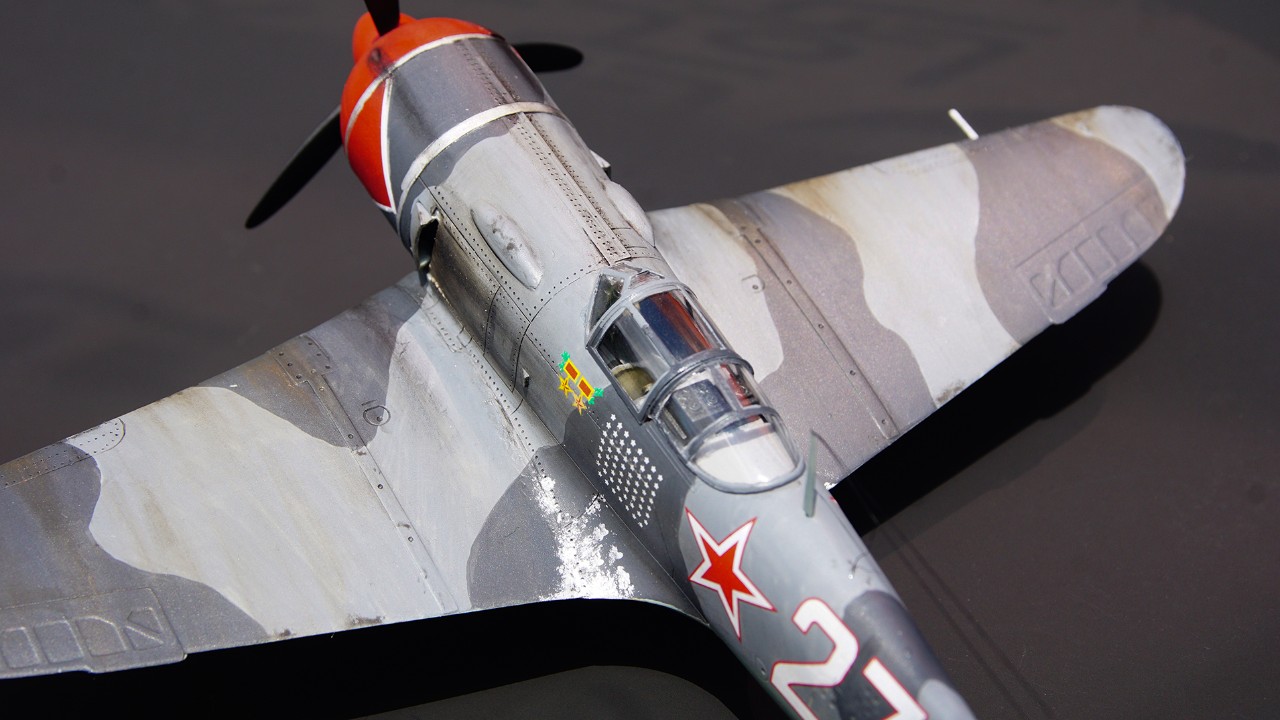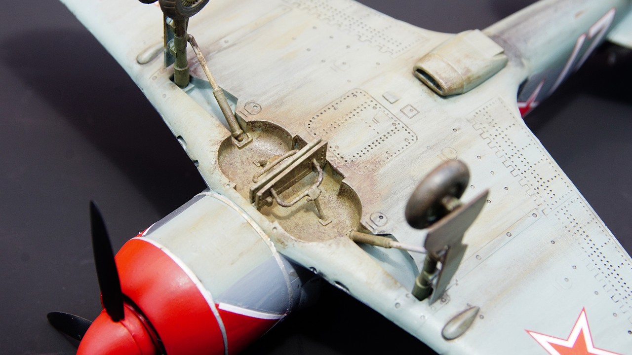 아카데미가 재현한 코제두브 탑승기 데칼은 종전 직전을 재현한것으로 초봄이였으니 소련군 비행장 특유의 비포장으로 인한 진흙과 흙먼지가 하면에 상당했을것으로 상상하고 웨더링하였습니다. 집에 촬영할만한 장소 같은게 딱히 없어서 자연광에서 찍다보니 상당히 웨더링한 색감이 진해보이는데 실제론 첫번째 사진 및 곧 등장할 하부를 촬영한 사진처럼 은은한 색감입니다.