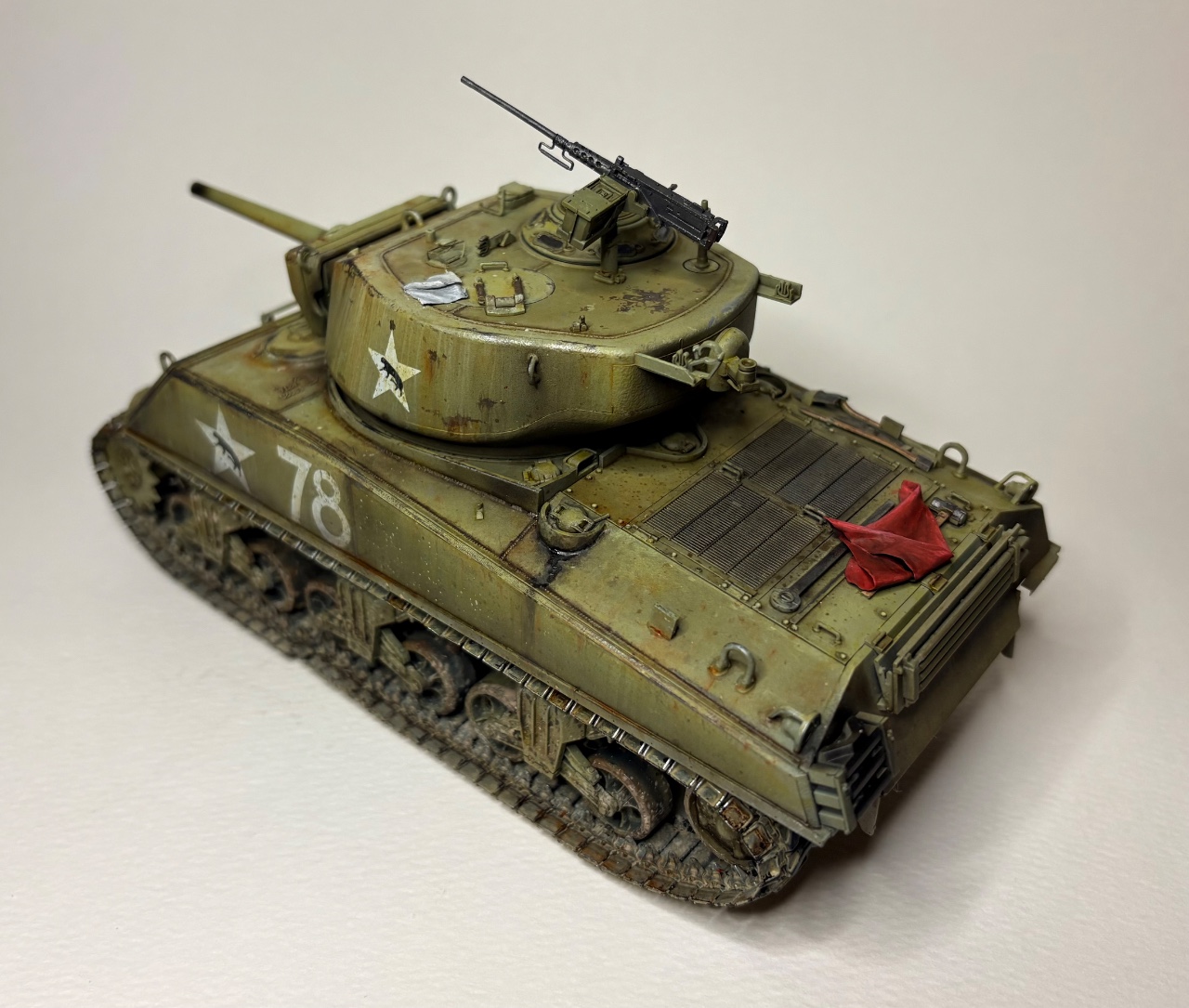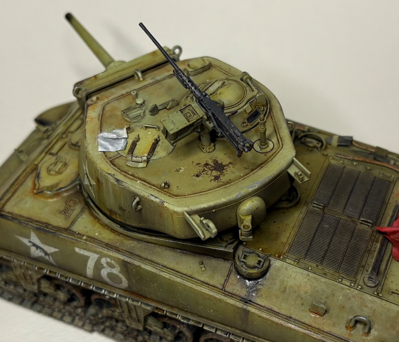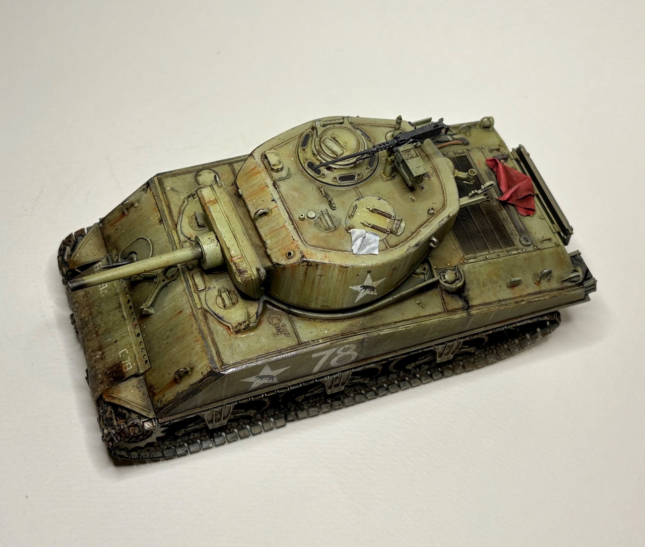 포탑 해치의 손수건과 엔진데크 위 아군 식별용 붉은 천은 플라스틱 퍼티를 이용하여 제작했습니다.