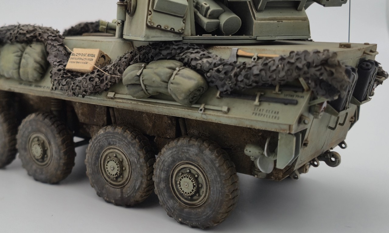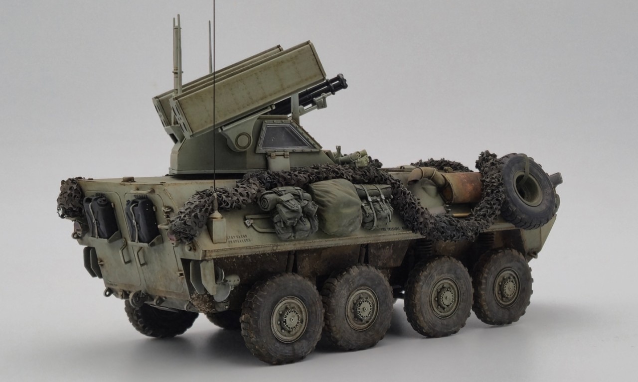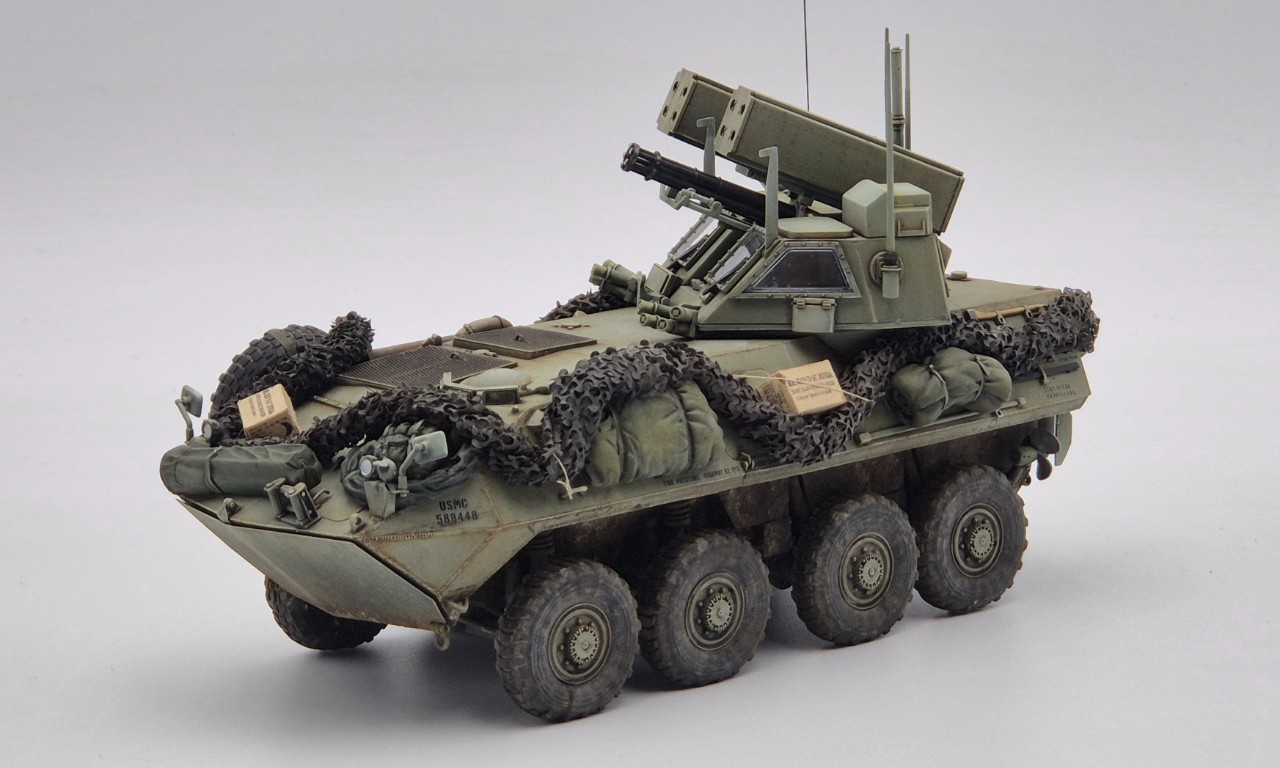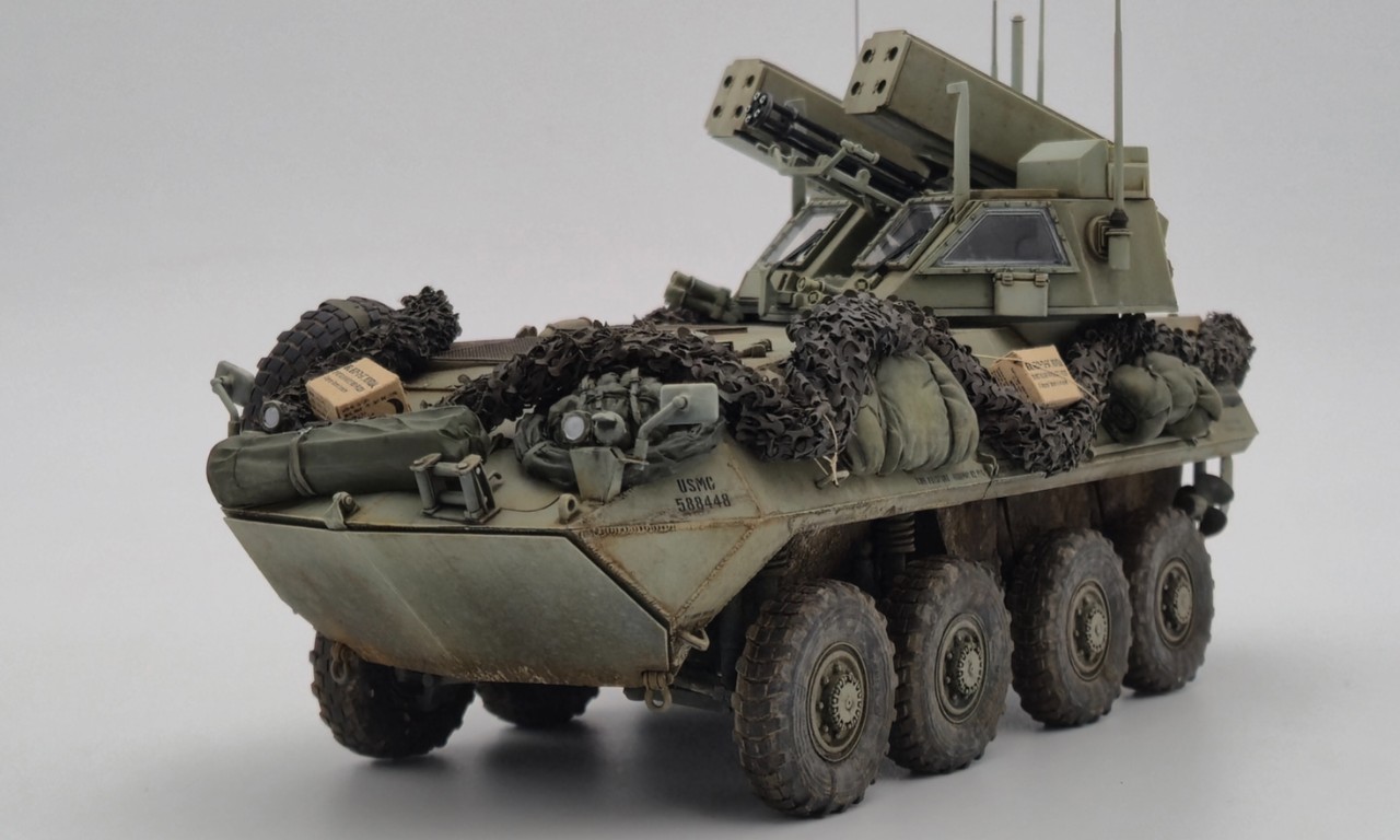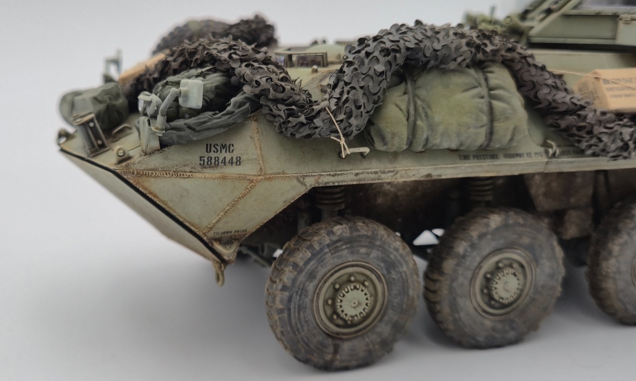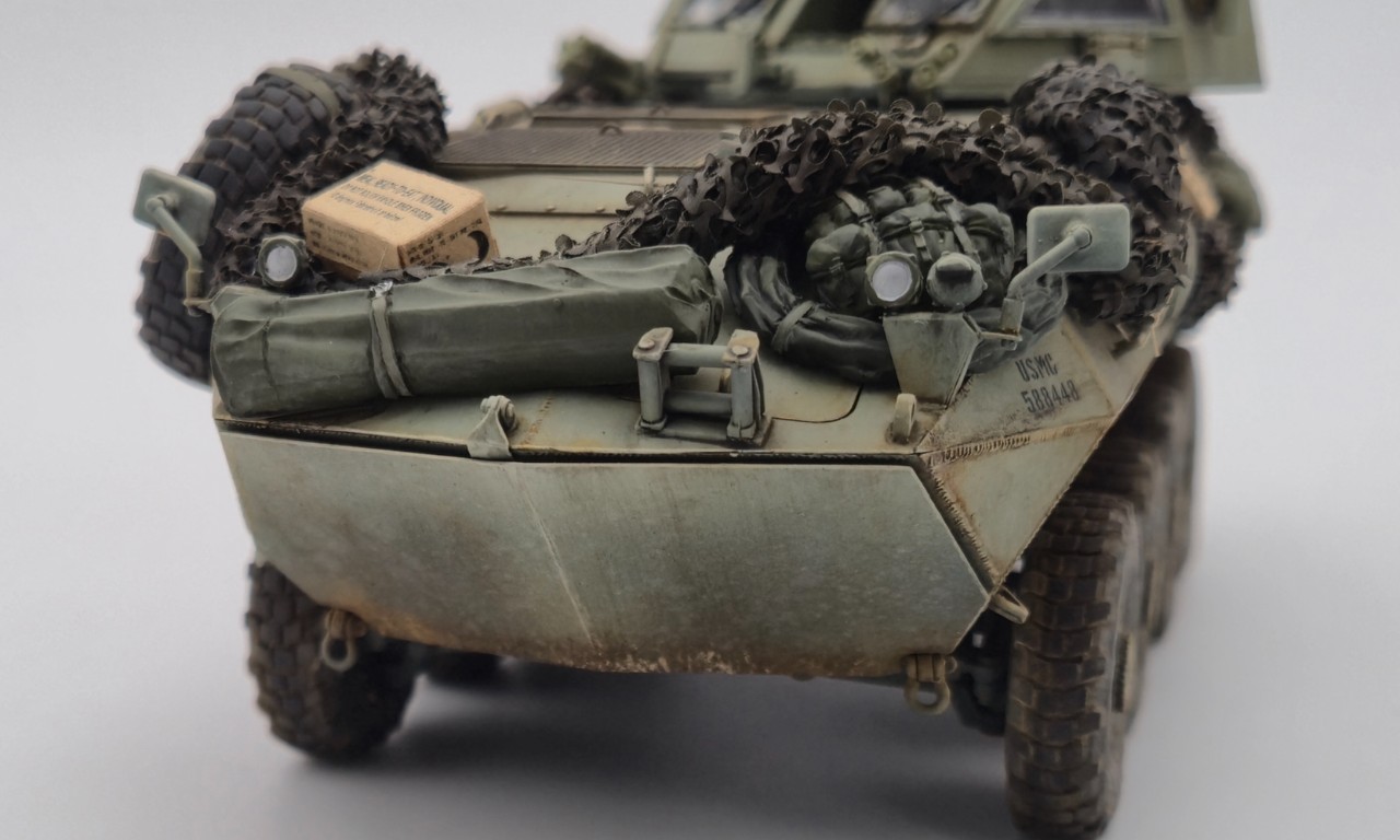 해병대 버전으로 만들었고 연막탄만 다른킷에서 빼와서 달아줬습니다. 레전드의 LAV-25장비품 세트 중 일부를 사용해줬고 위장막은 Tetra model works 제품입니다. 바퀴는 Def.model 제품입니다.