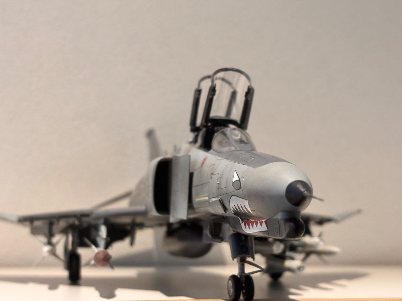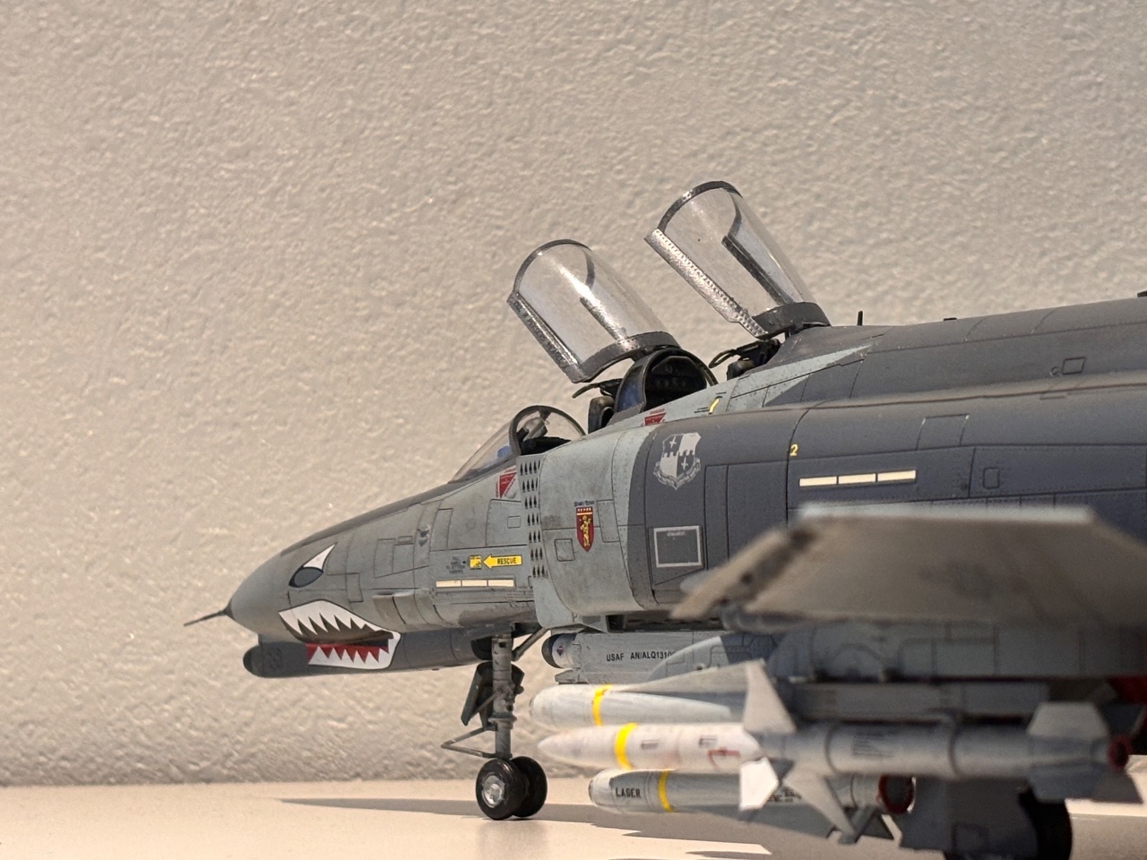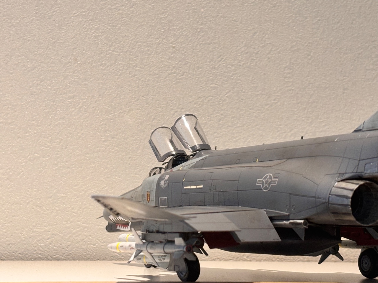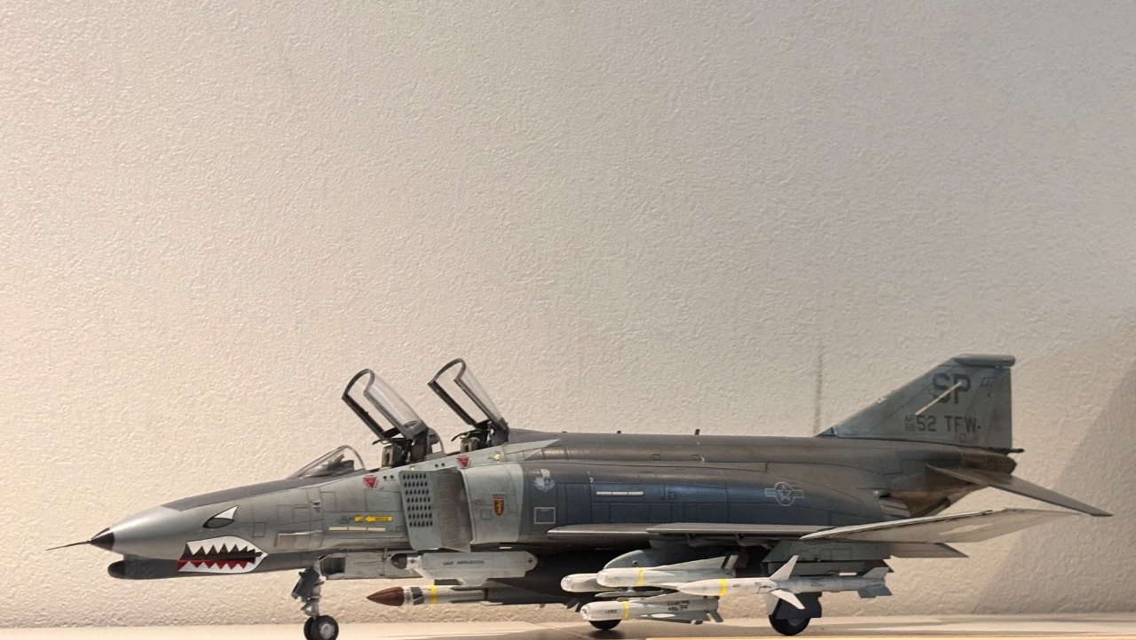 (Meng)에서 발매된 키트이며, 과거 아카데미 J형 팬텀 제작 시 데칼 실수로 폐기했던 경험 이후 다시 팬텀을 만들고 싶은 마음에 제작했습니다. 키트는 전반적인 조립성이 매우 우수했으며, 풍부한 무장 구성이 특징입니다. 무장은 외부 연료탱크 3개, AN/ALQ 포드 2개(선택), AGM-88 2개, AGM-78 2개, AGM-65 6개, Aim-7M 4개로 구성되어 있습니다. 이 중 AN/ALQ-119, AGM-88, AIM-7M과 더불어 비대칭 무장으로 AGM-78과 AGM-65 3개를 선택하여 제작했습니다