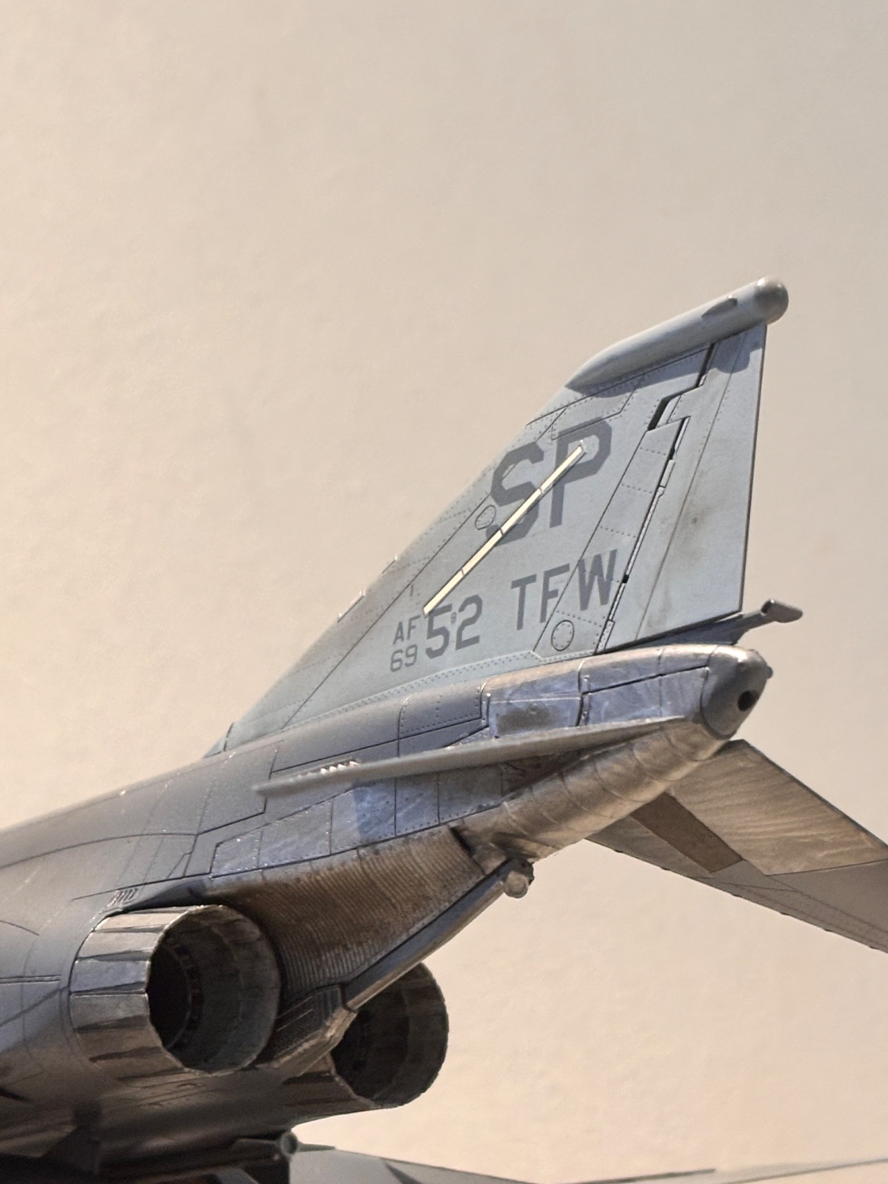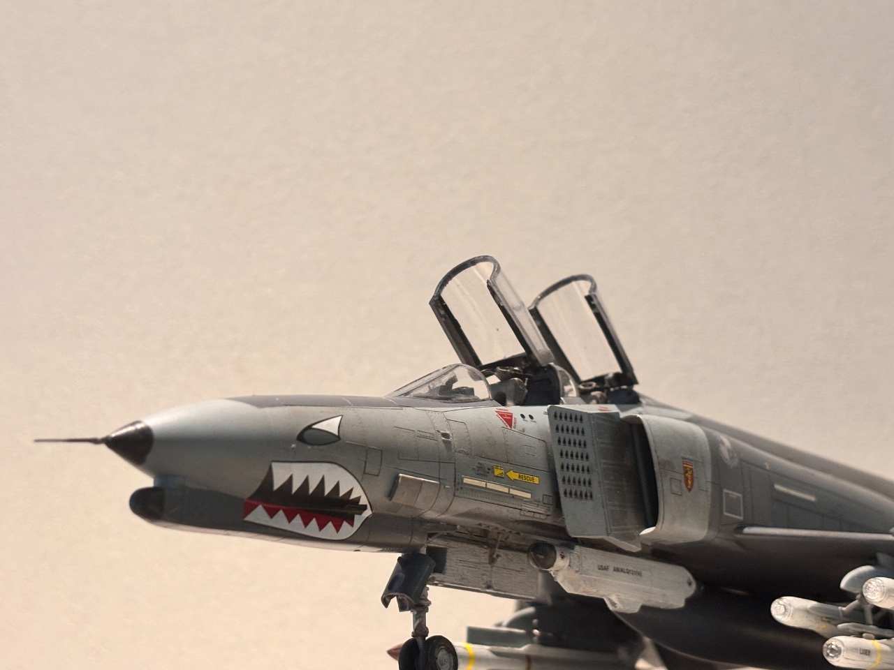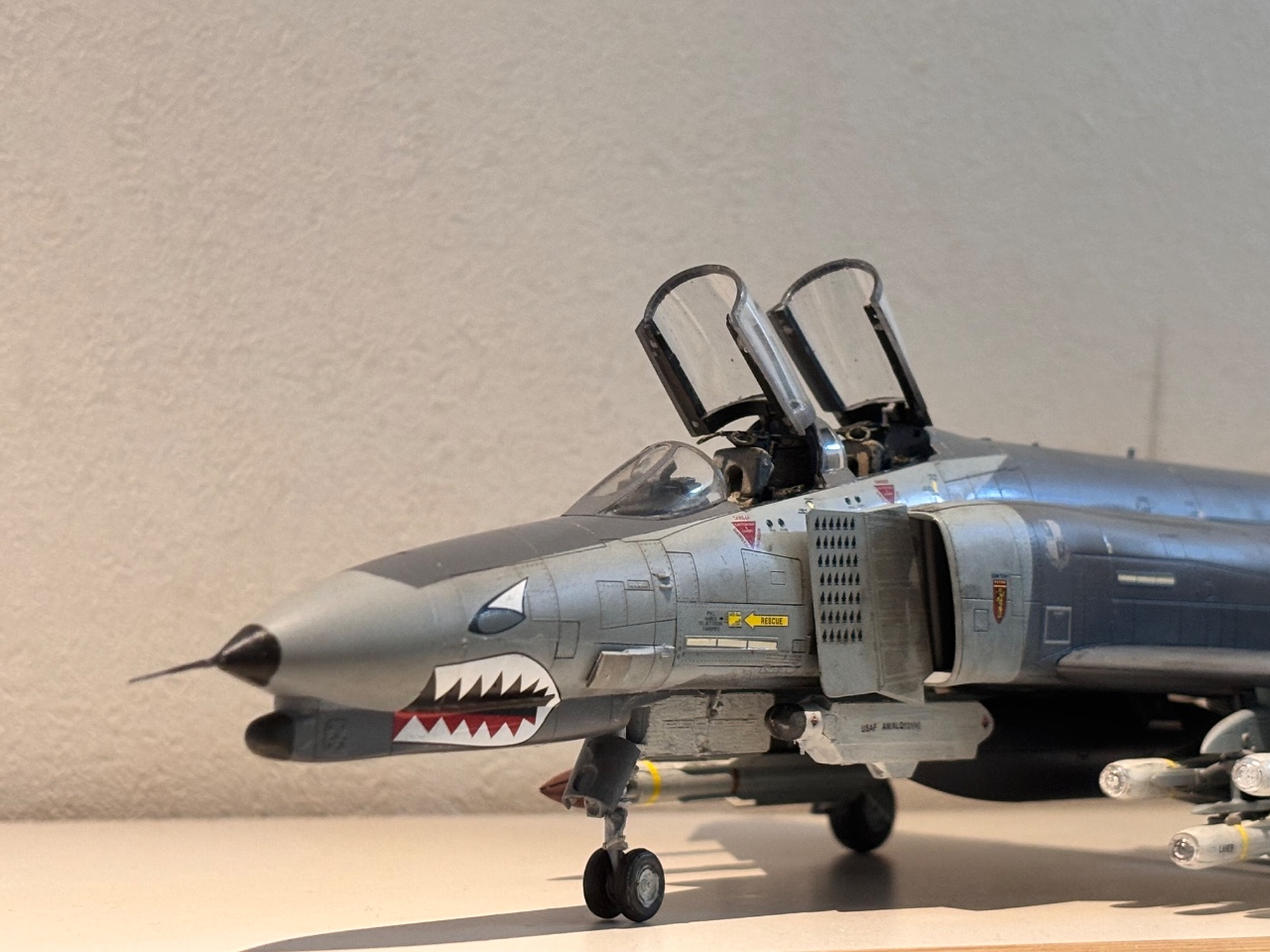 (Meng)에서 발매된 키트이며, 과거 아카데미 J형 팬텀 제작 시 데칼 실수로 폐기했던 경험 이후 다시 팬텀을 만들고 싶은 마음에 제작했습니다. 키트는 전반적인 조립성이 매우 우수했으며, 풍부한 무장 구성이 특징입니다. 무장은 외부 연료탱크 3개, AN/ALQ 포드 2개(선택), AGM-88 2개, AGM-78 2개, AGM-65 6개, Aim-7M 4개로 구성되어 있습니다. 이 중 AN/ALQ-119, AGM-88, AIM-7M과 더불어 비대칭 무장으로 AGM-78과 AGM-65 3개를 선택하여 제작했습니다
