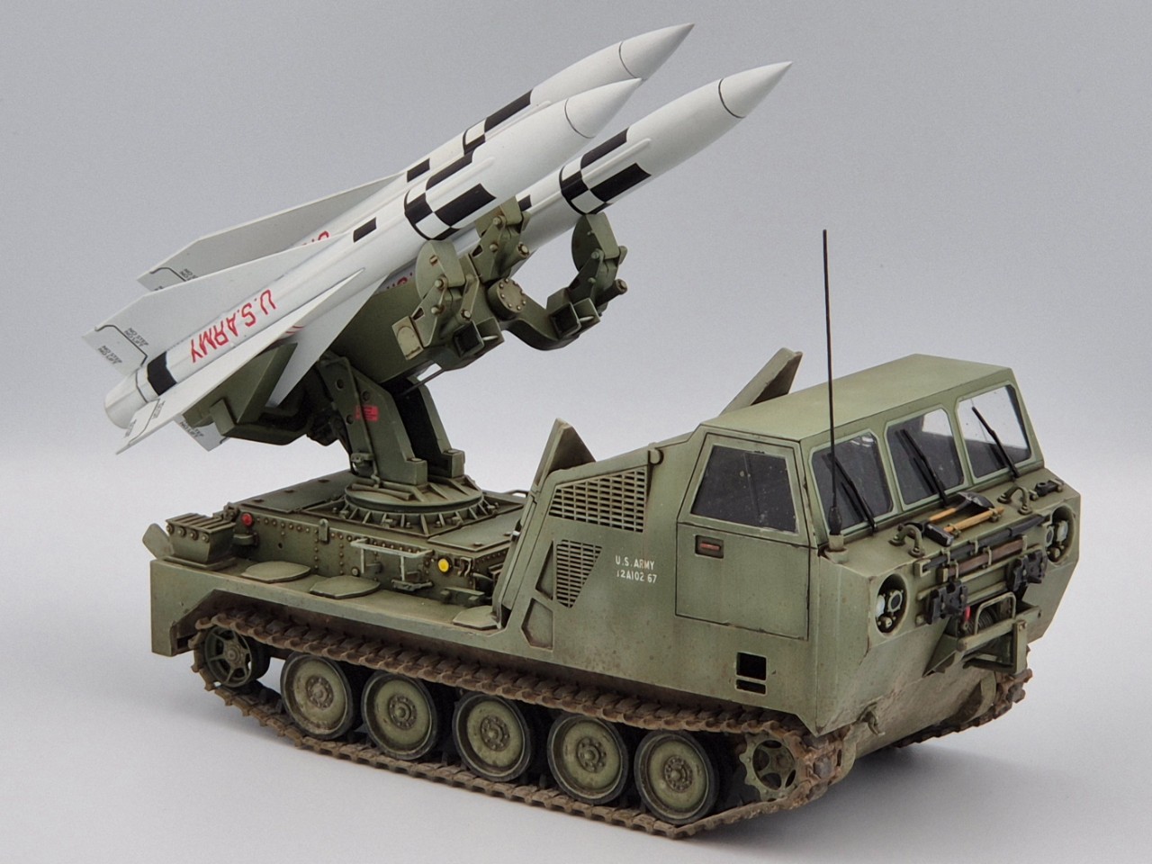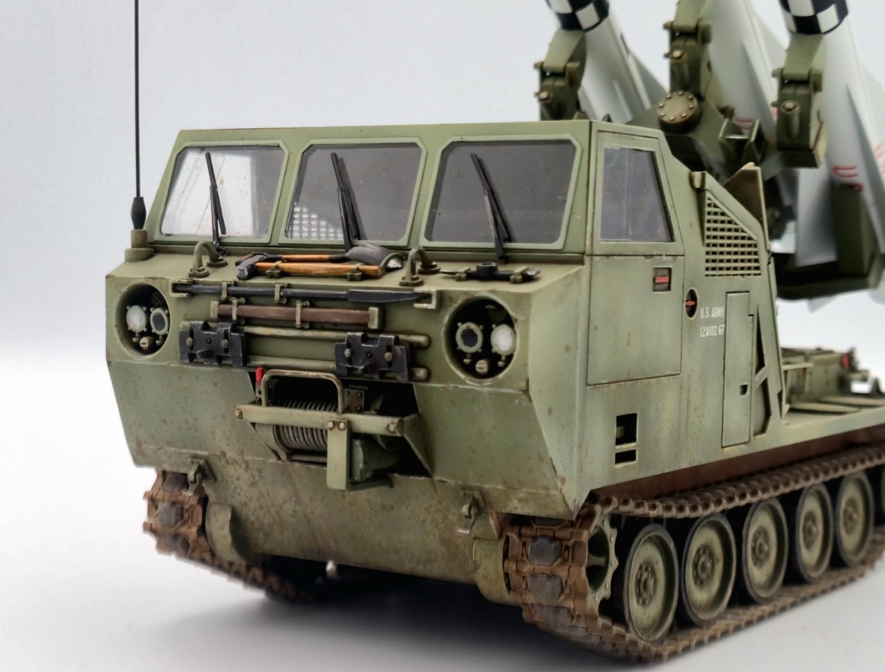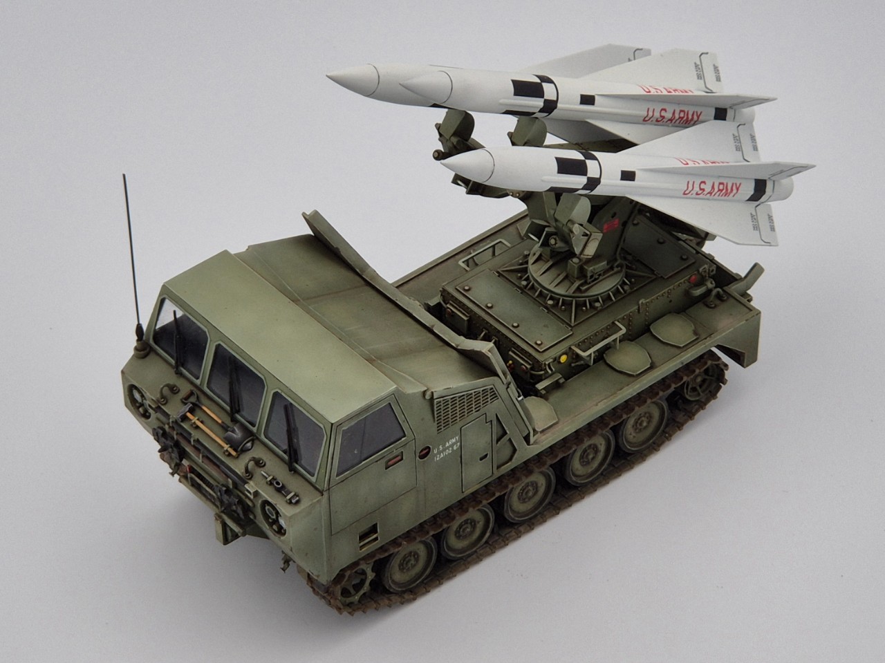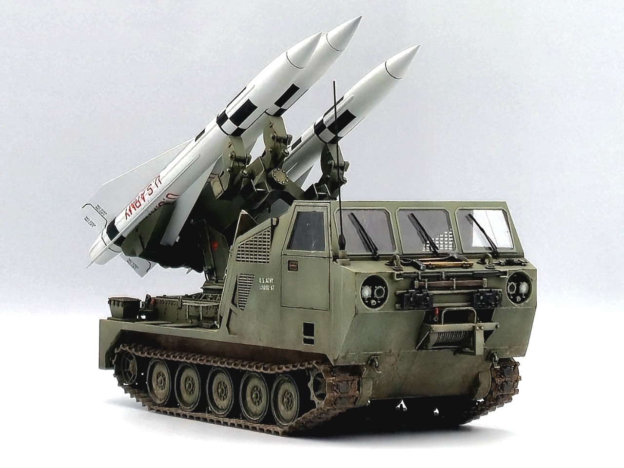 아주 짧은기간 운용되었던 호크 미사일 운반차량이고 발사시에는 런처가 차량 뒷쪽으로 밀리고 방폭벽?이 내려오면서 발사모드가 됩니다. M113을 모태로한 M548트랙터의 파생차량 되겠습니다.