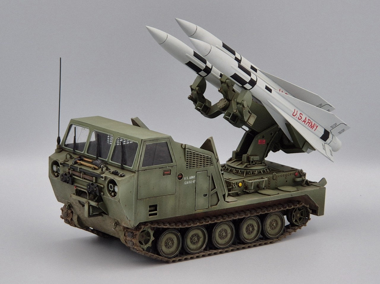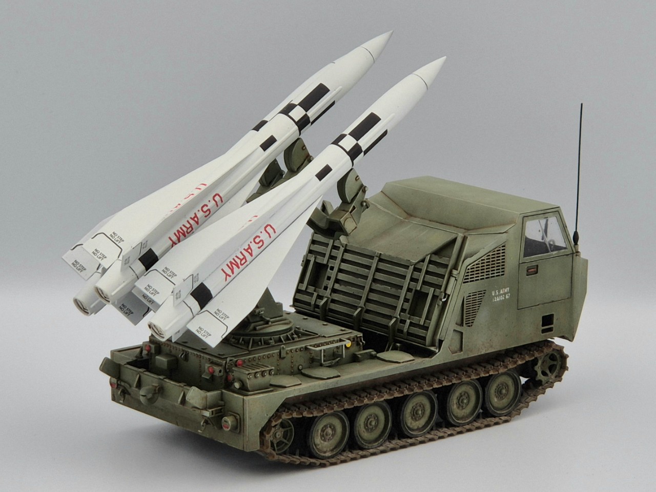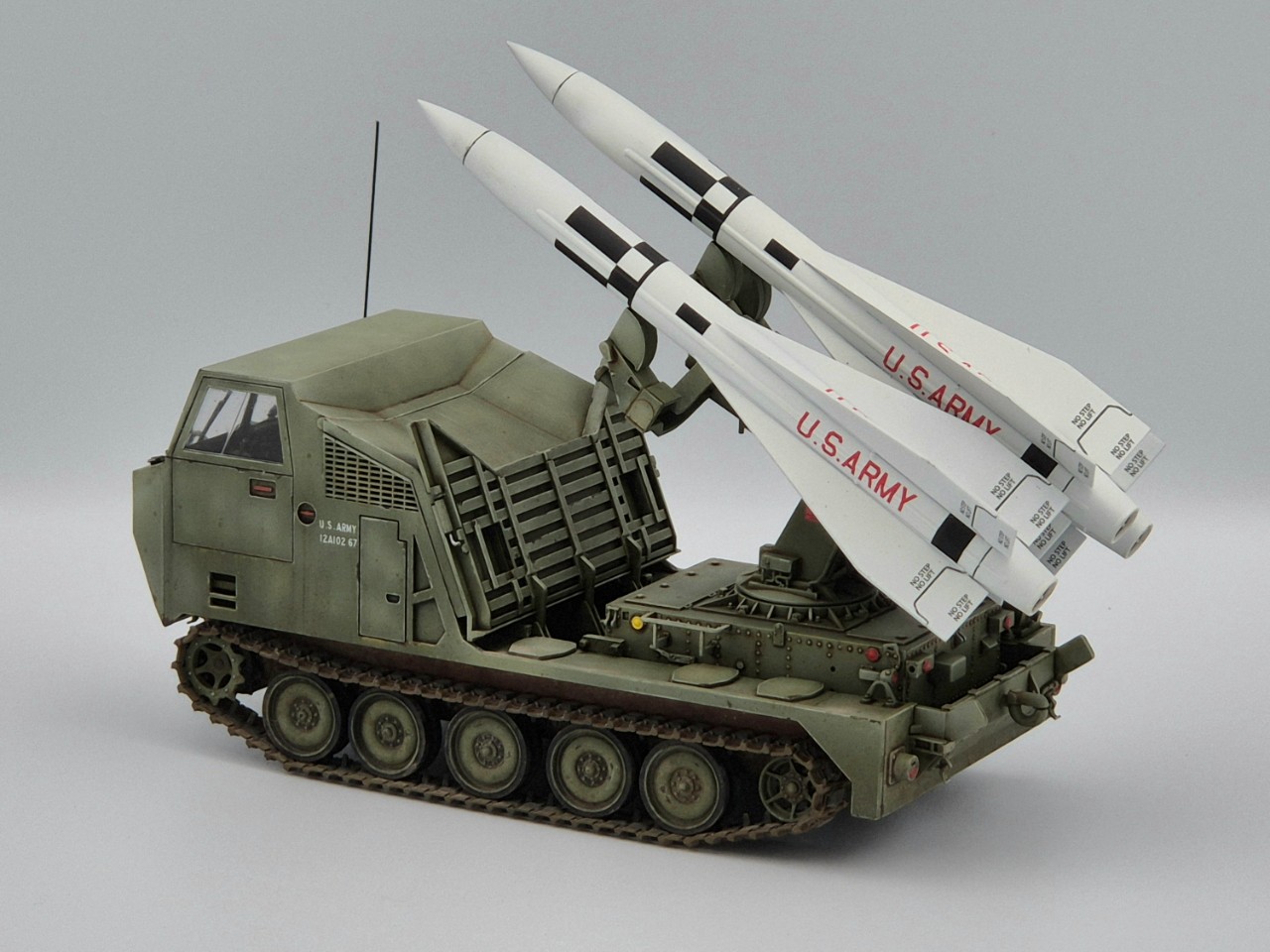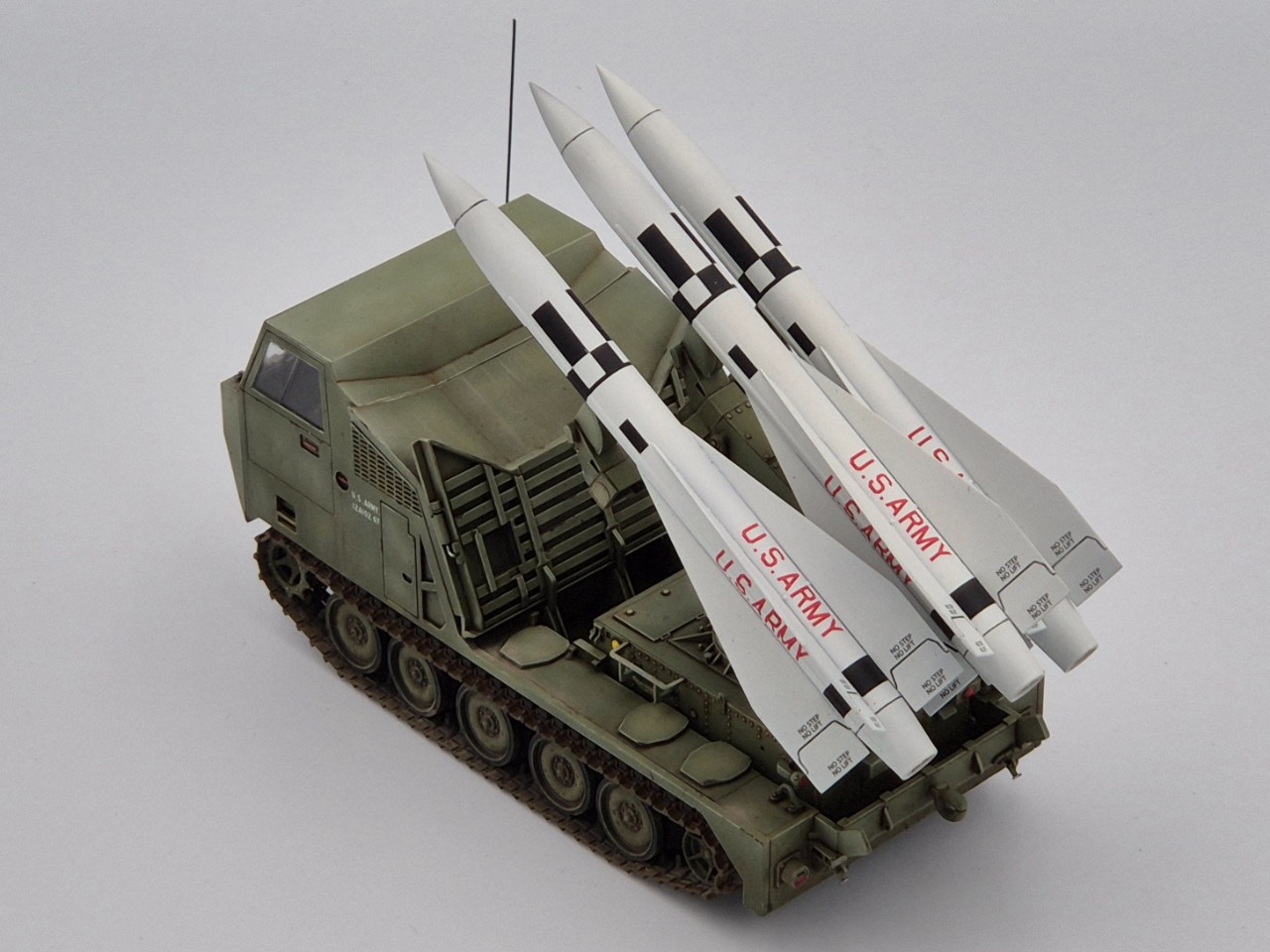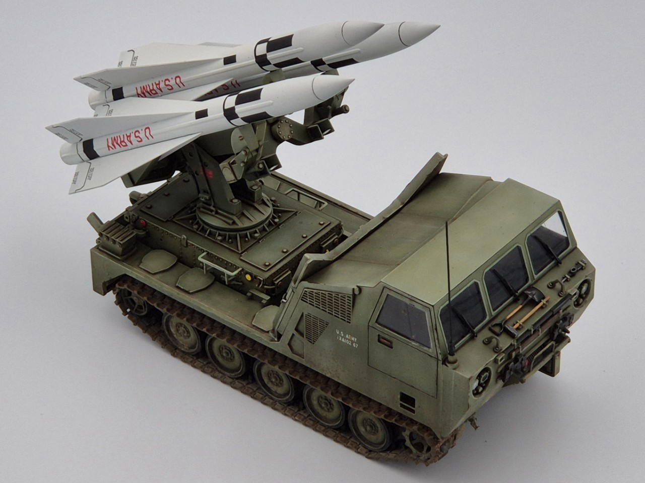 아주 짧은기간 운용되었던 호크 미사일 운반차량이고 발사시에는 런처가 차량 뒷쪽으로 밀리고 방폭벽?이 내려오면서 발사모드가 됩니다. M113을 모태로한 M548트랙터의 파생차량 되겠습니다.