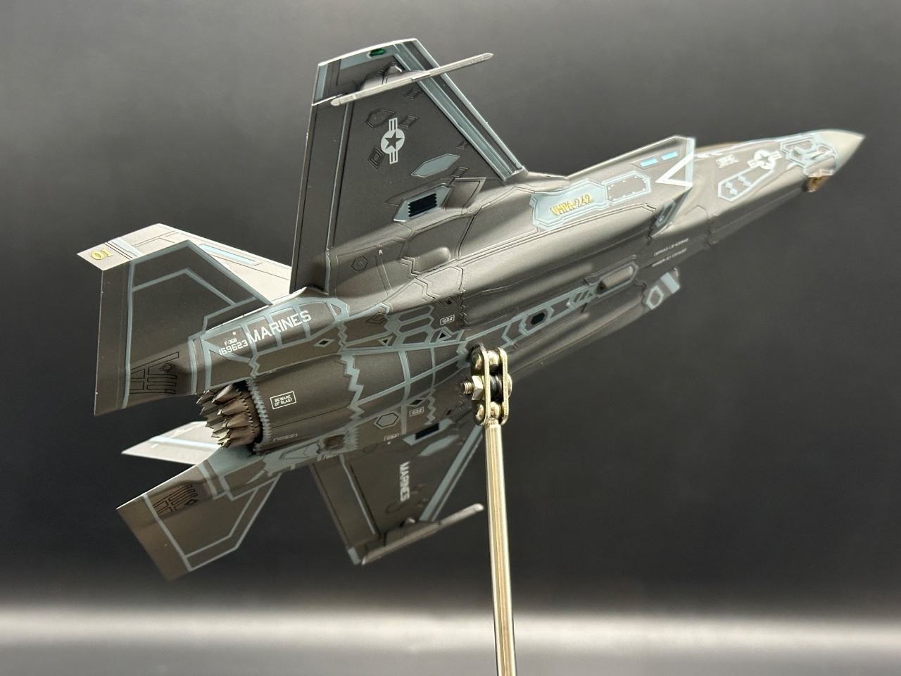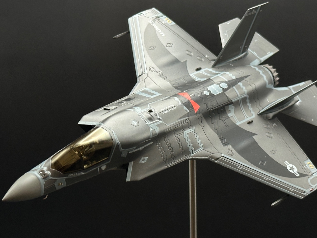 안녕하세요. 최근에 아카데미에서 출시한 f-35b를 만들어보았습니다. 동체상부에 박쥐가 큼지막하니 멋집니다. 스탠드에 고정시키고 힌지를 달아서 이리저리 움직이게 만들었습니다. 감사합니다.