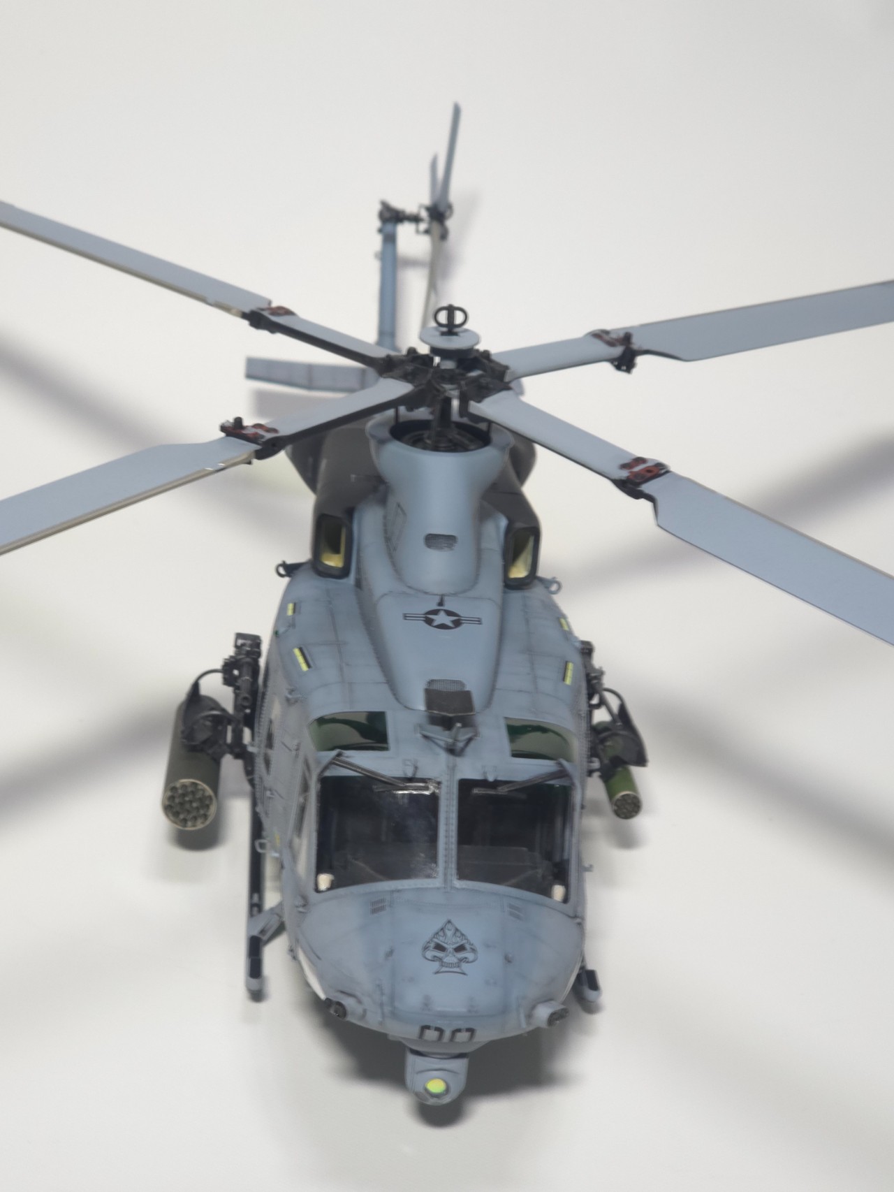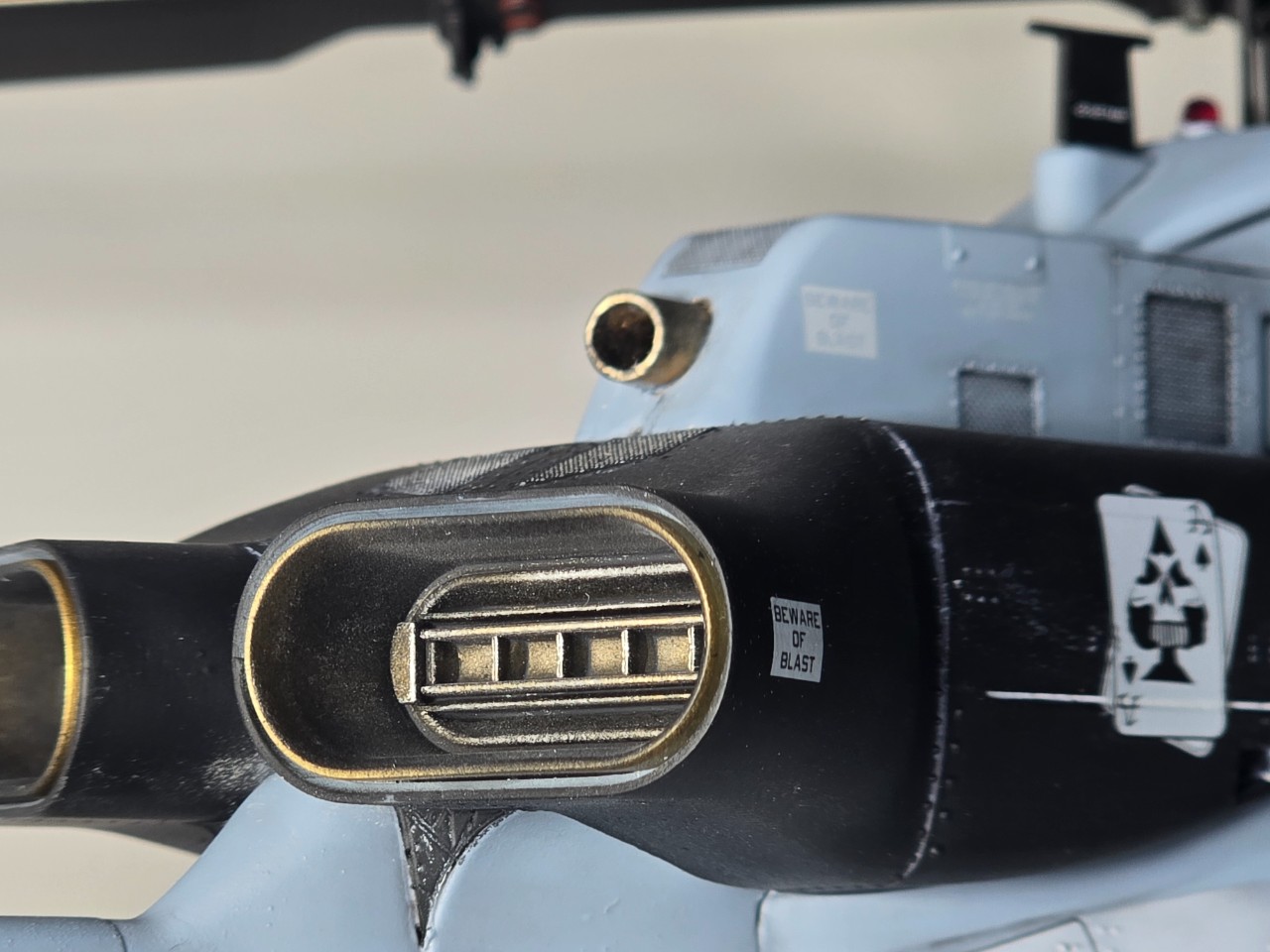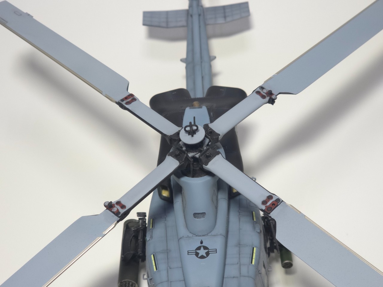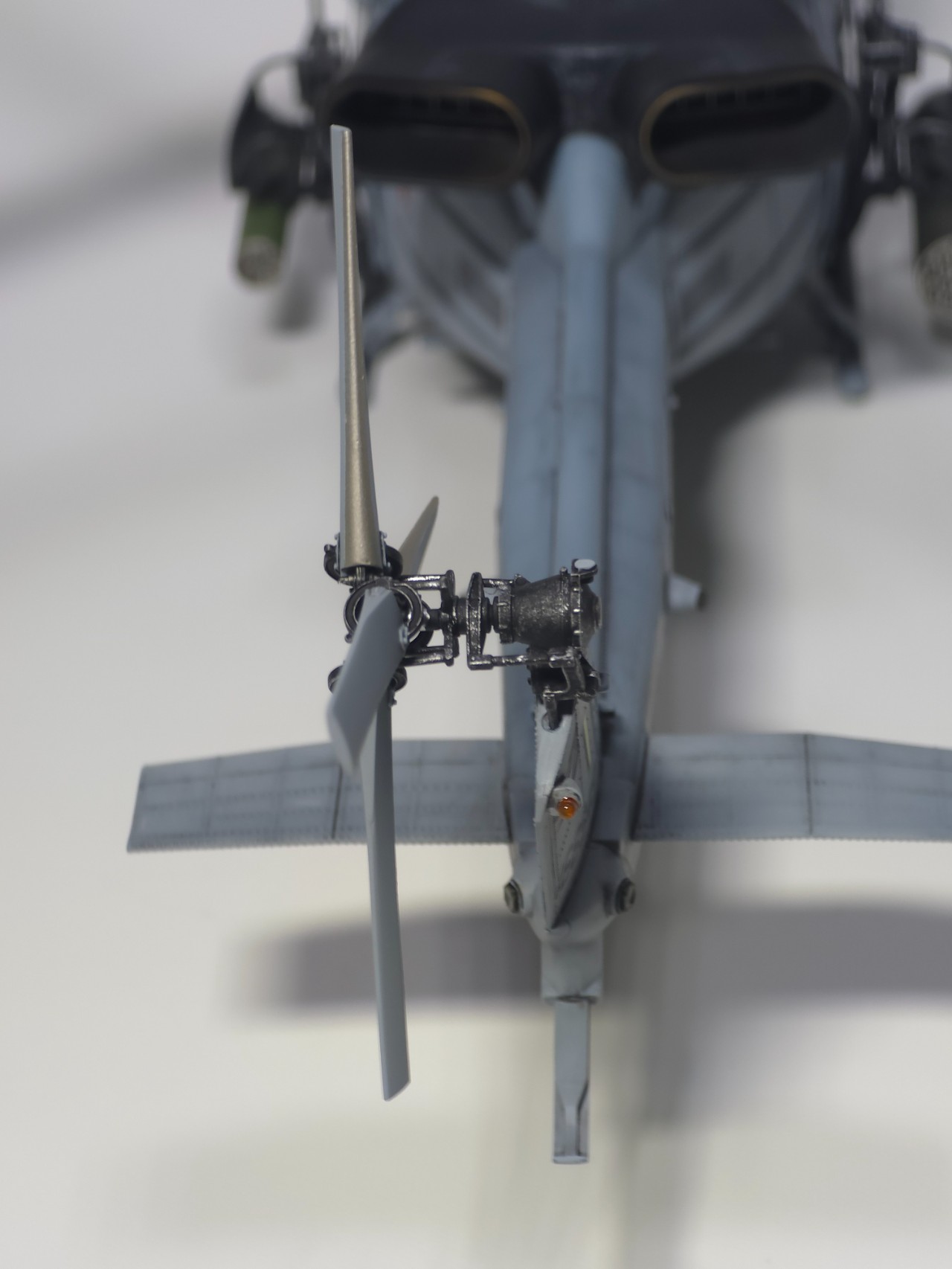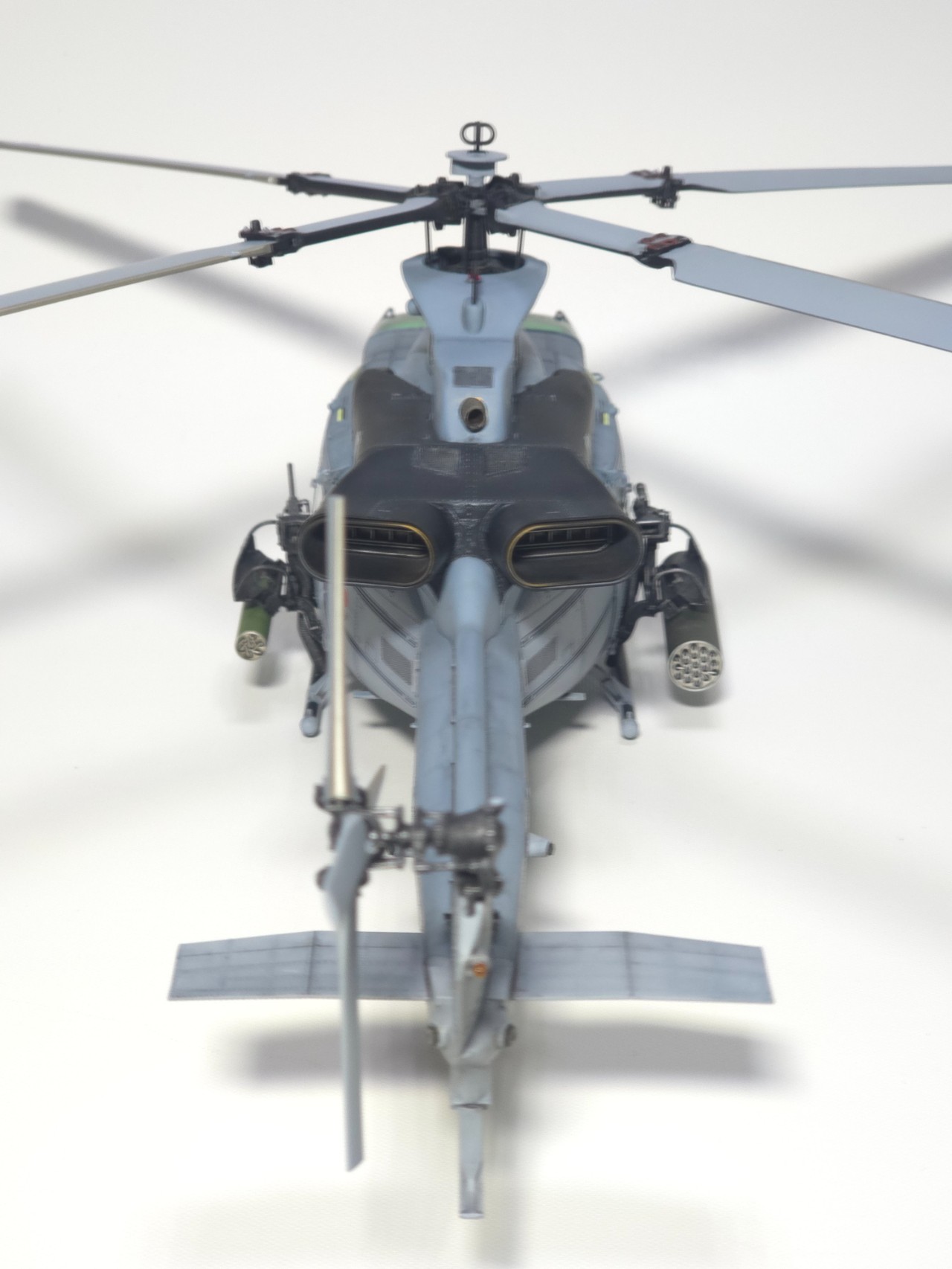 플레어 2종 앞,뒤로 박아주고 테일로터 아웃풋 샤프트 은색 도색, 전,후방 미사일경보기 유광 클리어 처리 했습니다.