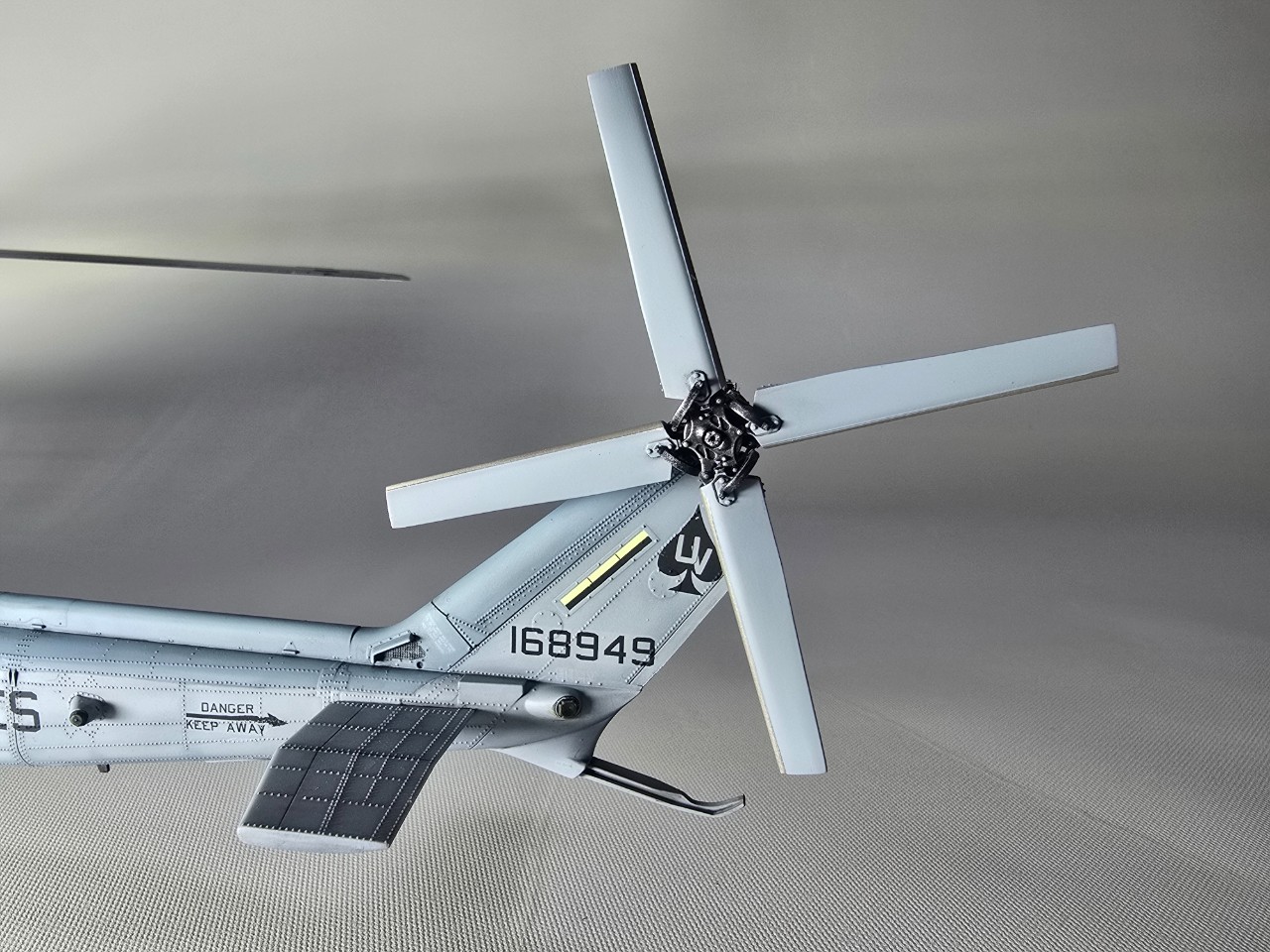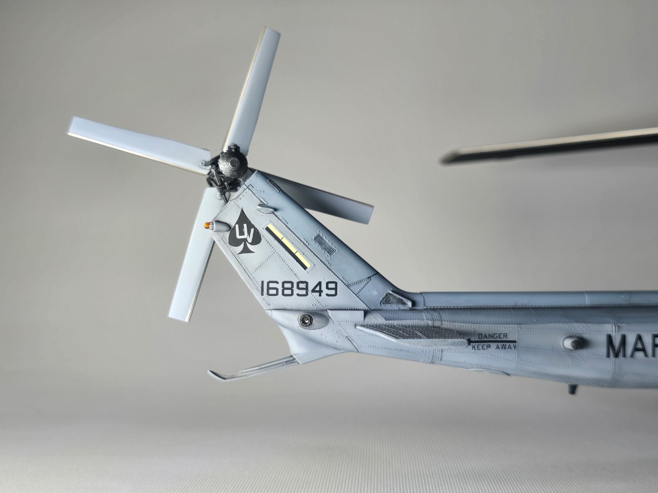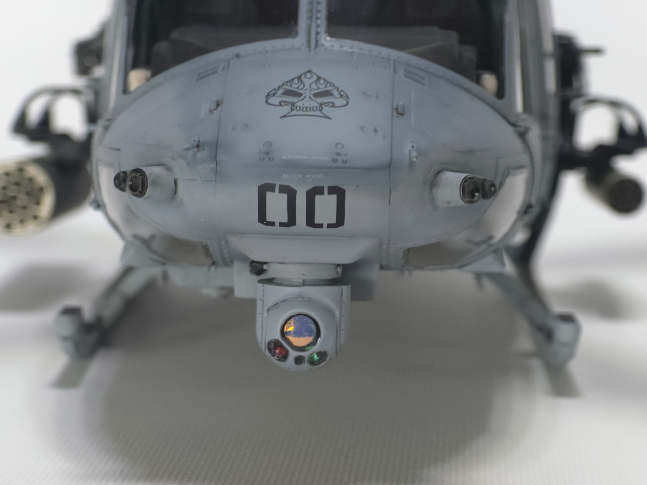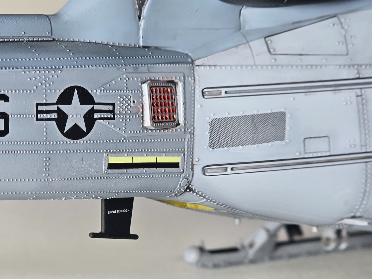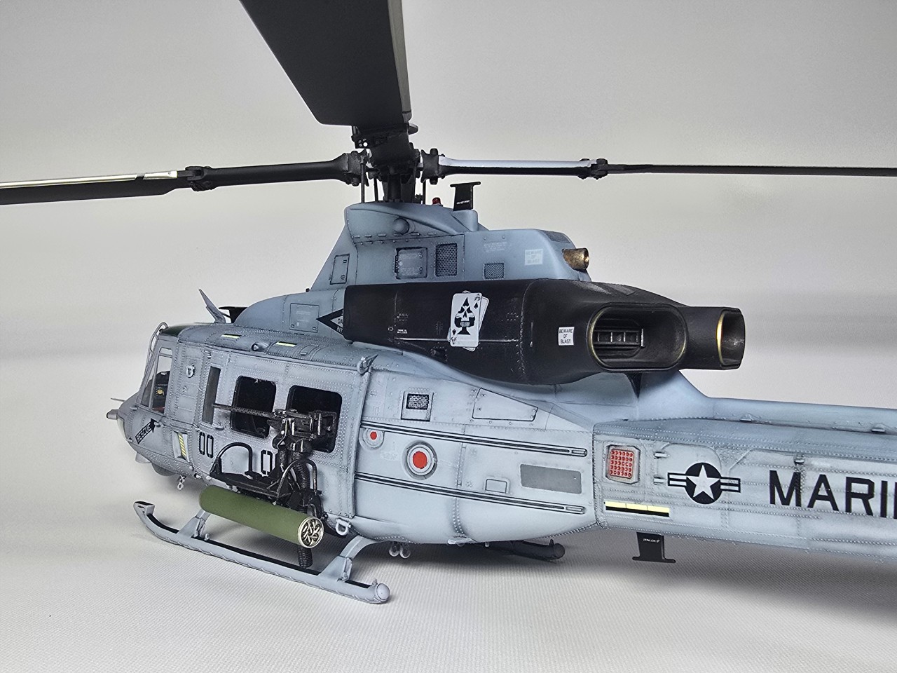 플레어 2종 앞,뒤로 박아주고 테일로터 아웃풋 샤프트 은색 도색, 전,후방 미사일경보기 유광 클리어 처리 했습니다.