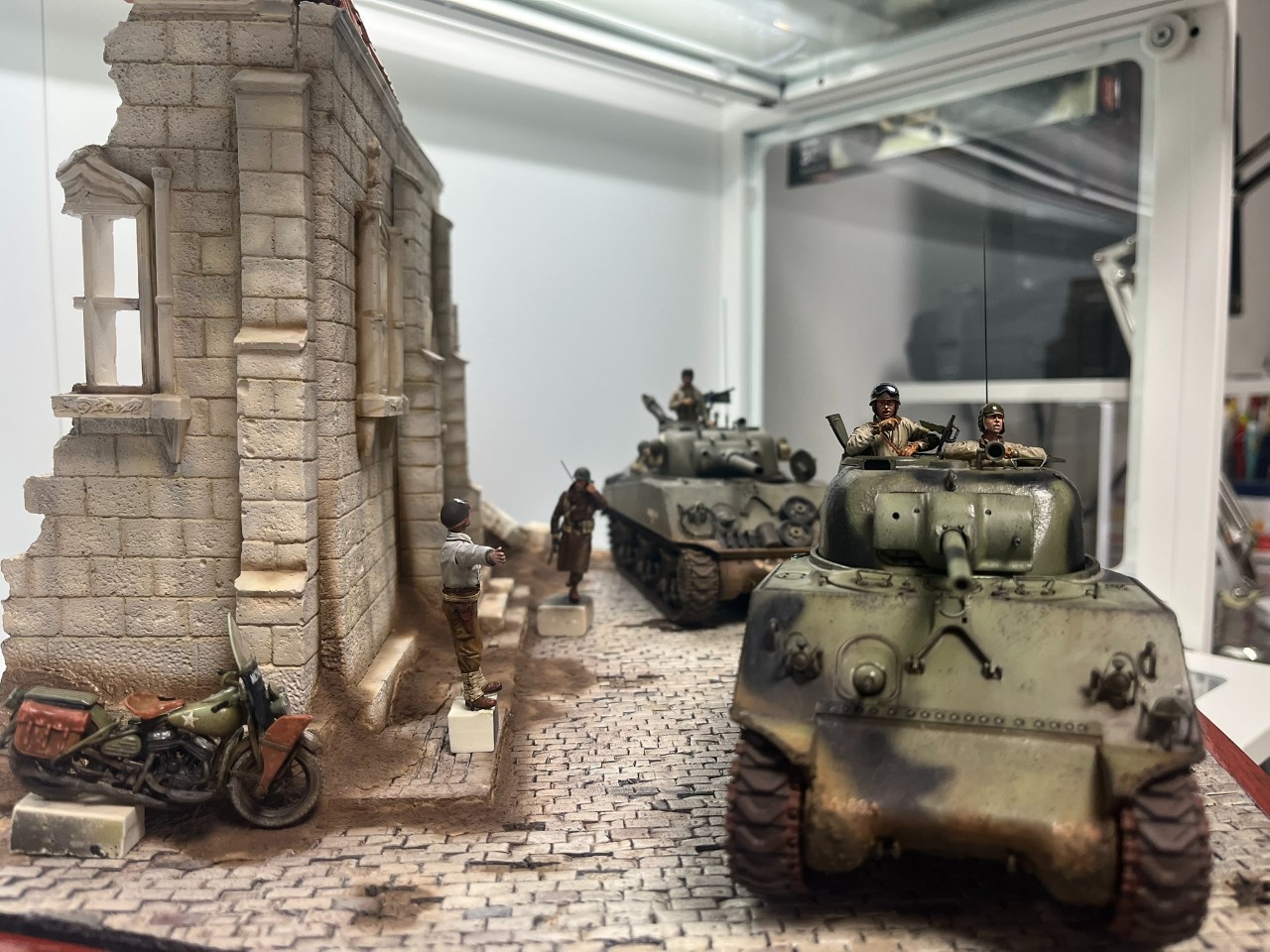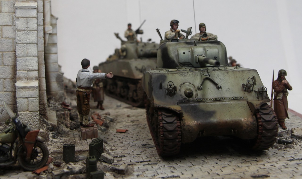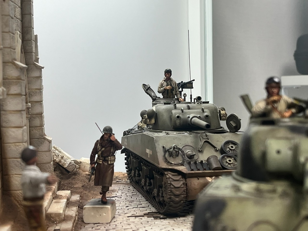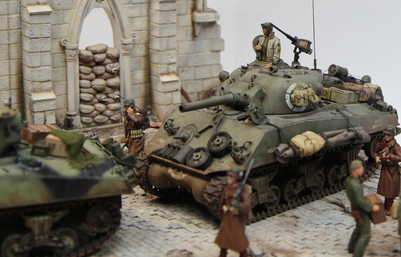 왼쪽에 흐리게 뒷 모습이 보이는 헌병은 링컨 컨츄리 라인인가 하는 오래된 레진 인형인데 105mm 셔면 전차장을 바라 보는 장면을 연출 했습니다. 해드는 알파인 헤드로 교체 했는데, 비율이 잘 맞고, 페인팅도 만족스러웠습니다.