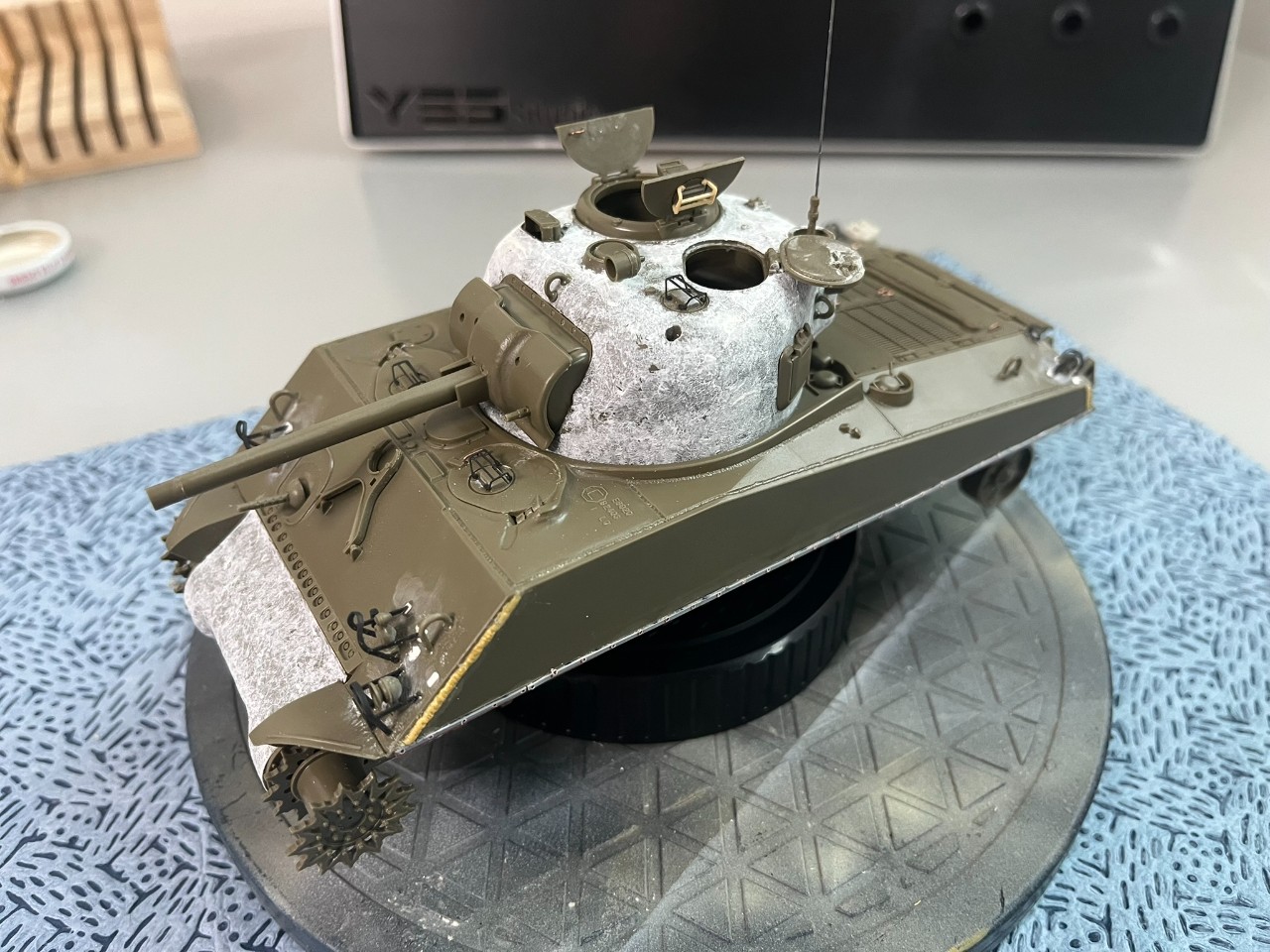 두 대의 셔먼에 각기 다른 패턴으로 기본 색을 칠하고 싶었습니다. 왼쪽 75mm에는 올리브 드랍+ 블랙 위장 패턴을 표현하고 싶어, 셔면의 위장 문의 패턴 자료를 많이 찾아봤습니다. 보통은 블랙 패턴이 일정한 두께의 대각선 방향 직선으로만 칠해져 있어 그 다지 멋있어 보이지가 않았는데, 어느 날 우연히 인스타그램에 어떤 외국 고수 분이 저런 식의 블랙 패턴을 칠하신 걸 보고는 '고증은 모르겠고 칠하고 싶은데로 칠해보자' 하고 과감히 표현해 봤습니다. 결과적으로는 만족하고 있습니다.