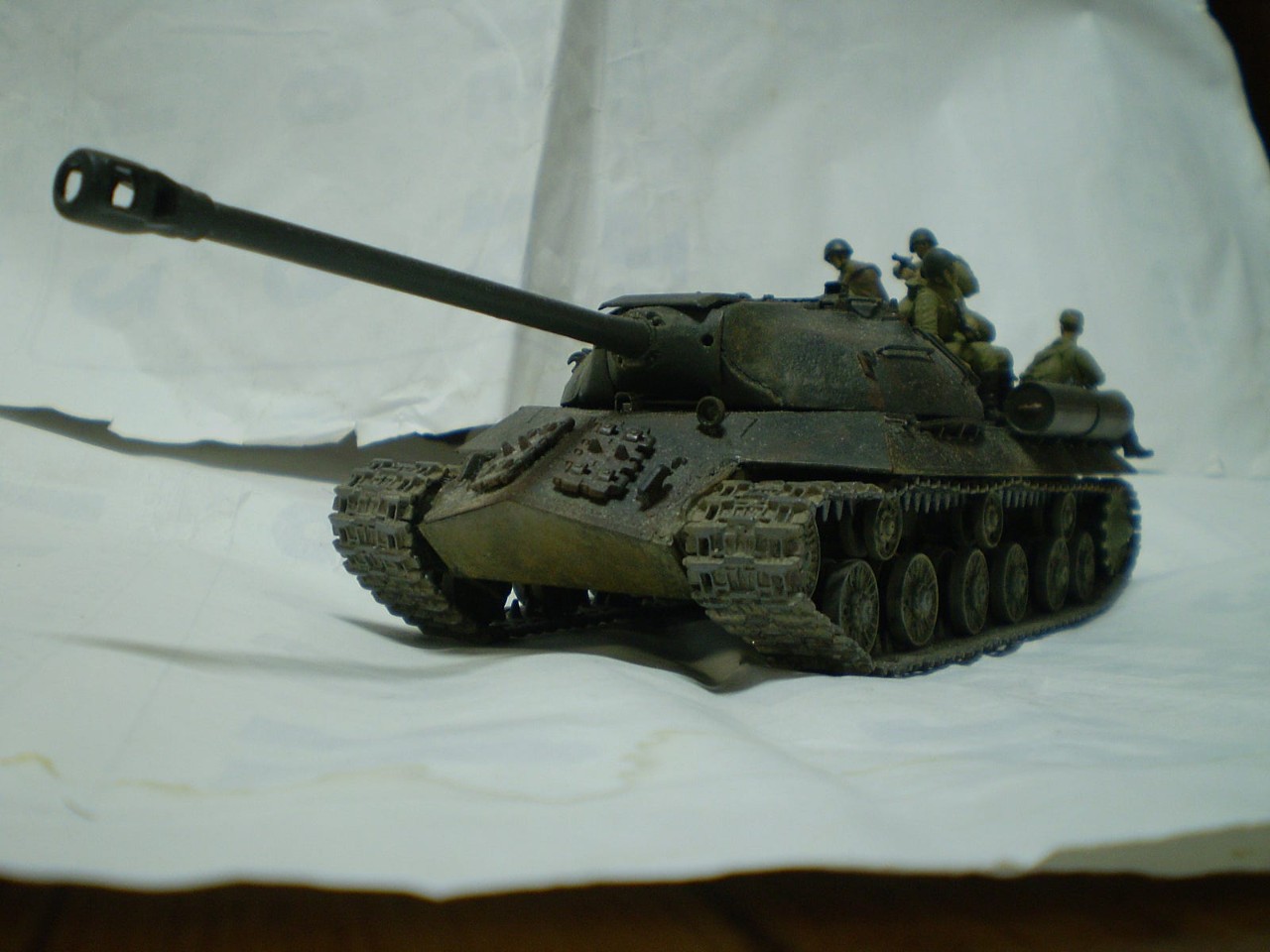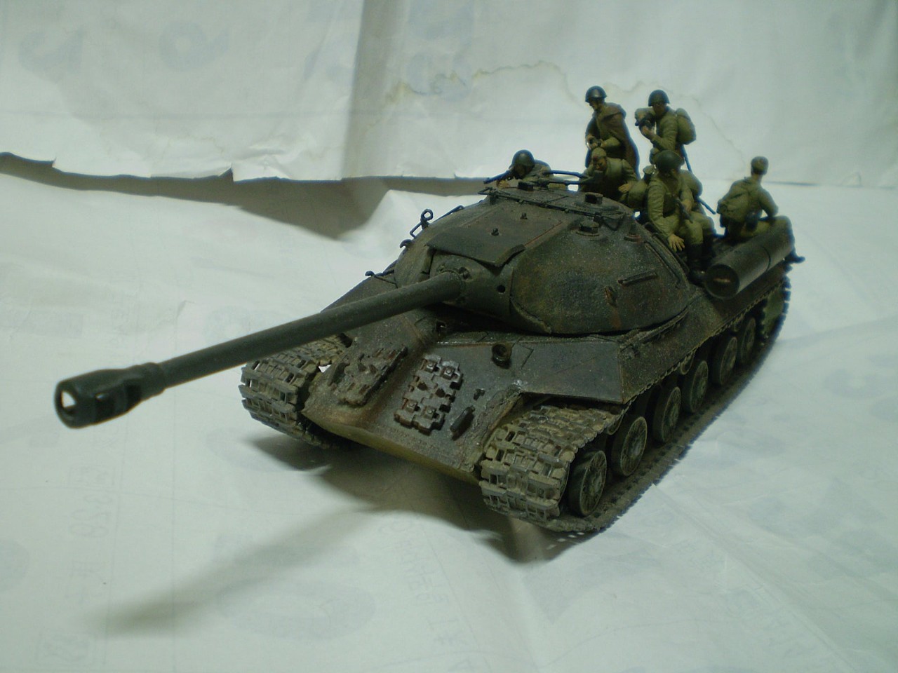 하지 않은 거 입니다.복장 도색은 카키색이 정석임에도 불구하고 카키색과 다크 옐로우를 섞어서 칠해주었구요?차체 도색은 중점적으로 다크 그린을 칠했구요....트럼페터 제 임에도 불구하고 전형적인 js-3로 개조해 주었습니다.트랙은 드래곤 js-2에 포함된 거 입니다.