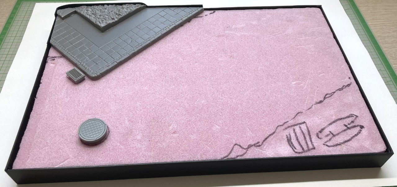 베이스는 아이소핑크로 바닥을 잡고 미니아트 제품으로 보도블럭 부분과 하수구 맨홀 등을