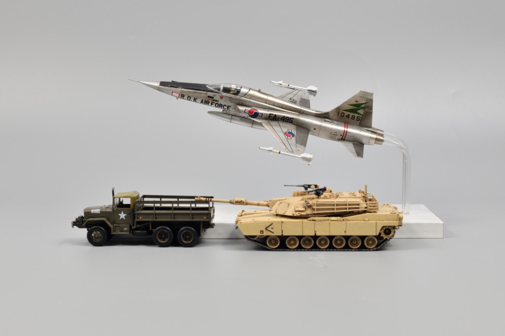 제작사울프팩디자인스케일1/72제작완료2017.11 F-5A "프리덤 파이터" 는 T-38 훈련기를 기반으로 개발된 경전투기이다. 고성능이지만 고비용인 미군 전투기를 구입하기 힘든 중소 규모 동맹국들에게 공급하기 위해 개발됐으며, 성능은 낮지만 저렴한 비용으로 한국과 대만을 비롯한 여러 나라에서 선택됐다. 한국공군에 도입된 최초의 초음속 제트기로, 1965년 16대를 시작으로 총 105대가 도입됐다. 뒤이어 도입된 F-4 팬텀이나 F-5E 의 유명세에 가려지긴 했으나, 2005년 퇴역할 때까지 오랜기간 한국공군에서 사용됐다. 간단한 레이더조차 없어서 조종사의 눈에 의지해 임무를 수행해야 했지만, 이런 단순한 구조로 인해 이륙 소요시간이 짧아 종심이 짧은 한국의 실정에는 잘 맞았다고 한다. 미국이 군..