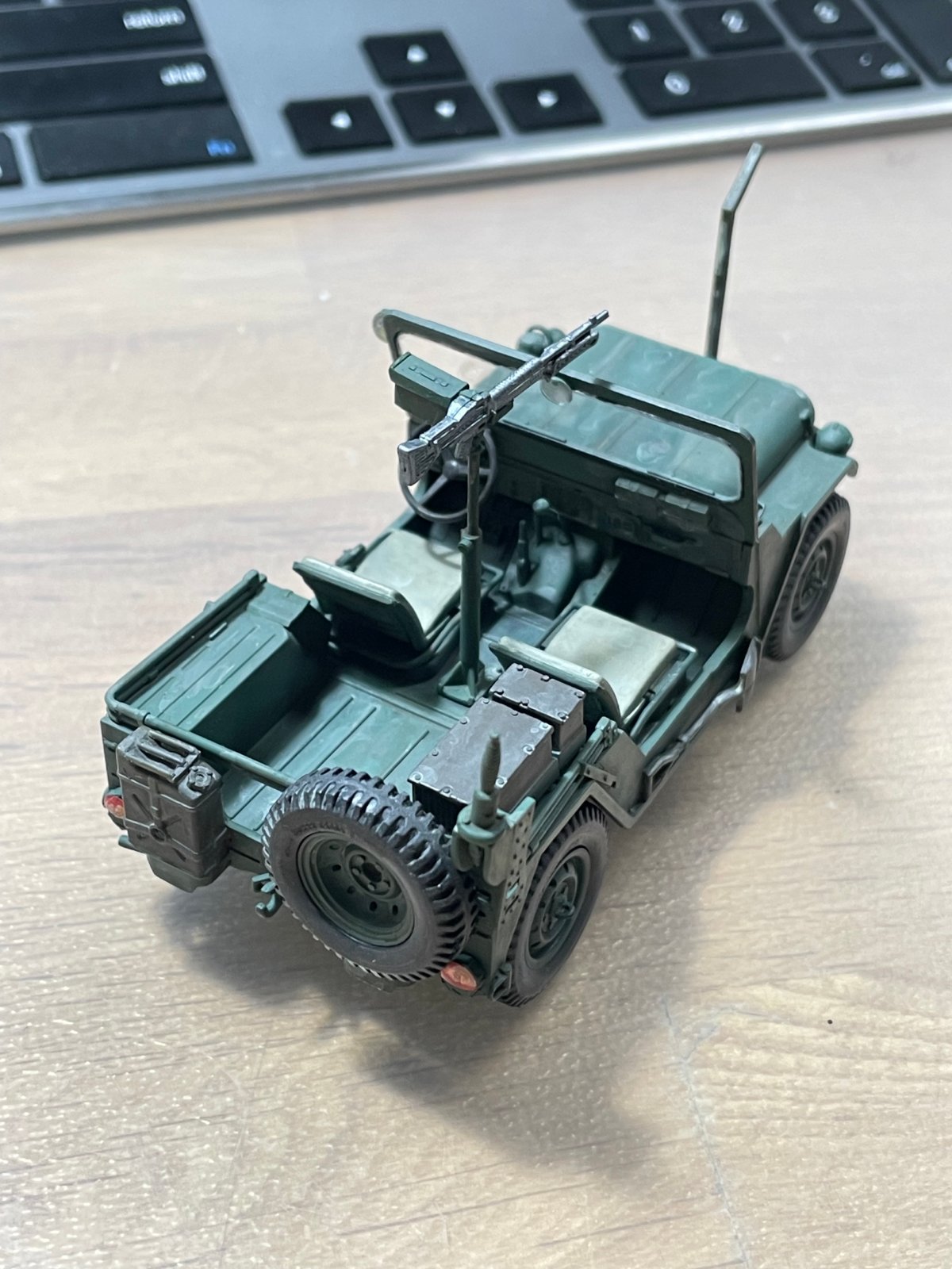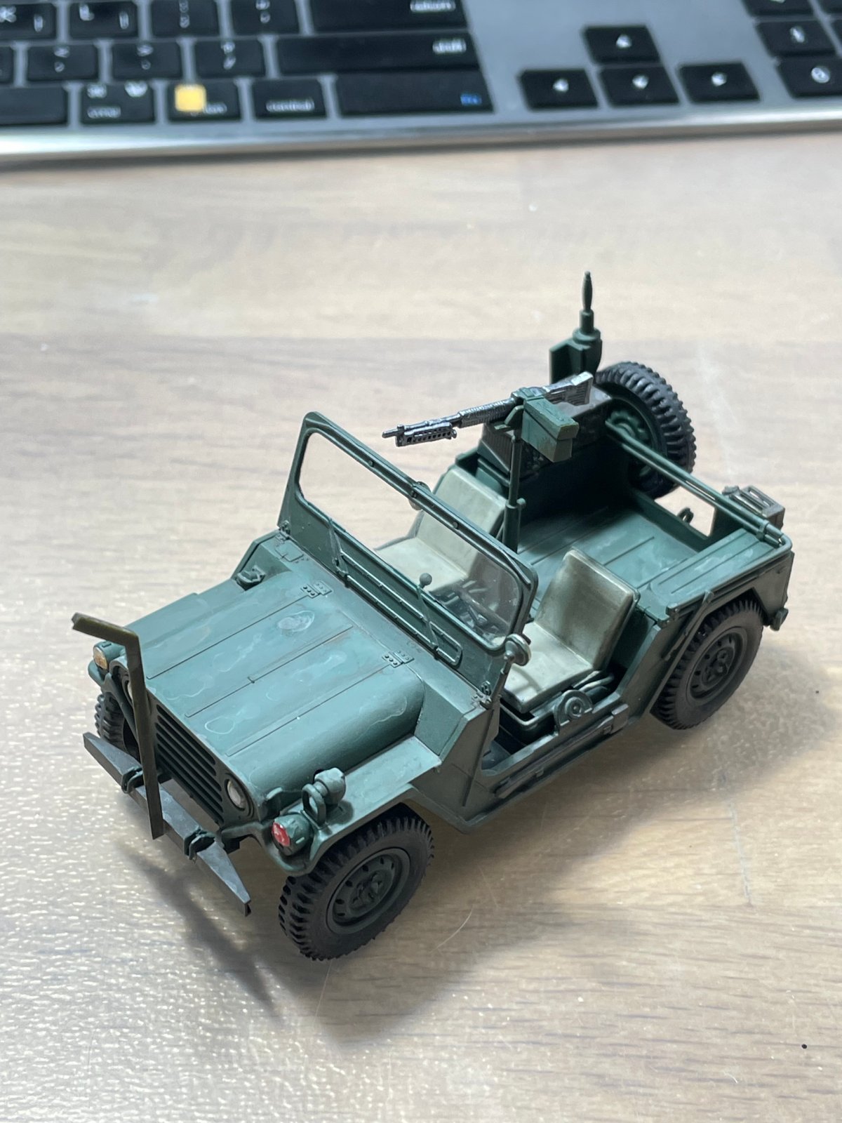[질문] --> 얼마 전에 만든 모형이야. 도색을 여기까지 진행한 적이 별로 없어서 스스로는 좋아 보이는데, 사실 드라이브러시로 하이라이트 표현하는 거나 웨더링은 제대로 안 들어갔어. 게다가 마지막에 옅은 색으로 묽게 먼지 표현을 하다가 보닛에 인위적인 얼룩이 생겼어. 바예호 등 아크릴 붓칠 작업이고, 개선할 부분을 알려줘.