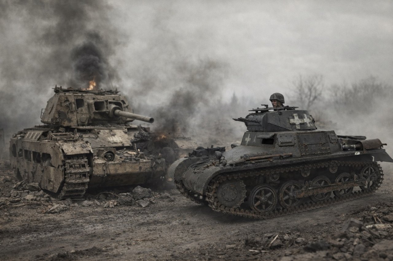 졸작이 되어버린 저의 1호 전차 사진을 가지고 챗지피티에게 그림을 그려달라고 하였습니다. 프랑스 전선을 배경으로 어느 격파된 전차 옆을 지나가는 1호 전차를 그려달라고 했는데요. 부탁하지도 않은 전차장도 그려주네요. 정체를 알수 없는 방탄헬멧까지 쓰고요.ㅋ