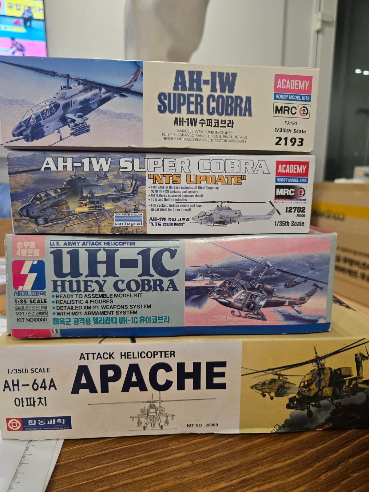 1/35 헬리콥터 프라모델입니다!미조립입니다~ 휴이는 미조립과 제가 만들다 만 거 포함입니다~ 휴이 박스 상태는 안 좋습니다ㅜ