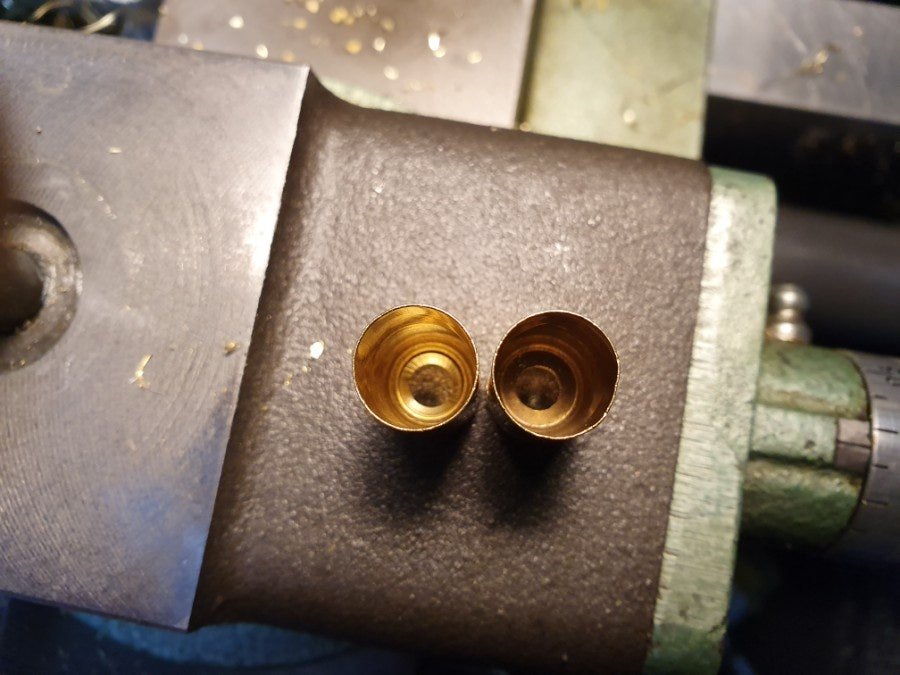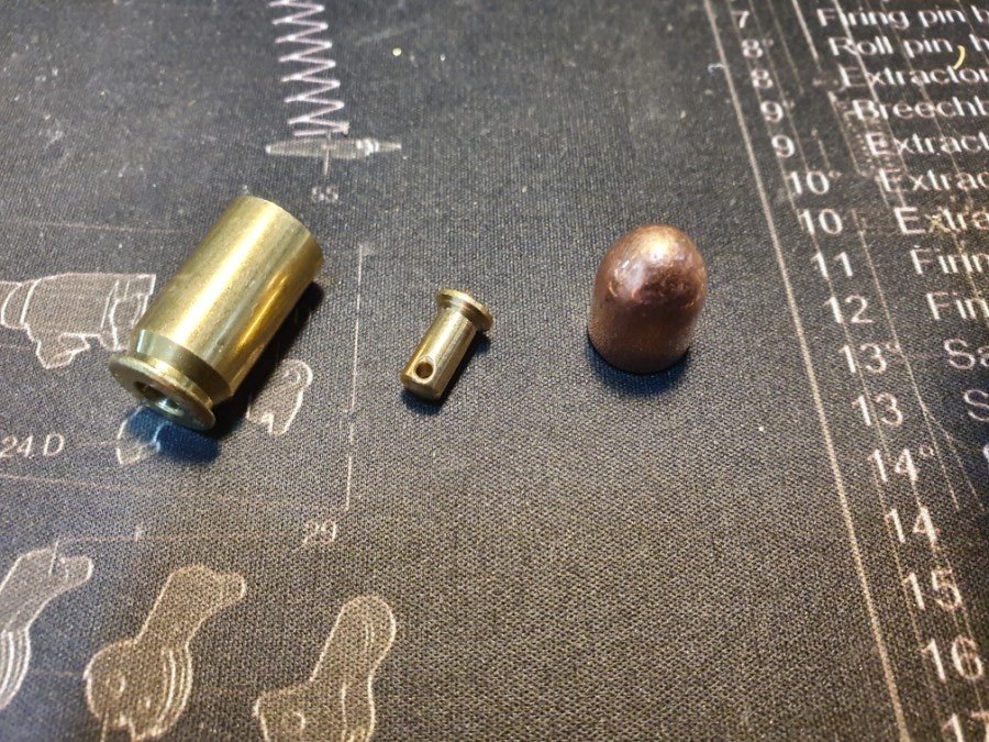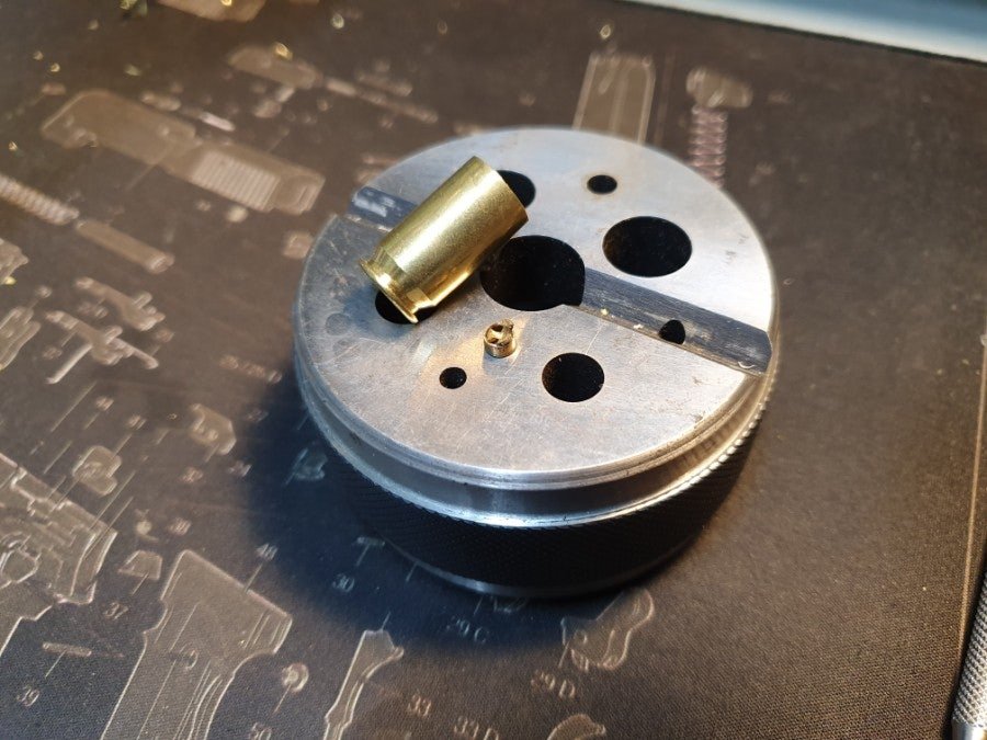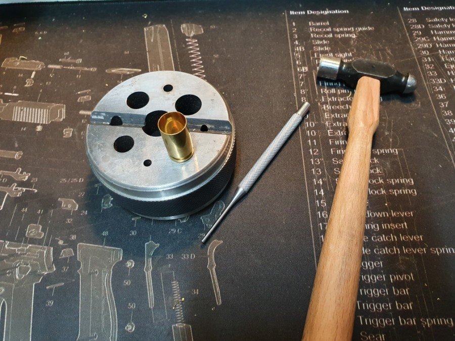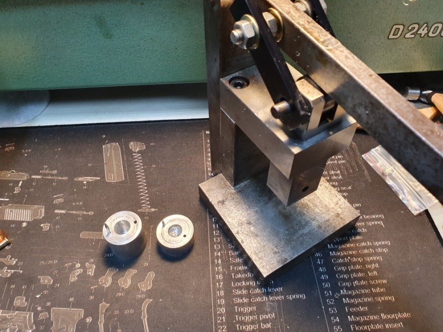 탄두를 일정한 깊이로 삽입하기위한 알루미늄 봉으로 만든 지그와 핸드 프레스