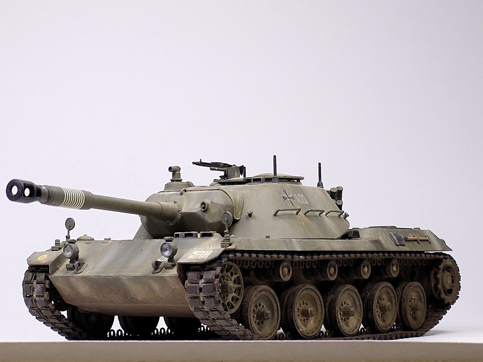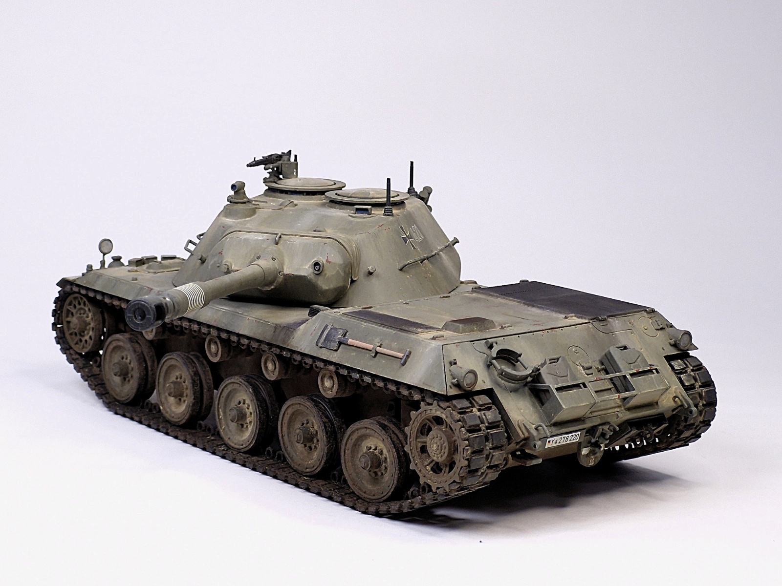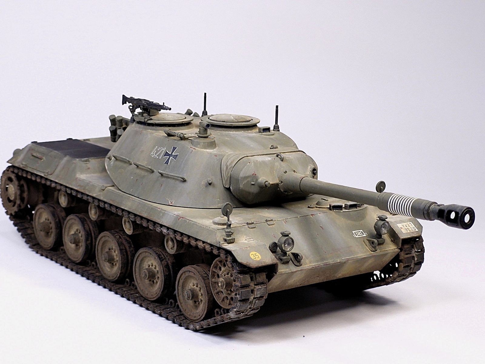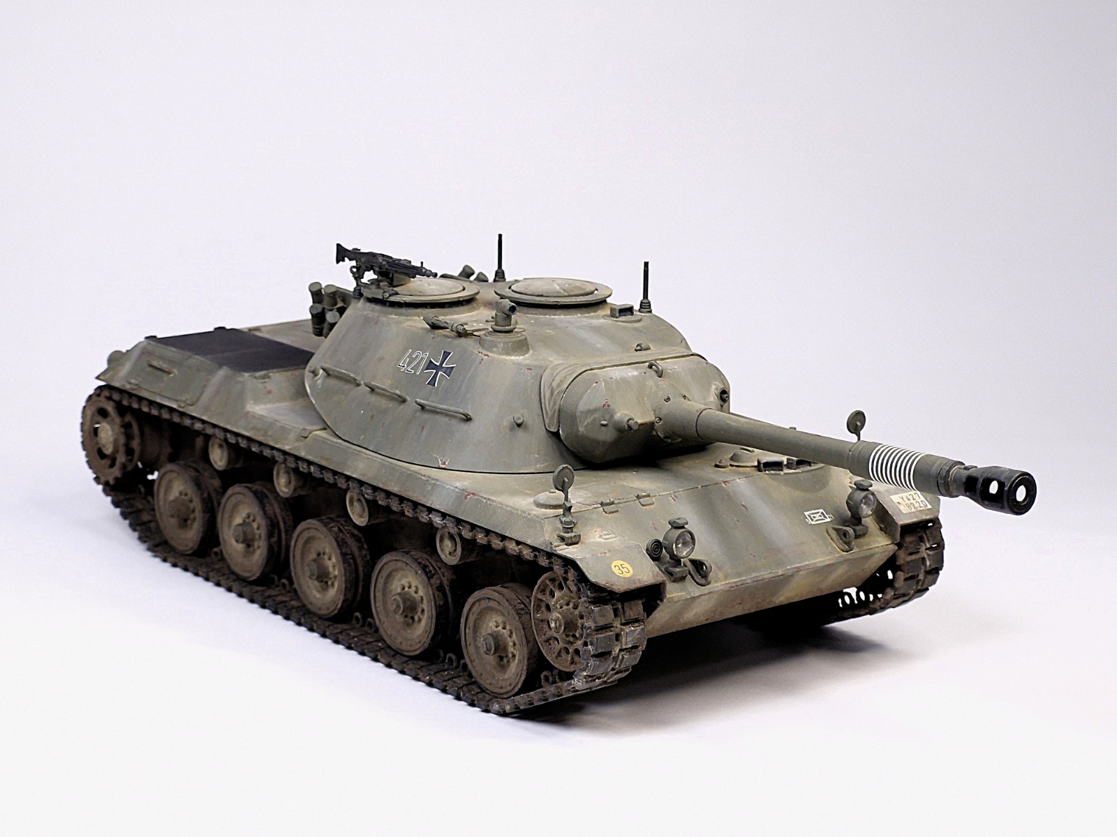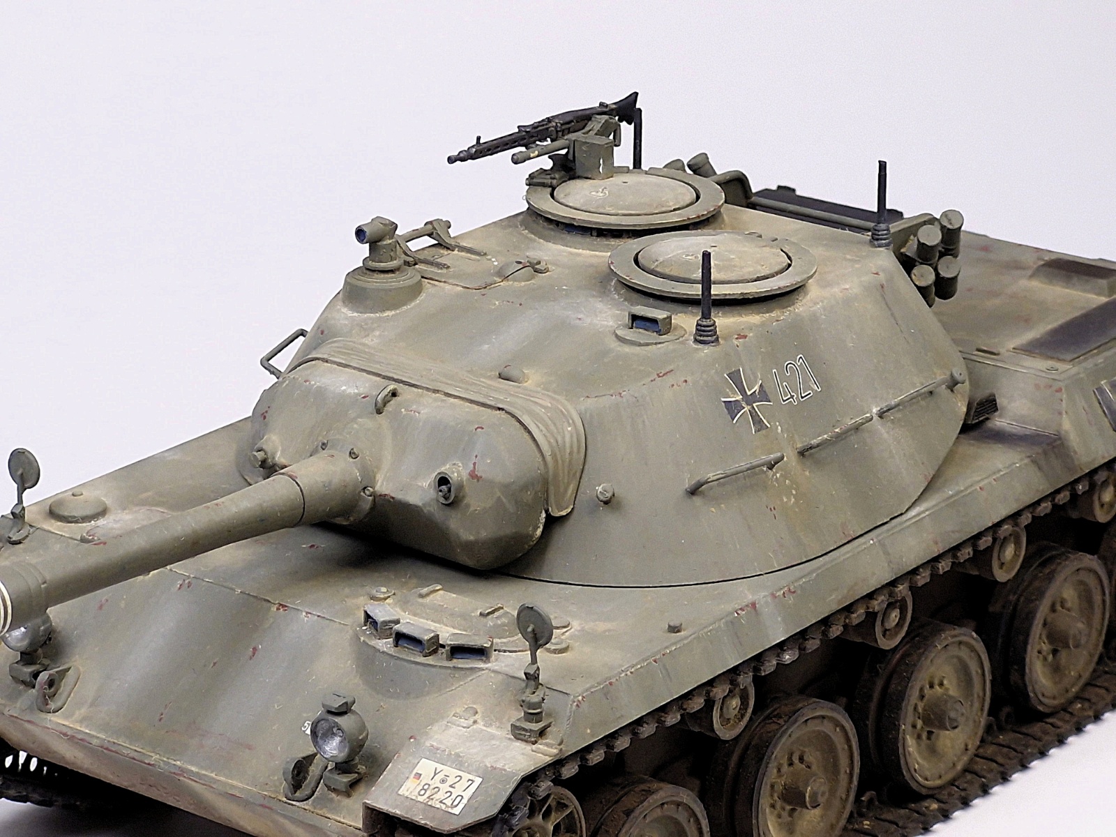 도색은 역시 바예호 아크릴만을 사용했으며, 냉전 초창기의 독일연방군의 단색전차의 색을 내려 했습니다. 처음에는 바예호에어 저먼그레이를 기반으로 조색했으나 생각보다 색이 진하고 녹색기가 많아 고심했는데, 의외로 바예호에어 올리브 드랍을 기반으로 조색해 주는게 정답이더군요. 길은 헤맸지만 수확은 있던 작업이었습니다.