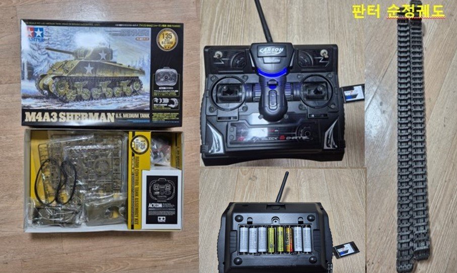 2. 타미야 1/35 4ch 2.4GHZ M4A3 셔먼전차 : 시중가 및 구입가 32만원, 판매가 25만원(택배비 5천원 선불 혹은 착불) 이 키트는 기존 4CH 셔먼에 2.4GHZ 조종기에 플라스틱 연결식 캐터팰러가 동봉된 버전이었습니다. 연결식 캐터팰러는 한번 조립해보니 내구도가 약해 기존 고무 트랙 넣어드립니다. 진짜 RC 구동용 캐터팰러는 메탈 프리울 별매 사시는 편이 낫고, 그게 아니라면 제 상품의 동봉된 타미야 순정 고무트랙 쓰셔도 경사길 안 미끄러지고 잘 올라가고 재밌습니다. 암튼 연결캐터팰러 빠진 가격+할인가에 내놓습니다. 그외 파손 및 분실파츠는 없습니다. 사실분은 연락주세요.