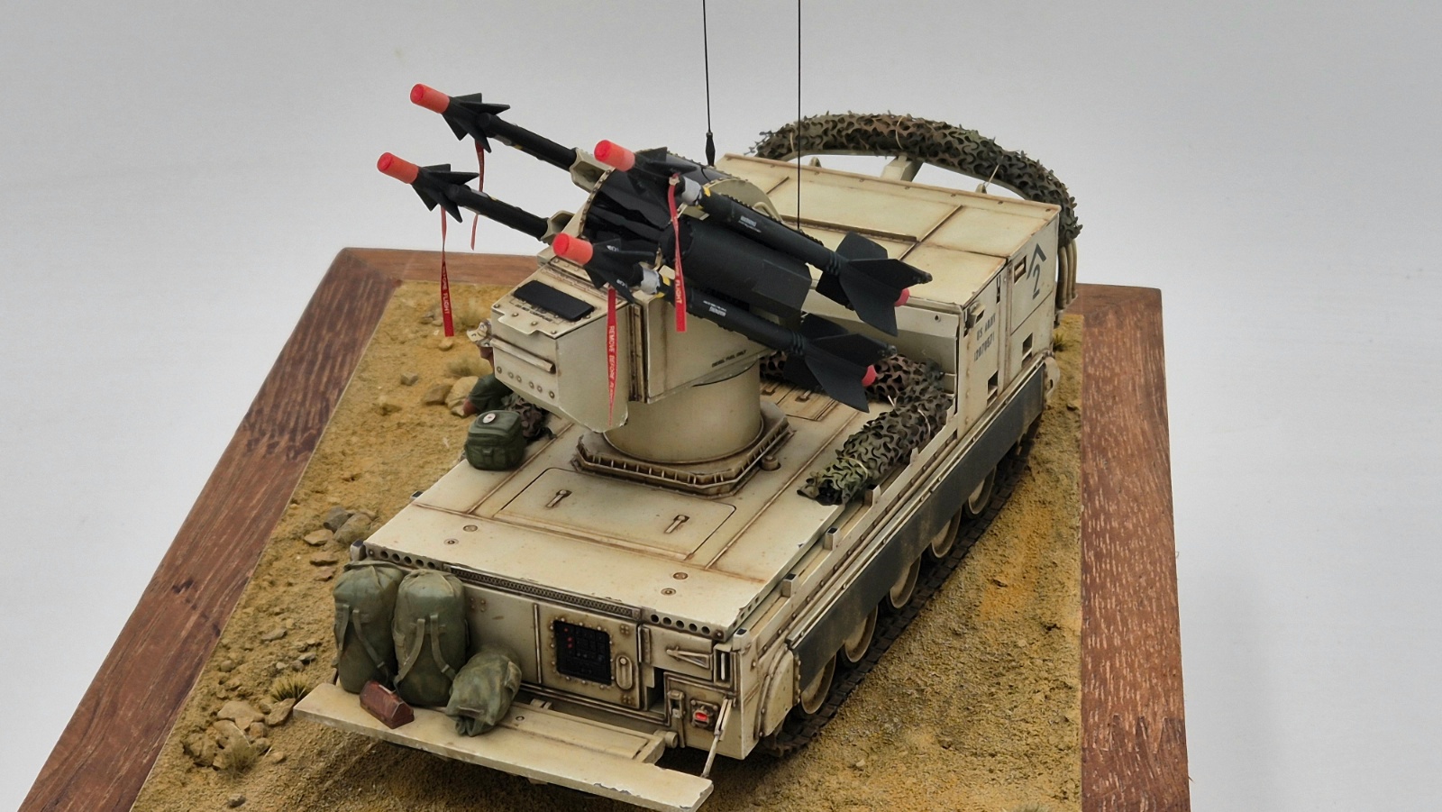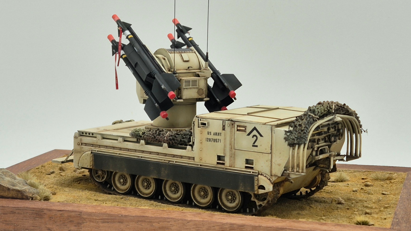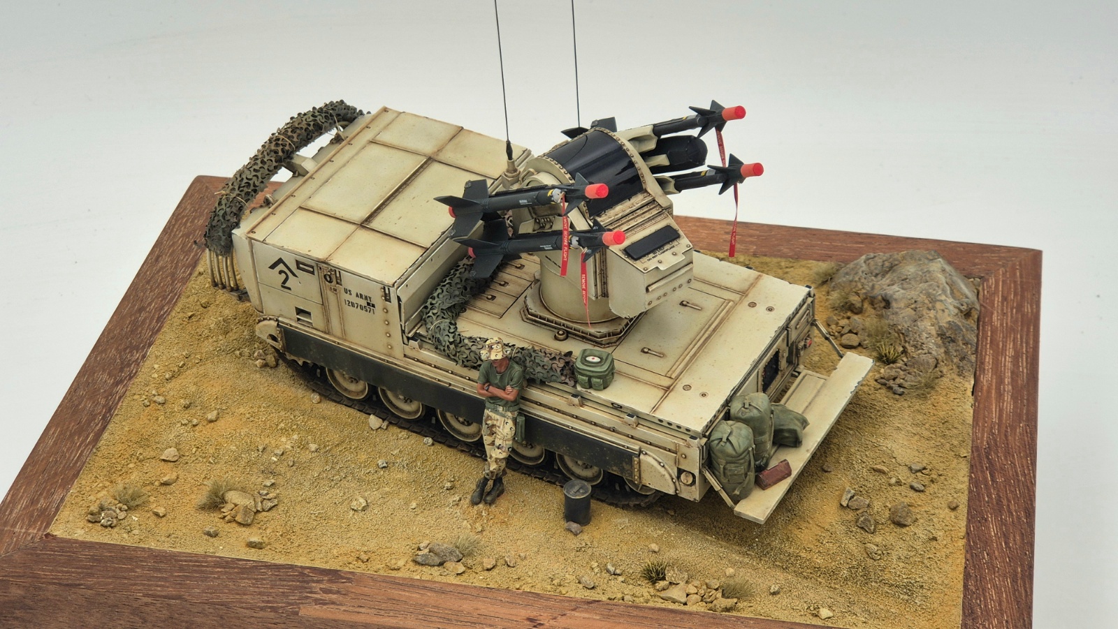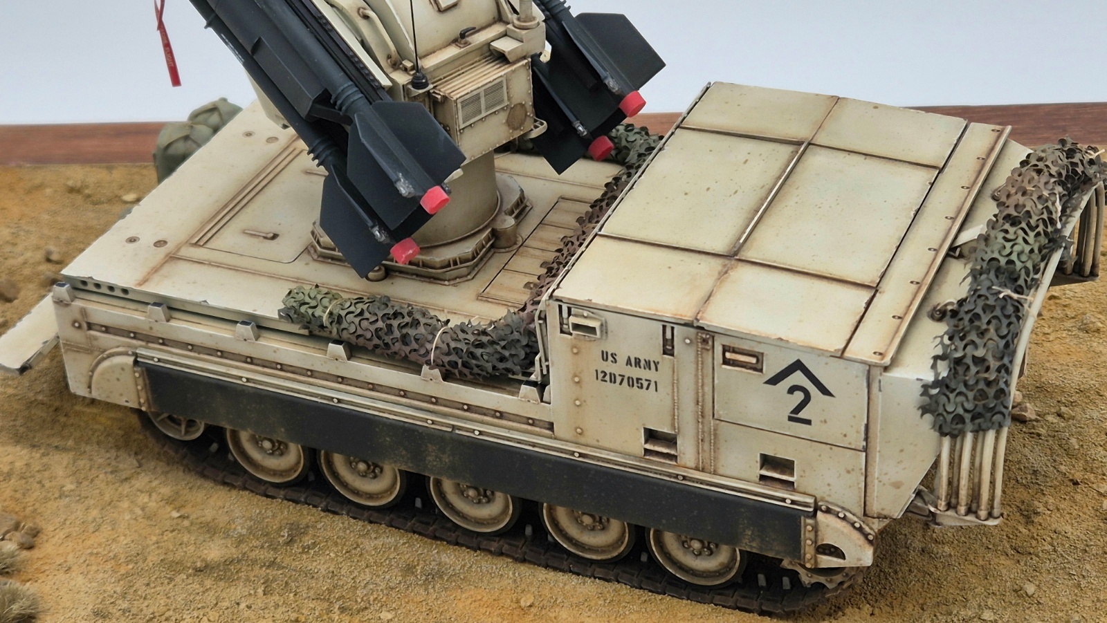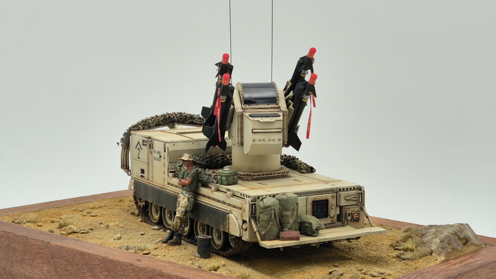 오픈카인 M730A1이지만 내부 디테일이 별로인관계로 닫은상태로 제작하였습니다. MIM-72 Chaparral 미사일은 디테일도 별로고 데칼도 별로라 그냥 만들기엔 심심해서 보호캡도 만들어주고 빨간끈도 달아줬습니다. 미사일 터렛 콕핏은 클리어 블랙으로 도색해서 내부가 보이게해줄 생각이였는데. 안보이네요 ㅠㅠ