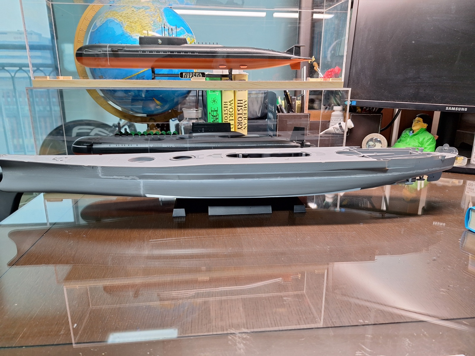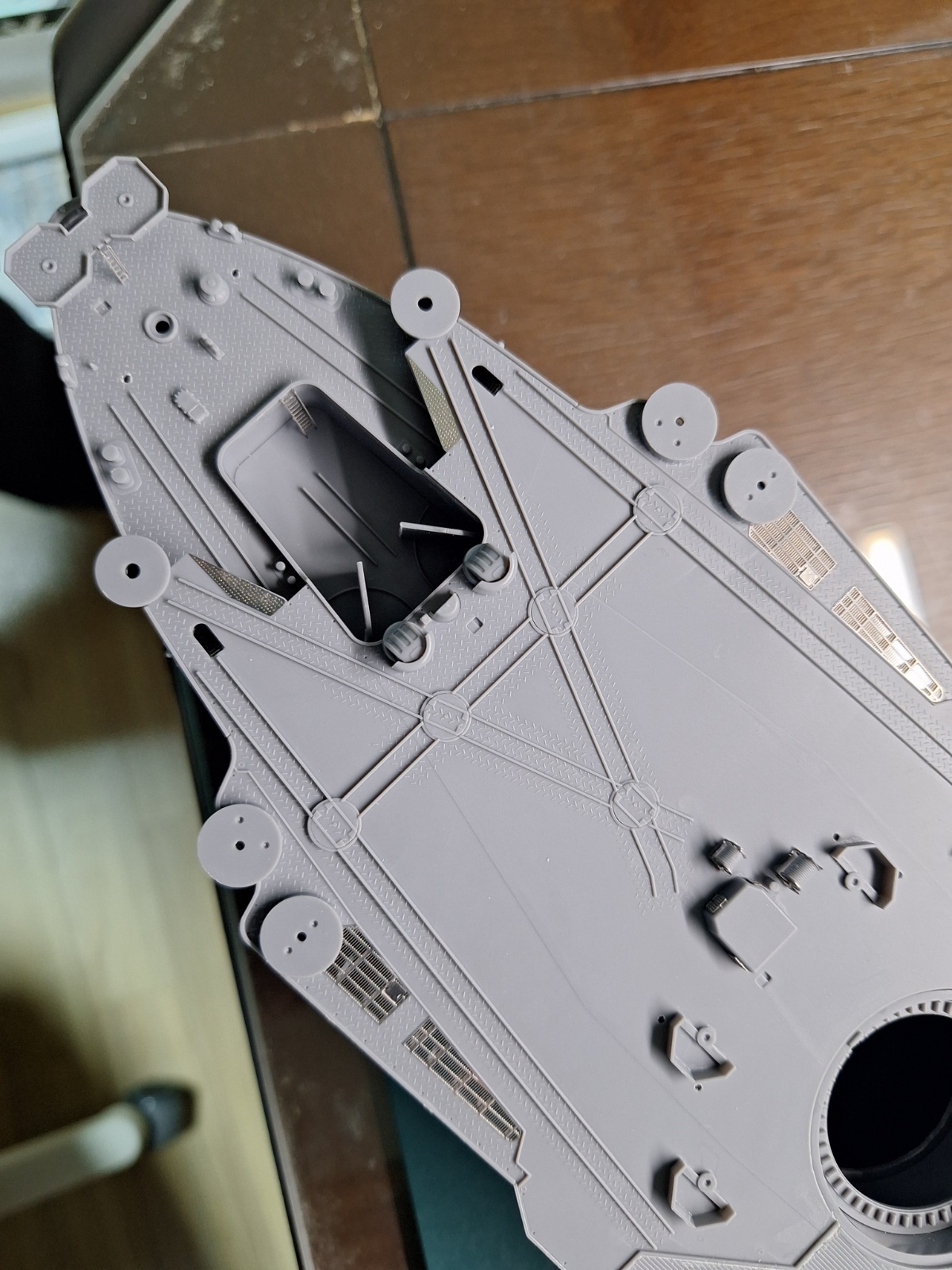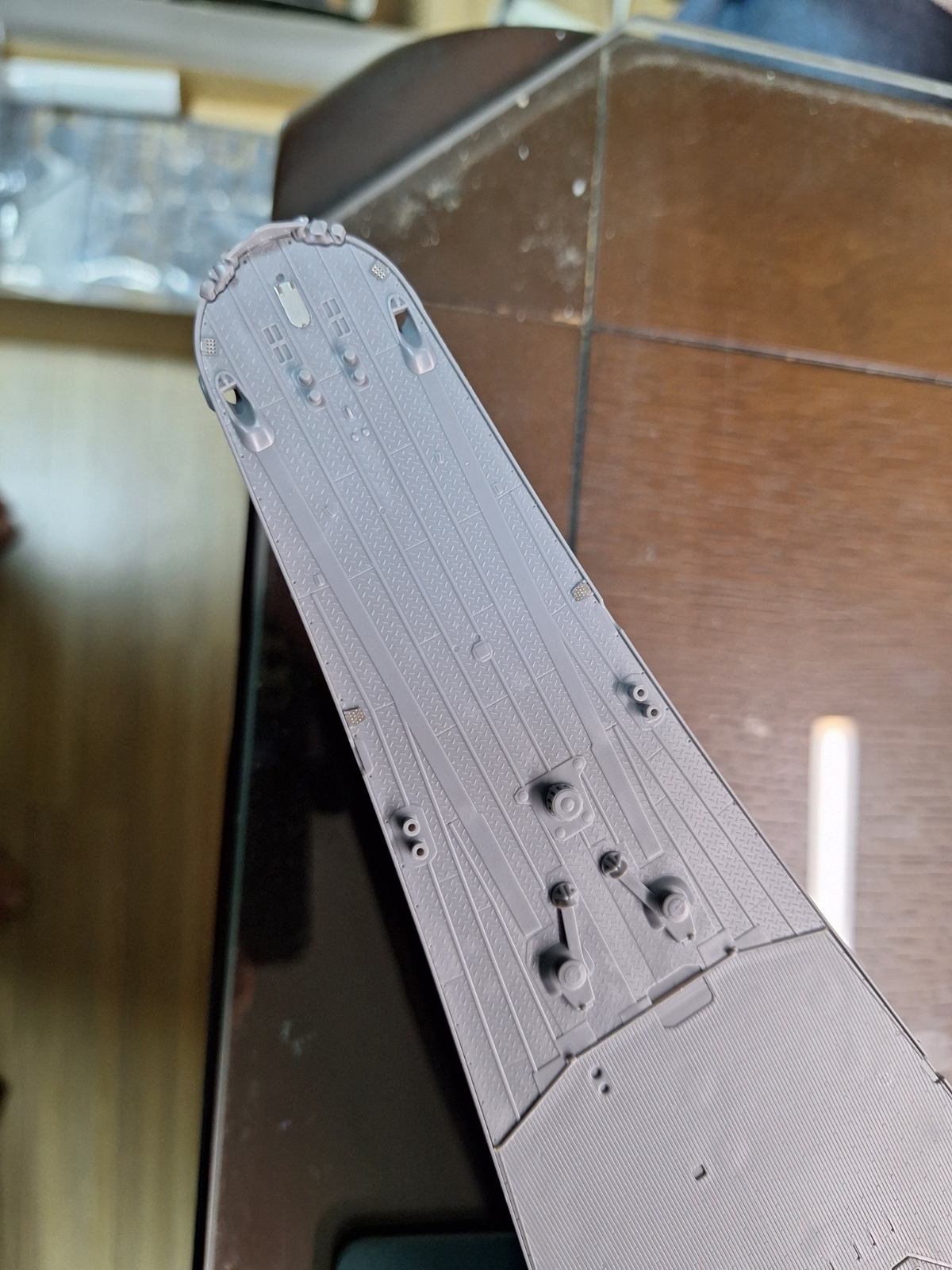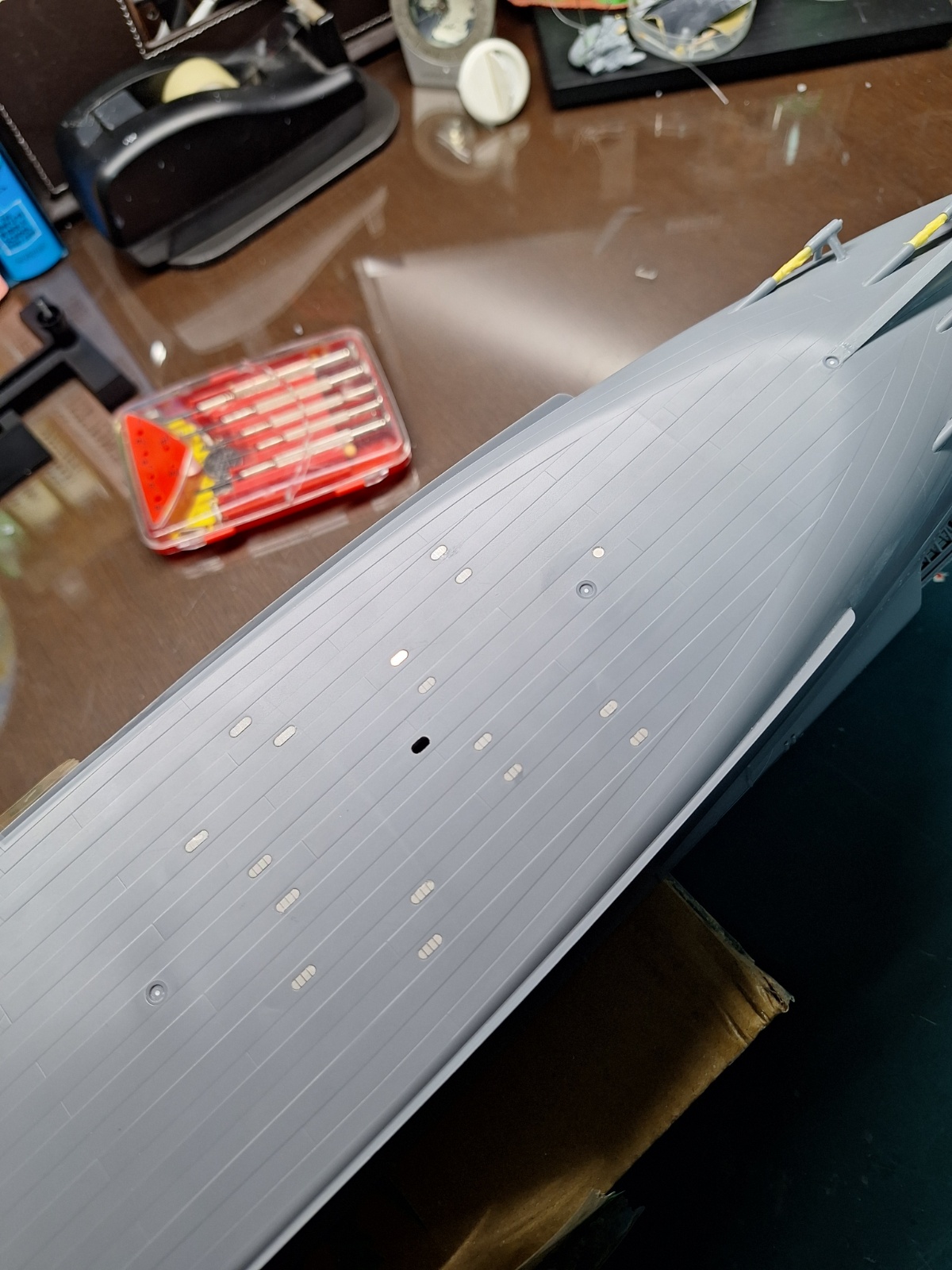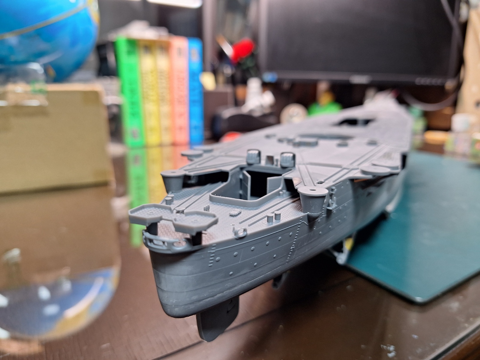 선체 하부, 좌우 선체 판?, 그리고 선수부....이거 전부 단차없이 접착해야 하고, 접합선이 그많큼 많이 생기므로 접합선 수정은 필수인데, 이게 좀 난감한게, 선체 표면에는 구판과 달리 웰딩라인이 얕게 음양각으로 구현되어 있어서 맘대로 사포나 줄을 대기도 그렇게 되어 있습니다. 전 최대한 접합선이 안생기도록 접착을 좀 신경쓰되 생기는 단차는 액상 퍼티로 메꾸고, 모형용 줄로 살짝 갈아 단차 조정하였는데, 일부 웰딩선이 무디어진 것은 어쩔 수 없겠더군요..