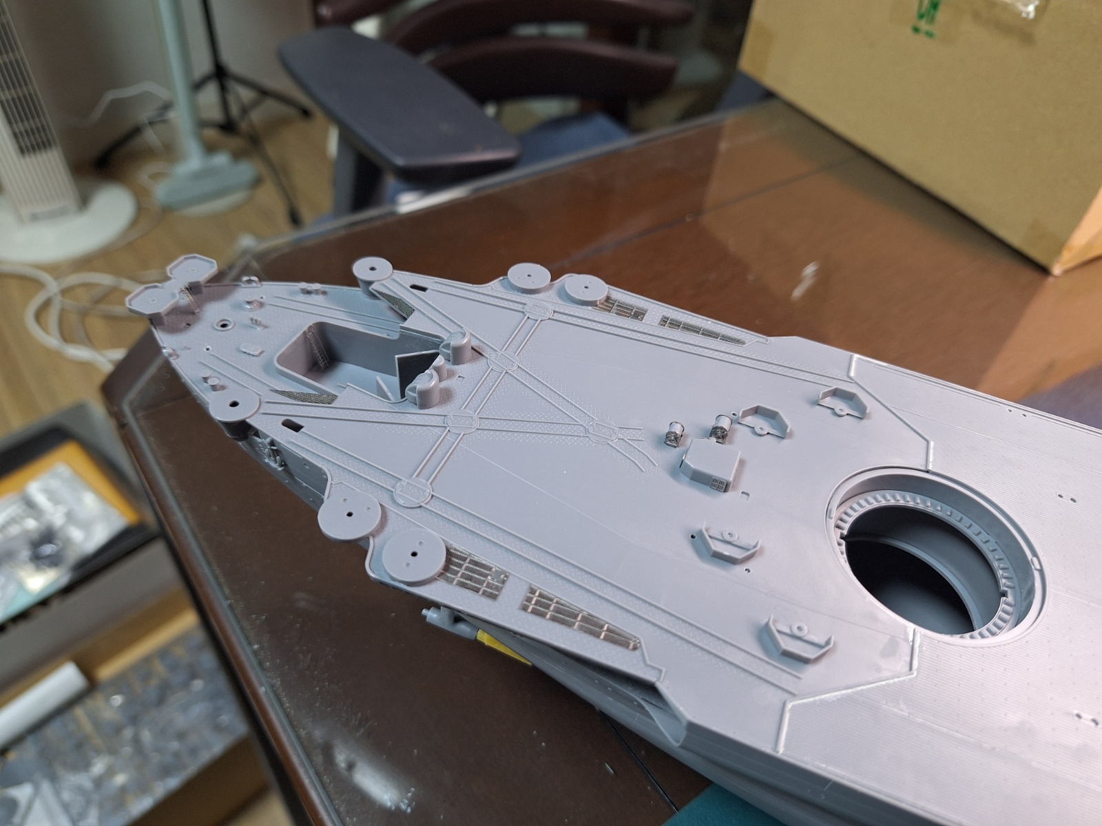 선체 분할이 많다 보니, 아무래도 타미야라 하더라도 약간의 단차들은 있었습니다. 특히 상부 갑판...중앙 갑판은 선체 선수부 감판과 선미 항공기, 보트 계류 구역의 갑판 사이에 Gap이 생기더군요....플라스틱 퍼티로 메꿔줘야 했습니다. 나중에 중앙 갑판에는 목갑판을 부착할 예정인데, 미리 Gap을 메꿔줘야 나중에 목갑판 손상을 안줄거 같더군요...