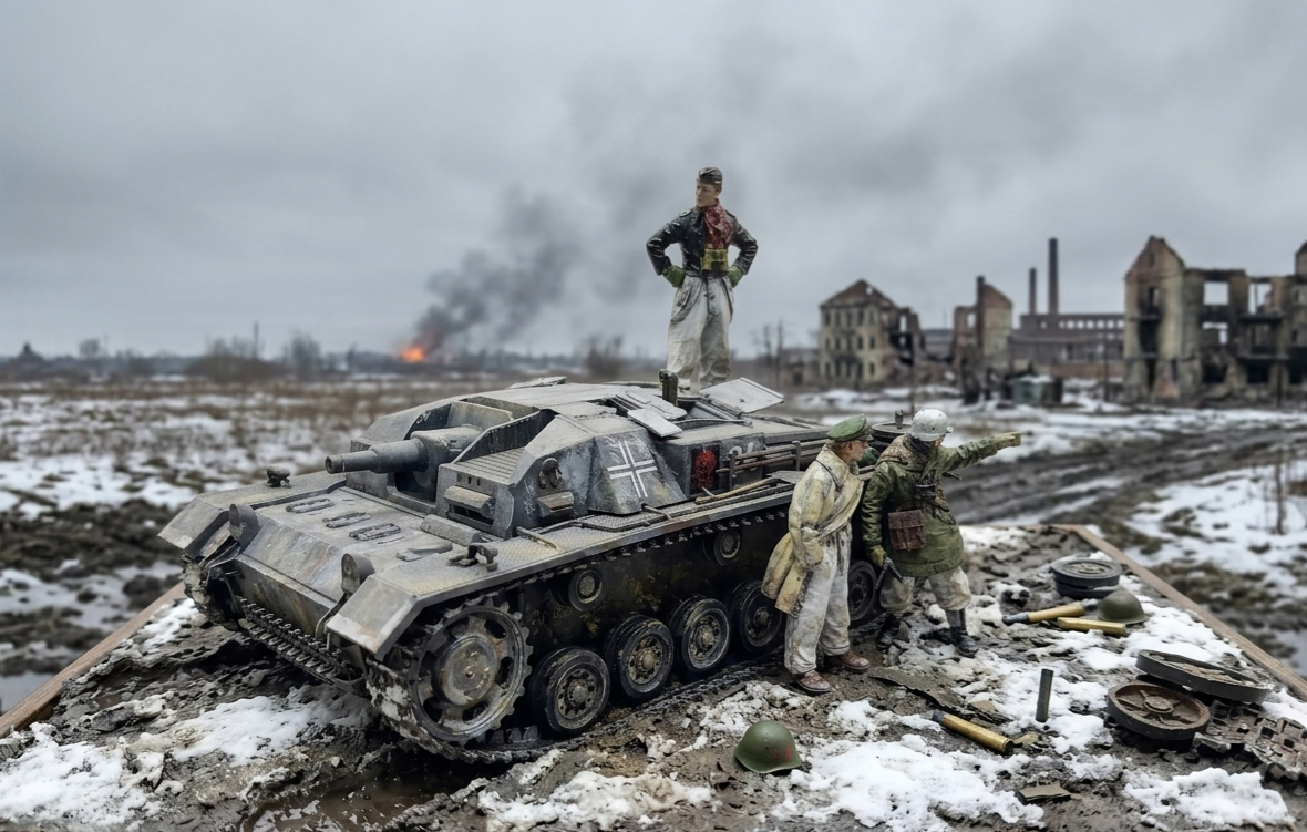 타미야 3호 돌격포와 알파인 인형만 실제, 배경은 AI 입니다.