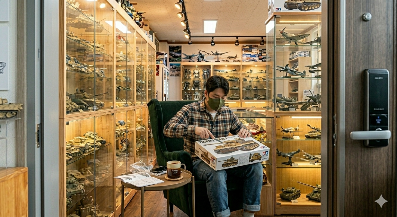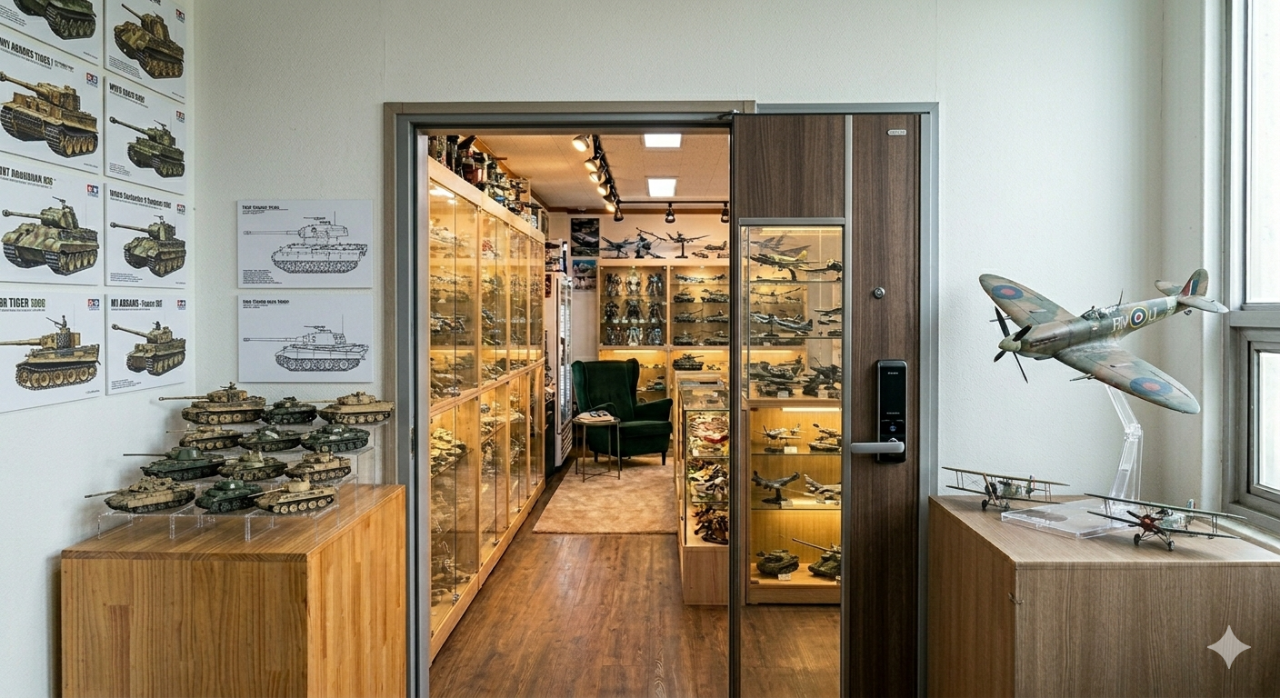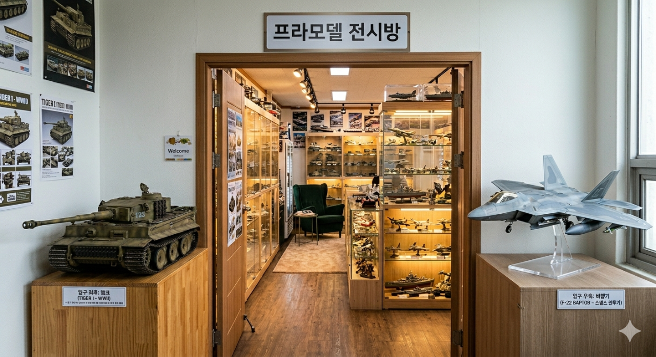 프라모델 전시방 사진을 만들어줘.입구 좌측에는 탱크 우측에는 비행기 가 지키고 있고