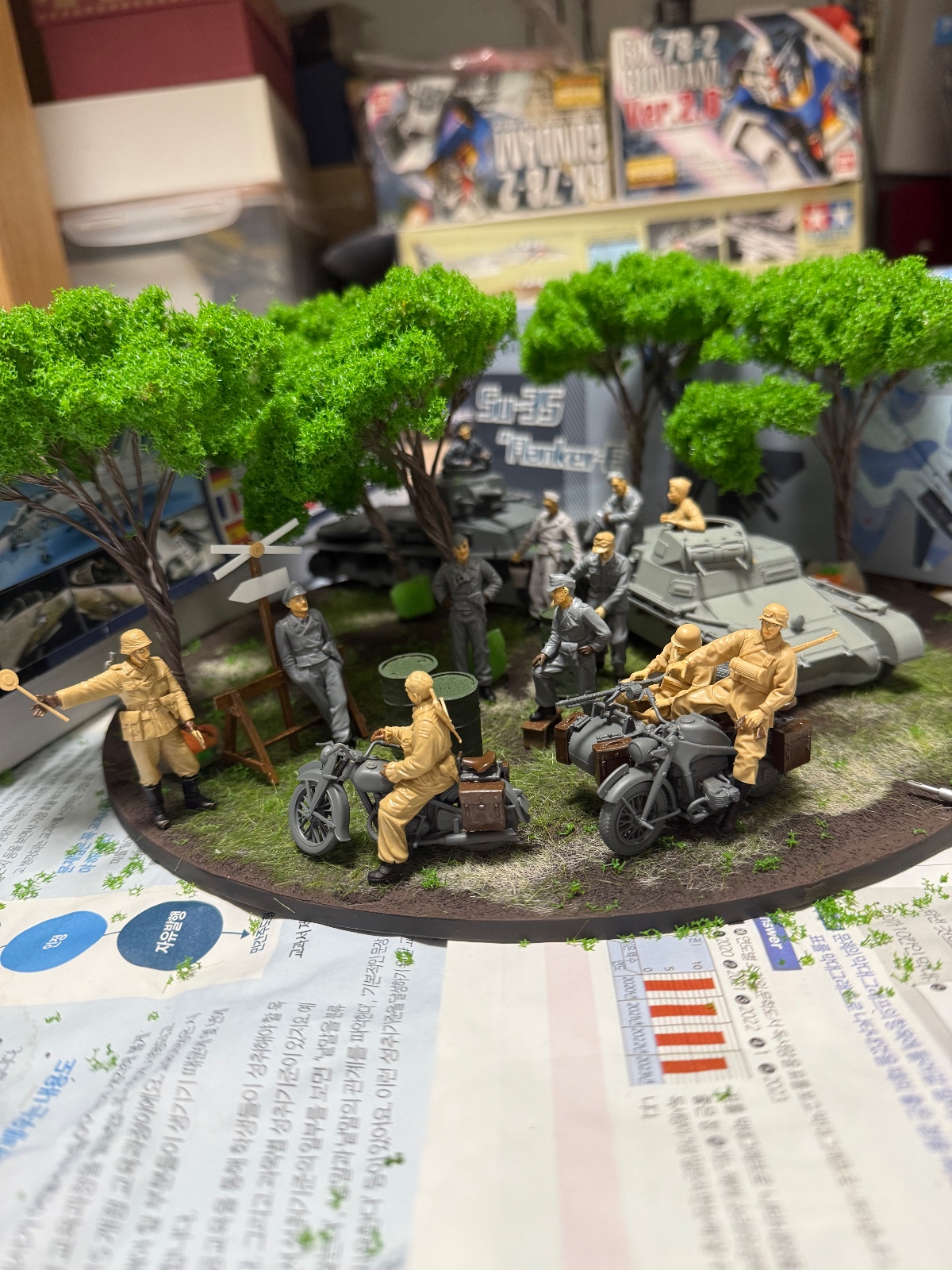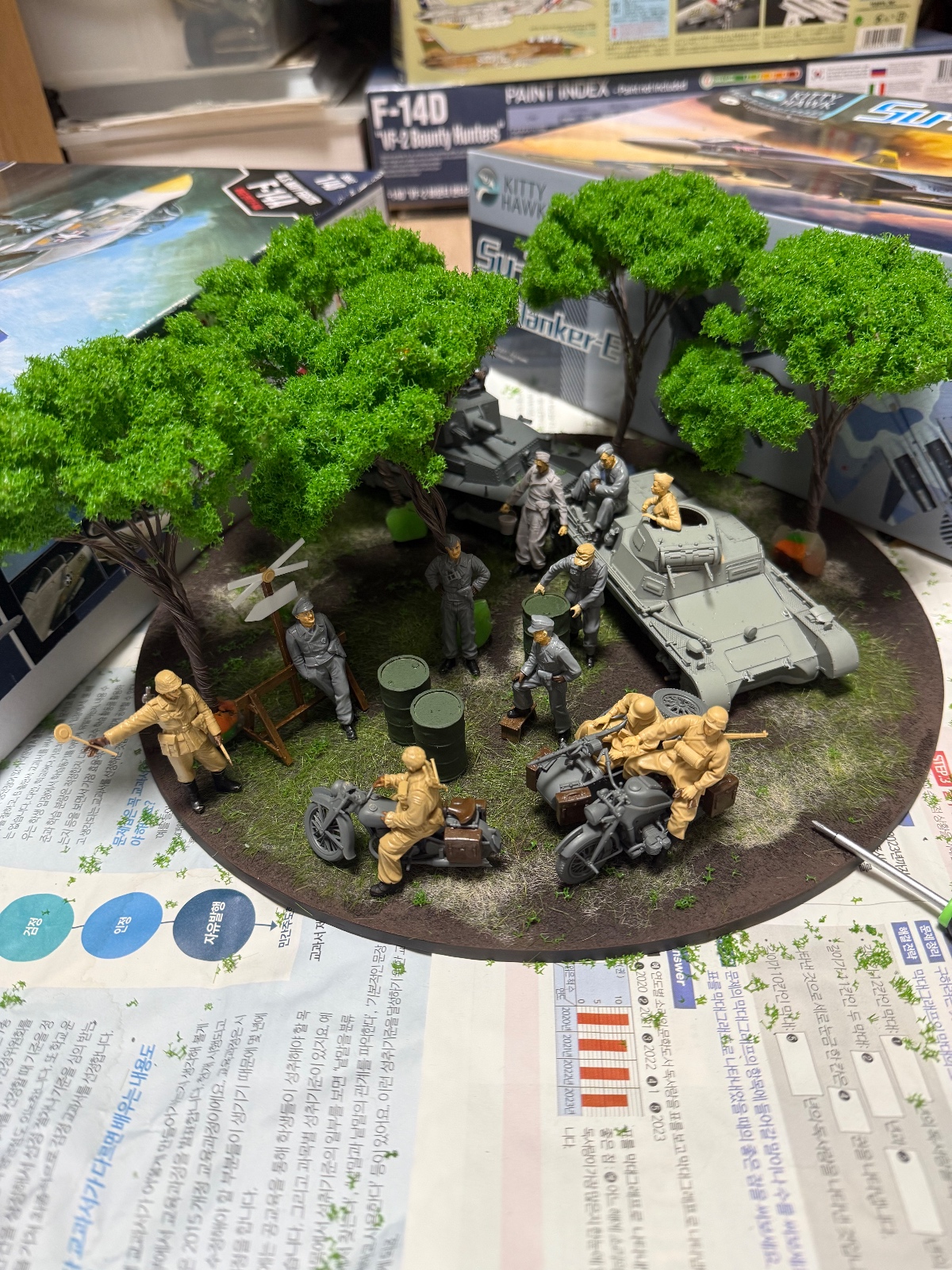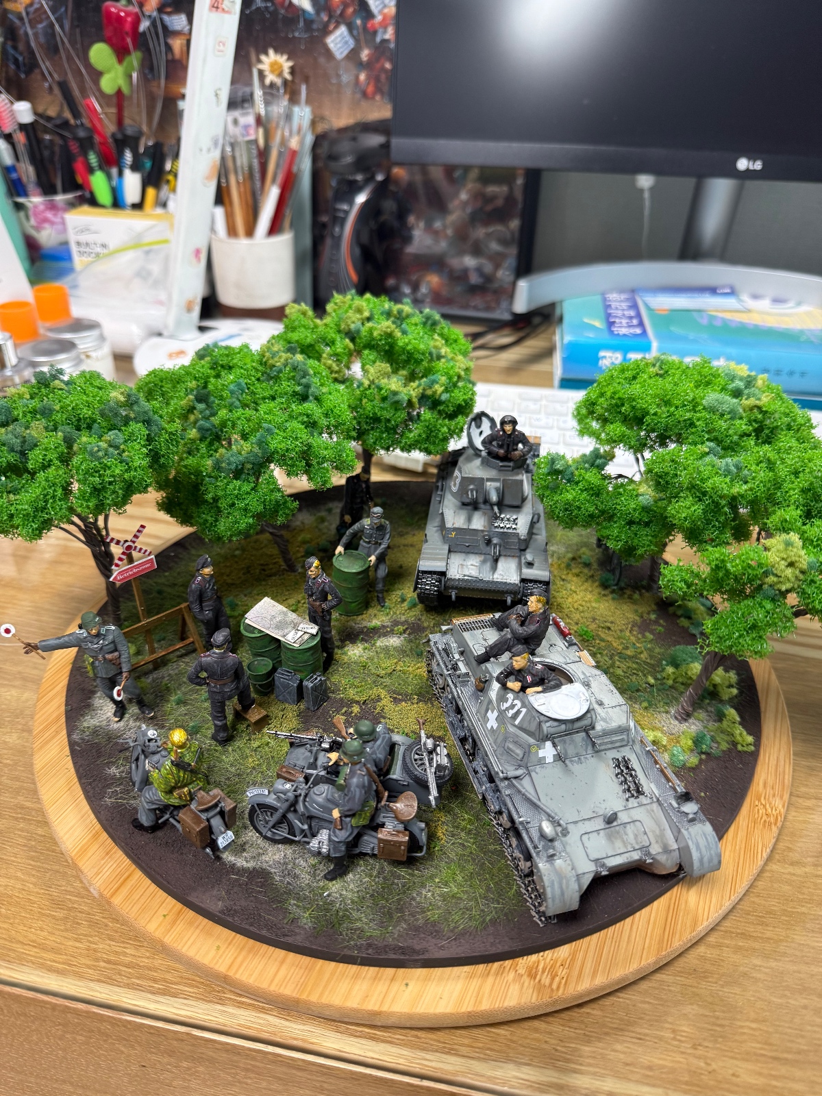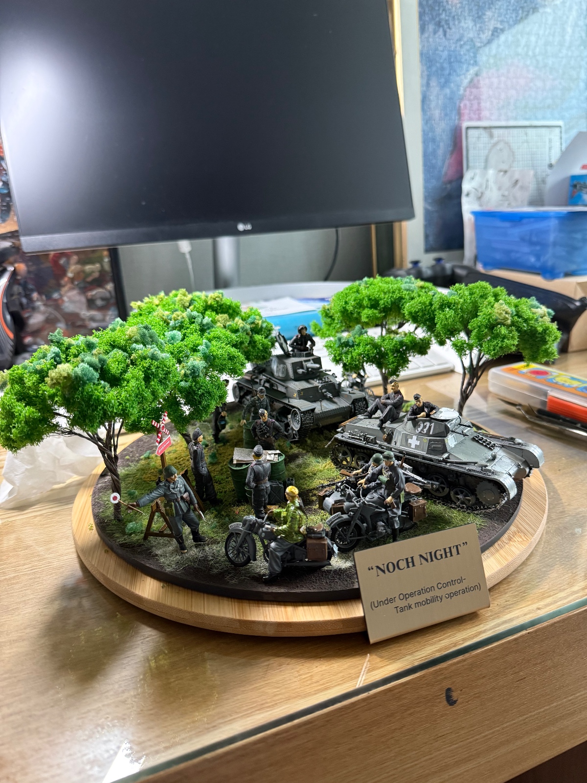 1/35 아카데미 1호전차와 35t로 작은 디오라마를 한번 만들어봤습니다 주제라기엔 머하지만 2차대전 초기 전차기동훈련전에 작전지역 통제라는 상황을 한번 상상해 보았고 그에따라 제목은 독일어로 “Not Yet” 으로 해보았습니다 여전히 실력은 부족하고 산만한 디오라마지만 자꾸자꾸 연습해보겠습니다.