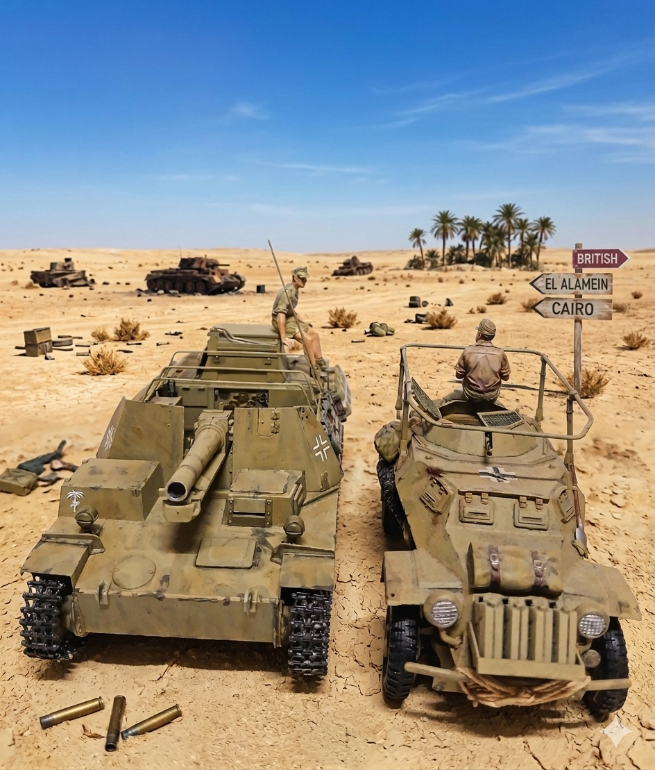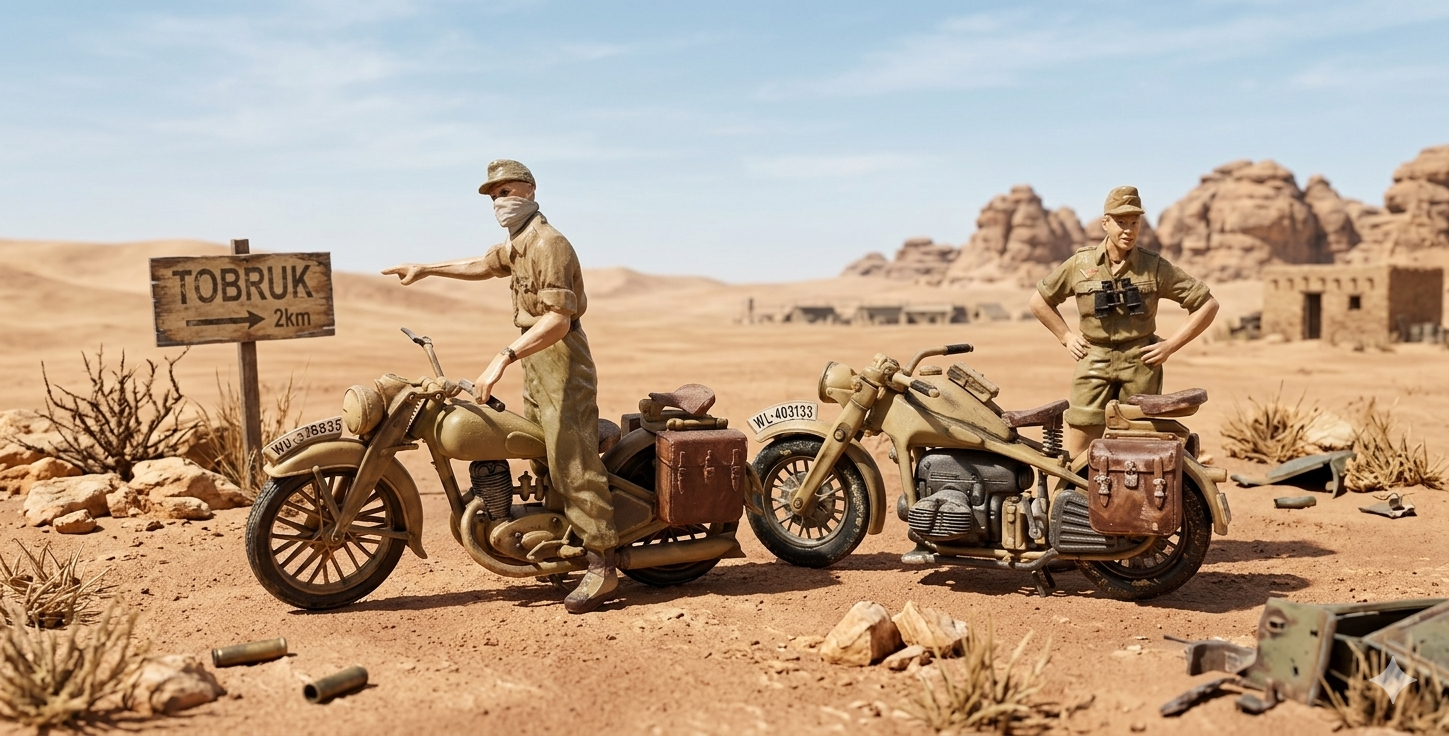 자주포, 4륜장갑차, 오토바이, 인형은 만든 것입니다. 배경만 AI
