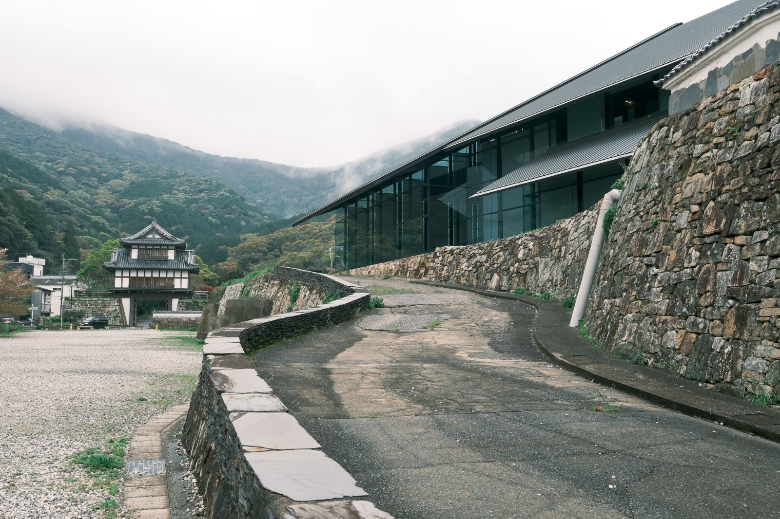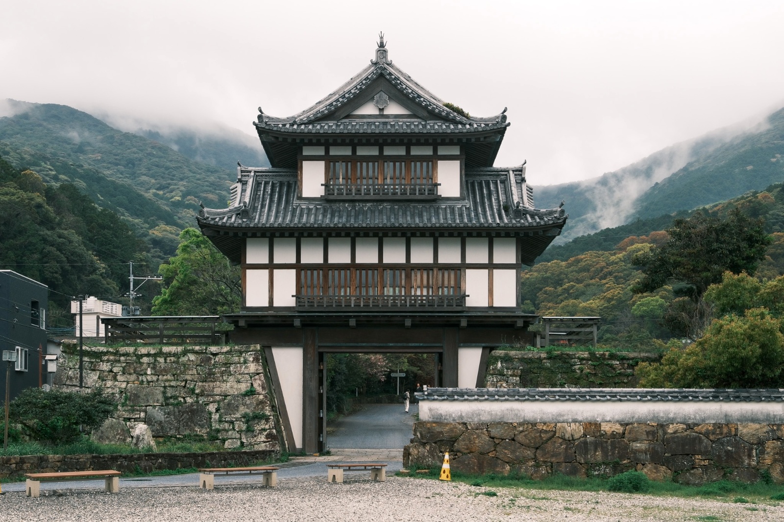 아침에 호텔 바로 앞에 있는 쓰시마 박물관과 가네이시성으로 산책을 나갔습니다. 밤새 비가 그치고 하늘은 구름에 가려 있었지만 오히려 운치있는 아침이었습니다. 이 성은 대부분 소실되었고 성터와 해자 일부만 남아 있습니다. 사실 저 문을 지나면 그 뒤는 일반 주택가입니다.