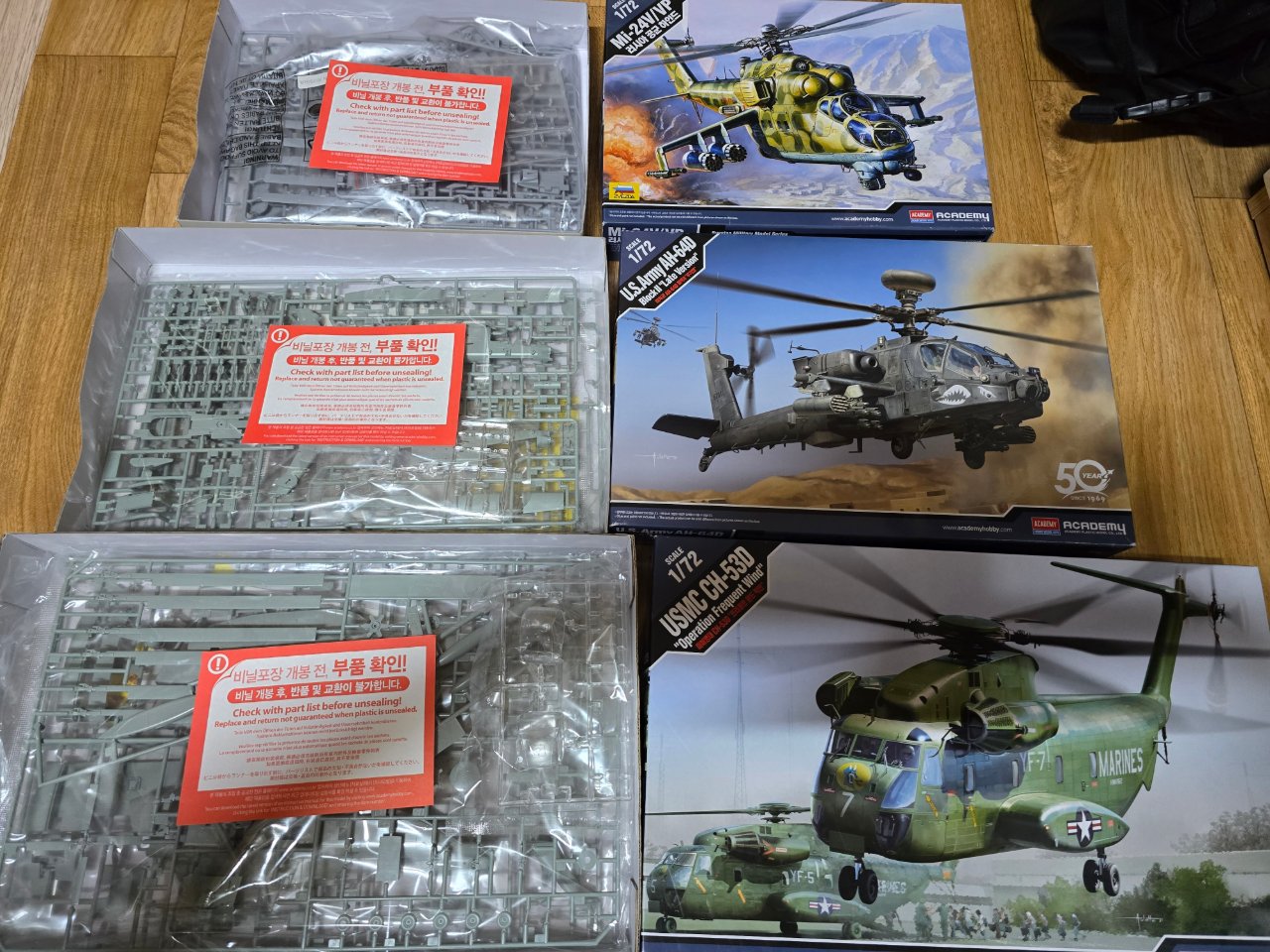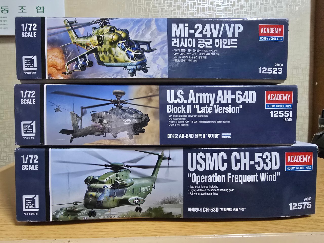 아카데미과학 1:72 AH-64D 블록2 후기형, MI-24 러시아공군 하인드, CH-53D 송료포함 35000원에 판매합니다.